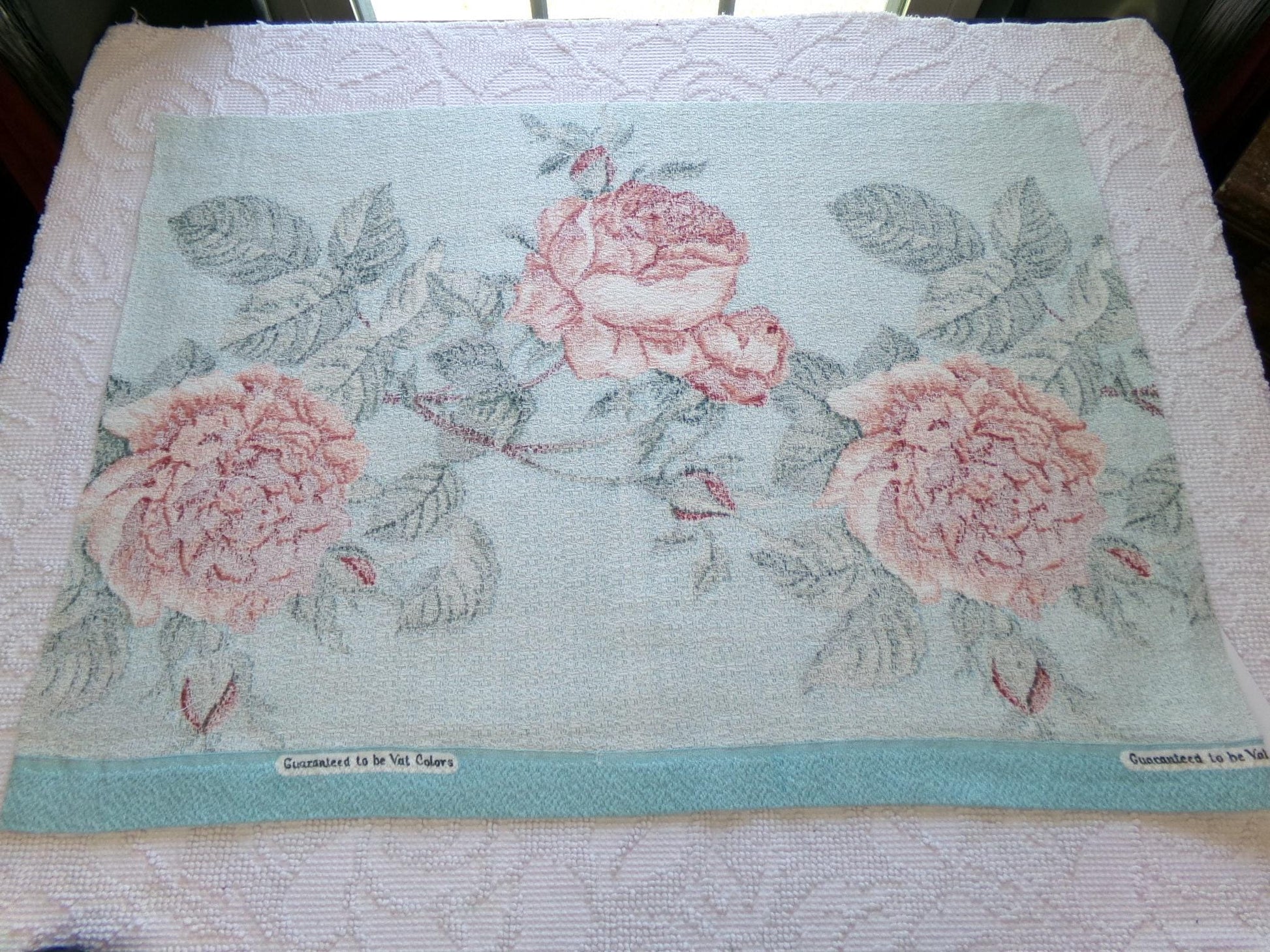 Beyond gorgeous piece of vintage barkcloth fabric reclaimed from an old drapery panel...fierce showy blooming roses adorn a beautiful background in a rich mint with seafoam undertones.Measures approx 26" x 18" inches. Because this was sourced from a deconstructed curtain panel it has an old hem, seen in imgs.
