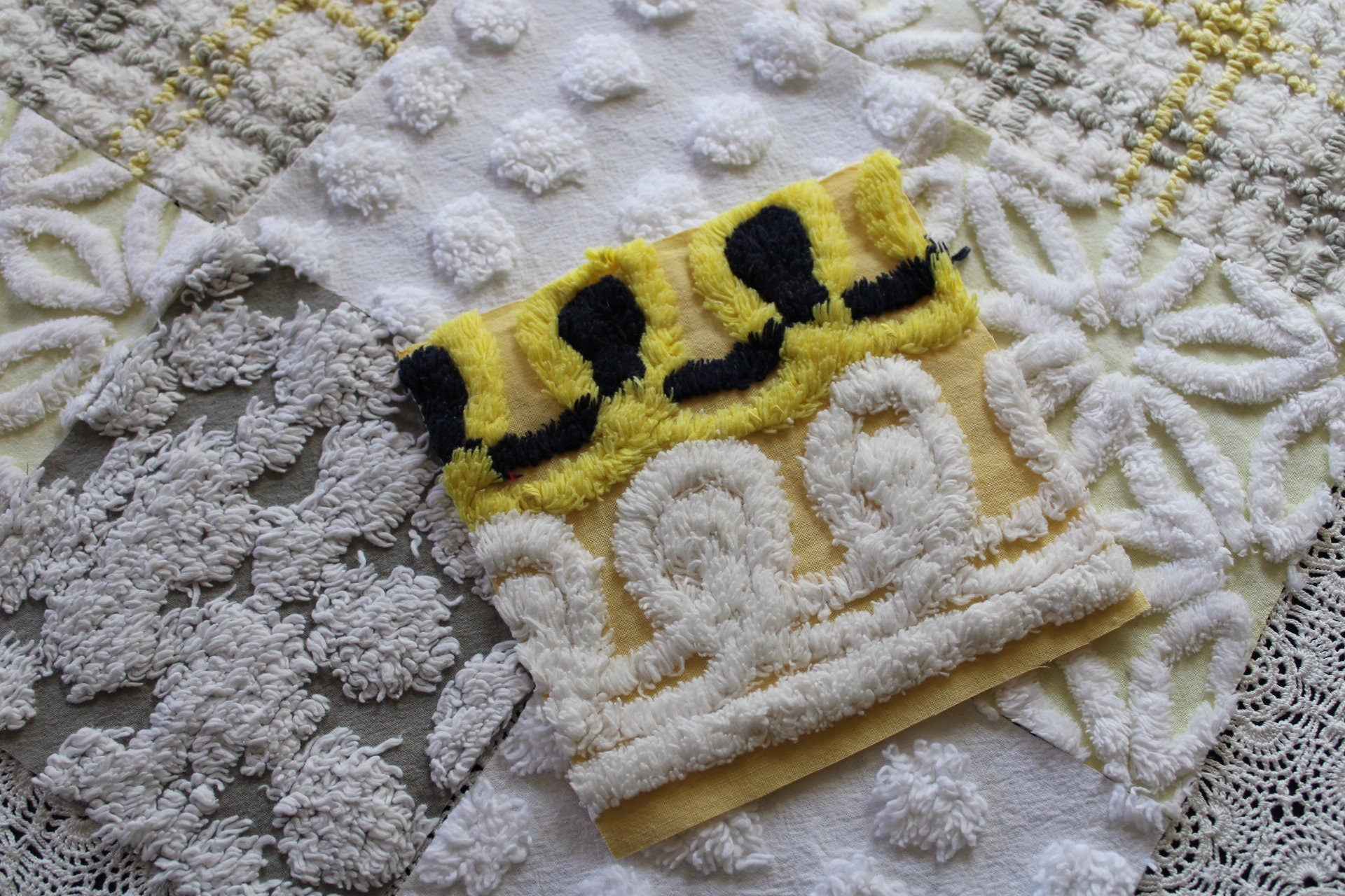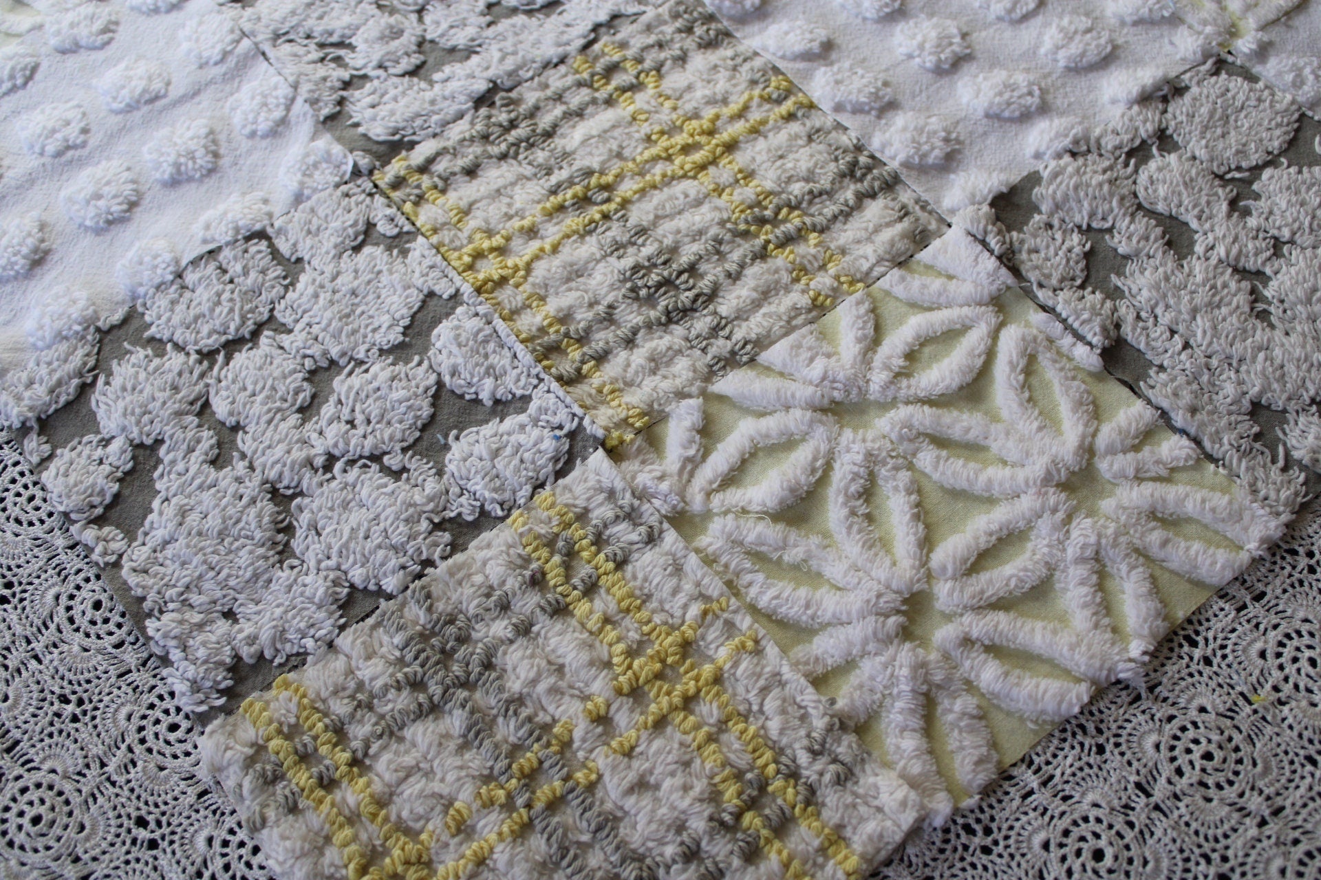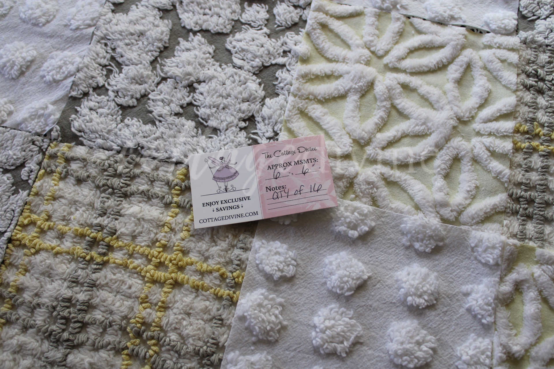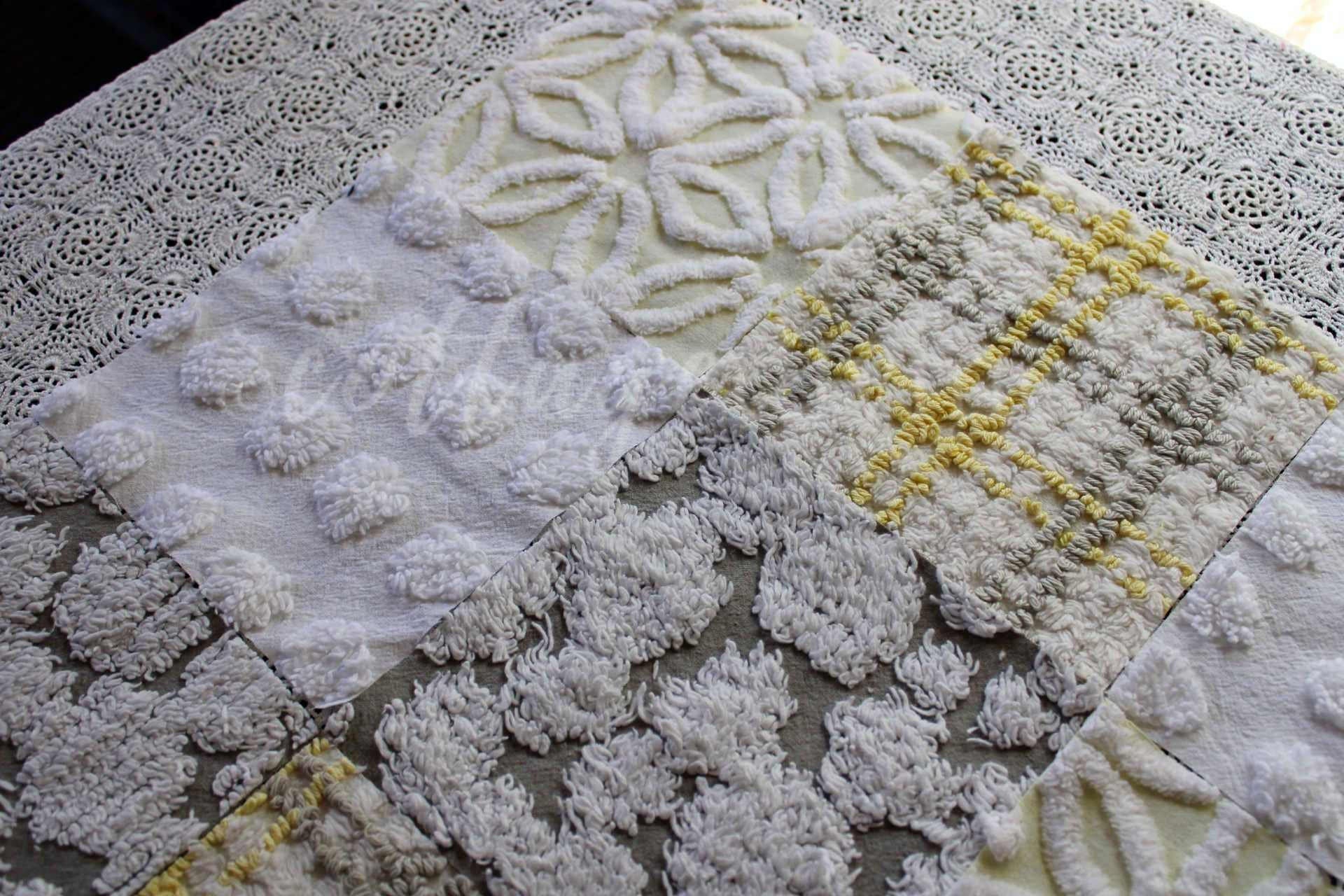 Sun & Clouds...an uplifting set of craft squares in a blend of white & grey with shades of yellow...like a cloudy day, with sunshine peeking in :)::total qty: 17 chenille fabric quilt squares