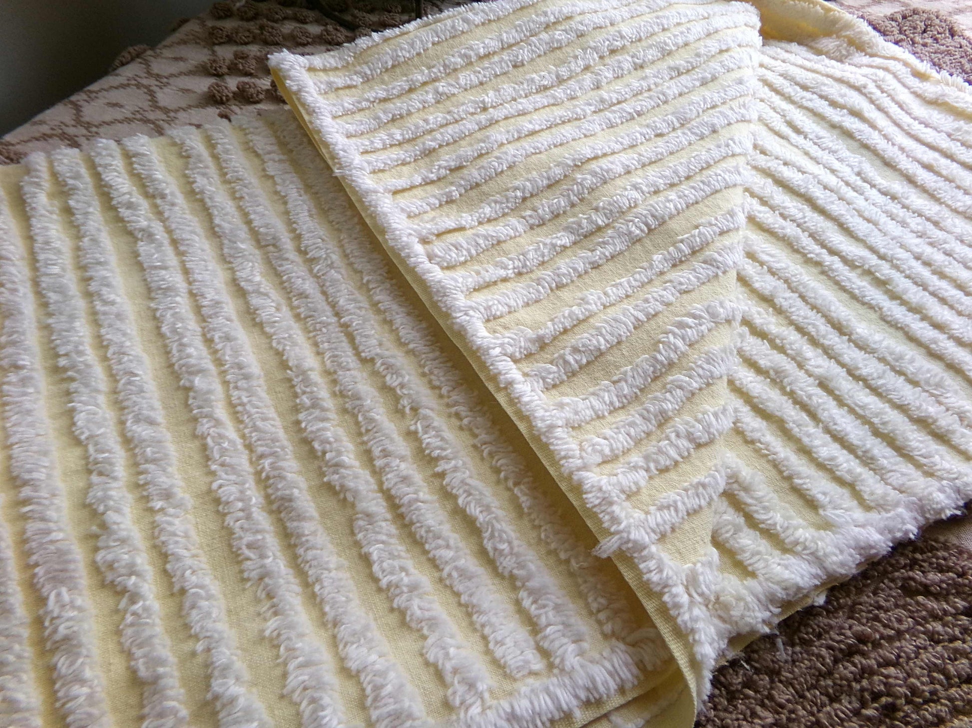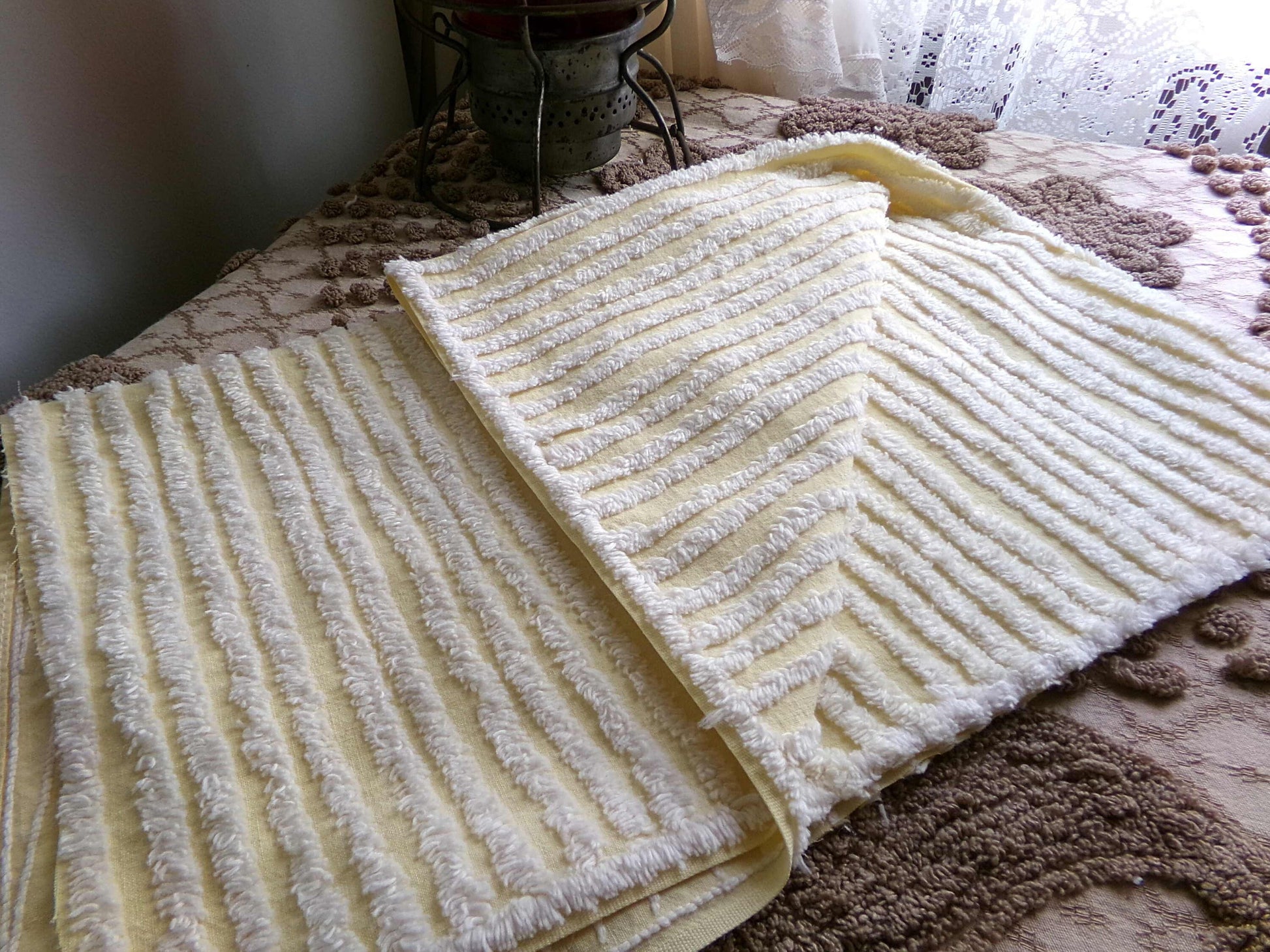 Pretty pastel buttercup yellow vintage chenille fabric with white stripes - Very nice quality & a quick way to add a pop of radiance to your project.Approx 18" x 30" inches. Ideal in DIY pillows, quilts & more. 100% mid-weight cotton. Original vintage fabric circa midcentury.