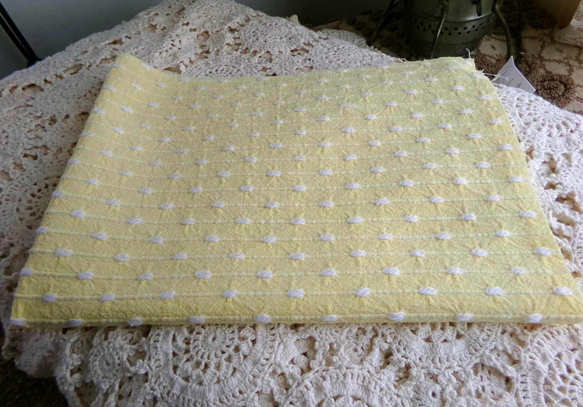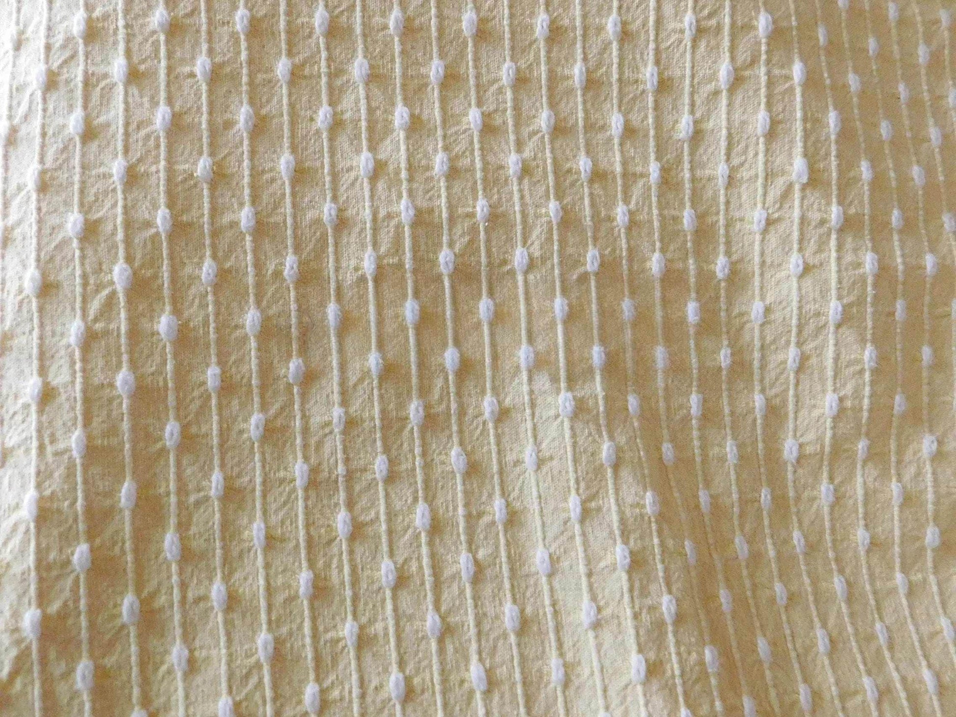 Uplift your project with this cheerful yellow vintage woven fabric piece featuring tiny chenille pearl "rain drop" tufts. A retro vintage Bates design that has long been a popular favorite in handmade quilts for the gentle texture it adds.Measures approx 20" x 14" inches. Very lightweight fabric that is easy to sew and craft with.