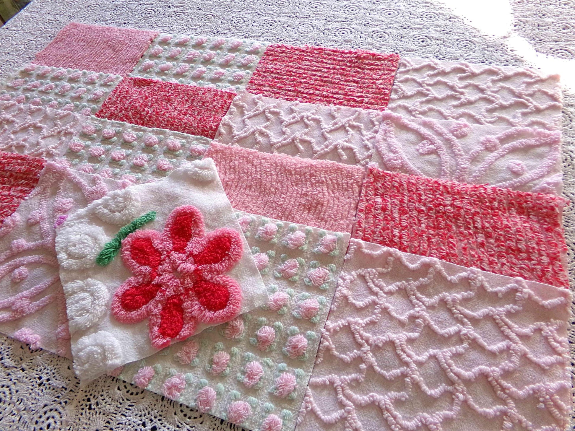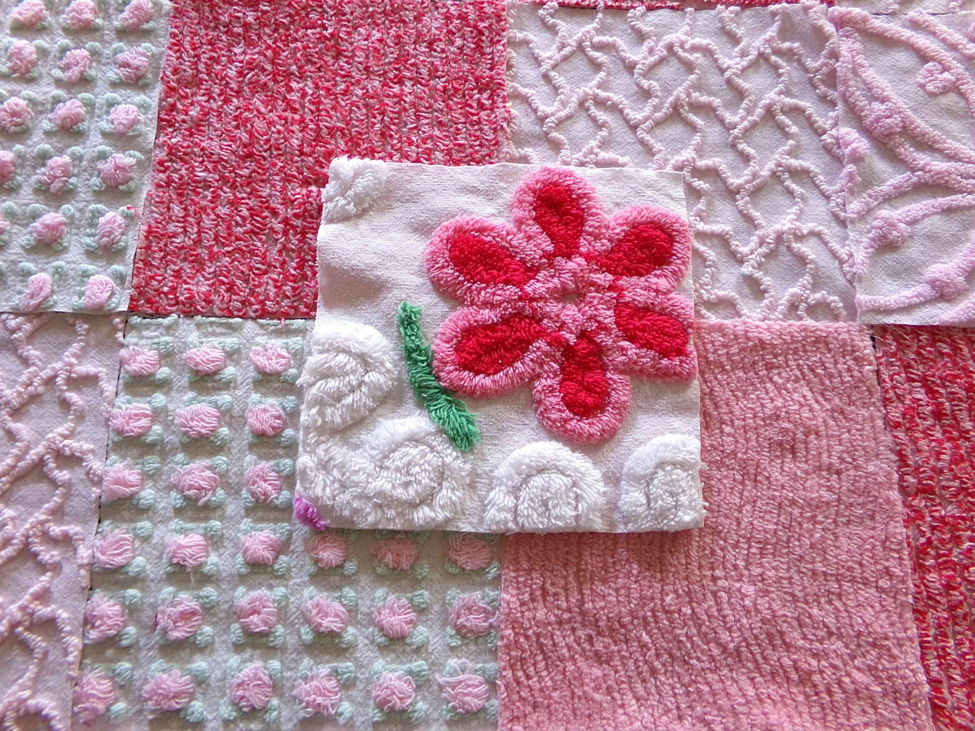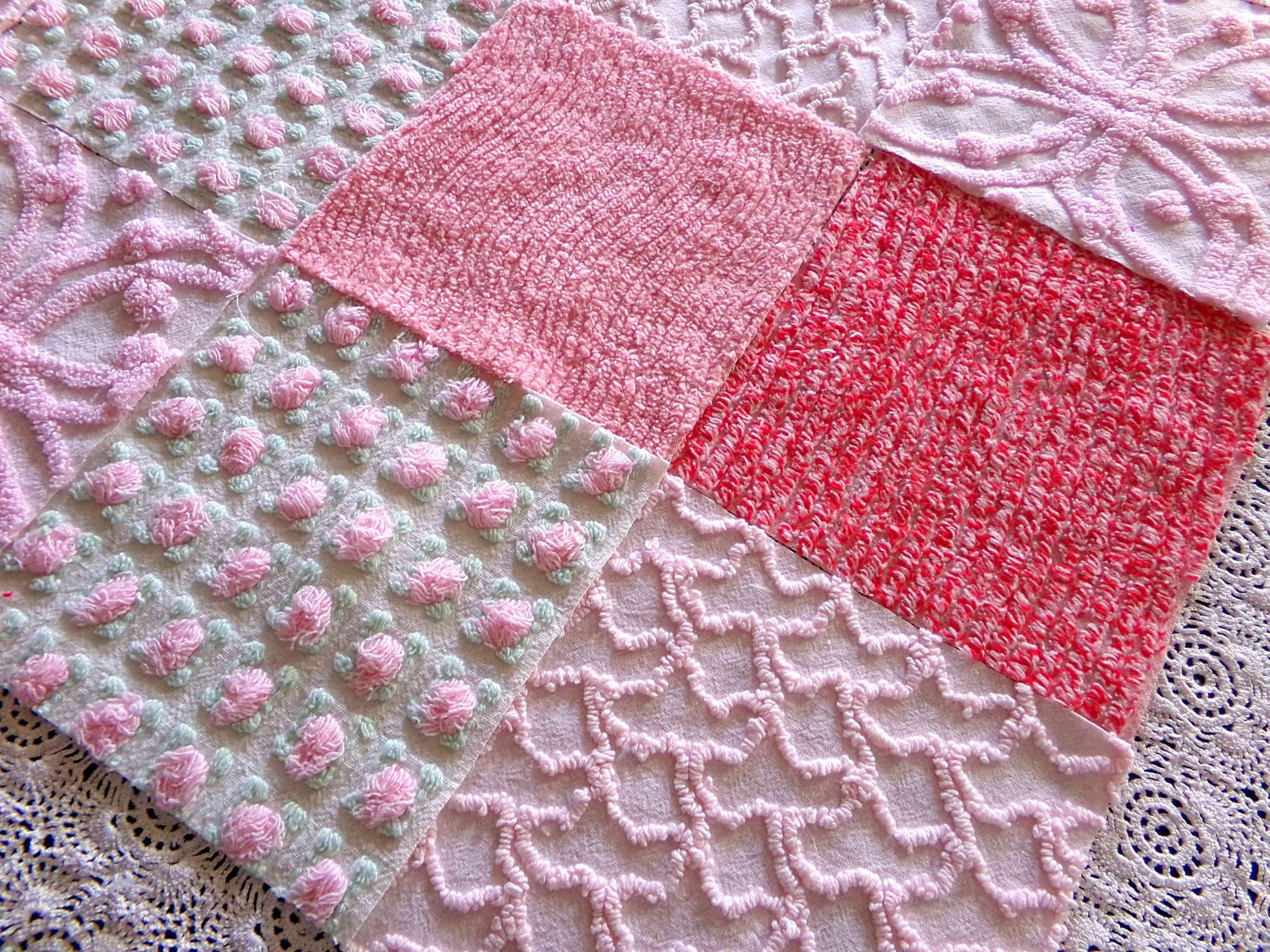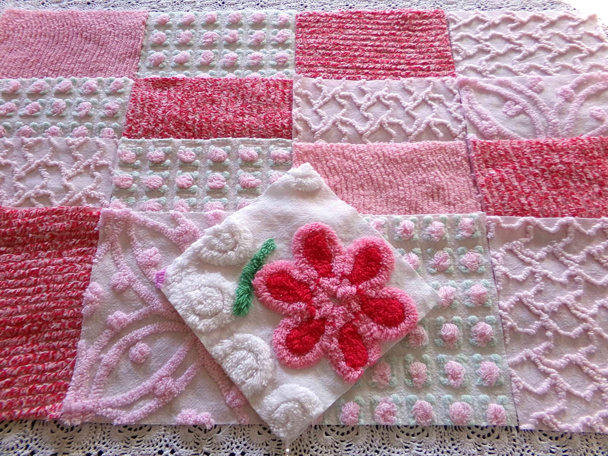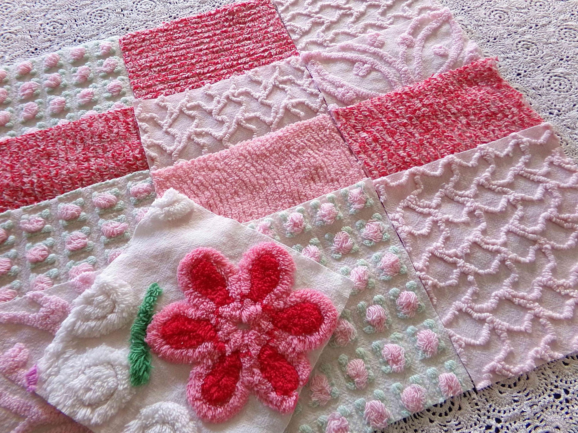 This is a selection of 17 vintage chenille fabric squares in "Sweet Kisses" shades emphasizing pink and red. Includes a cute pink flower square too.This assorted premium mix includes a great range of textures from squiggles and rosebuds to soft lightweight stripes.