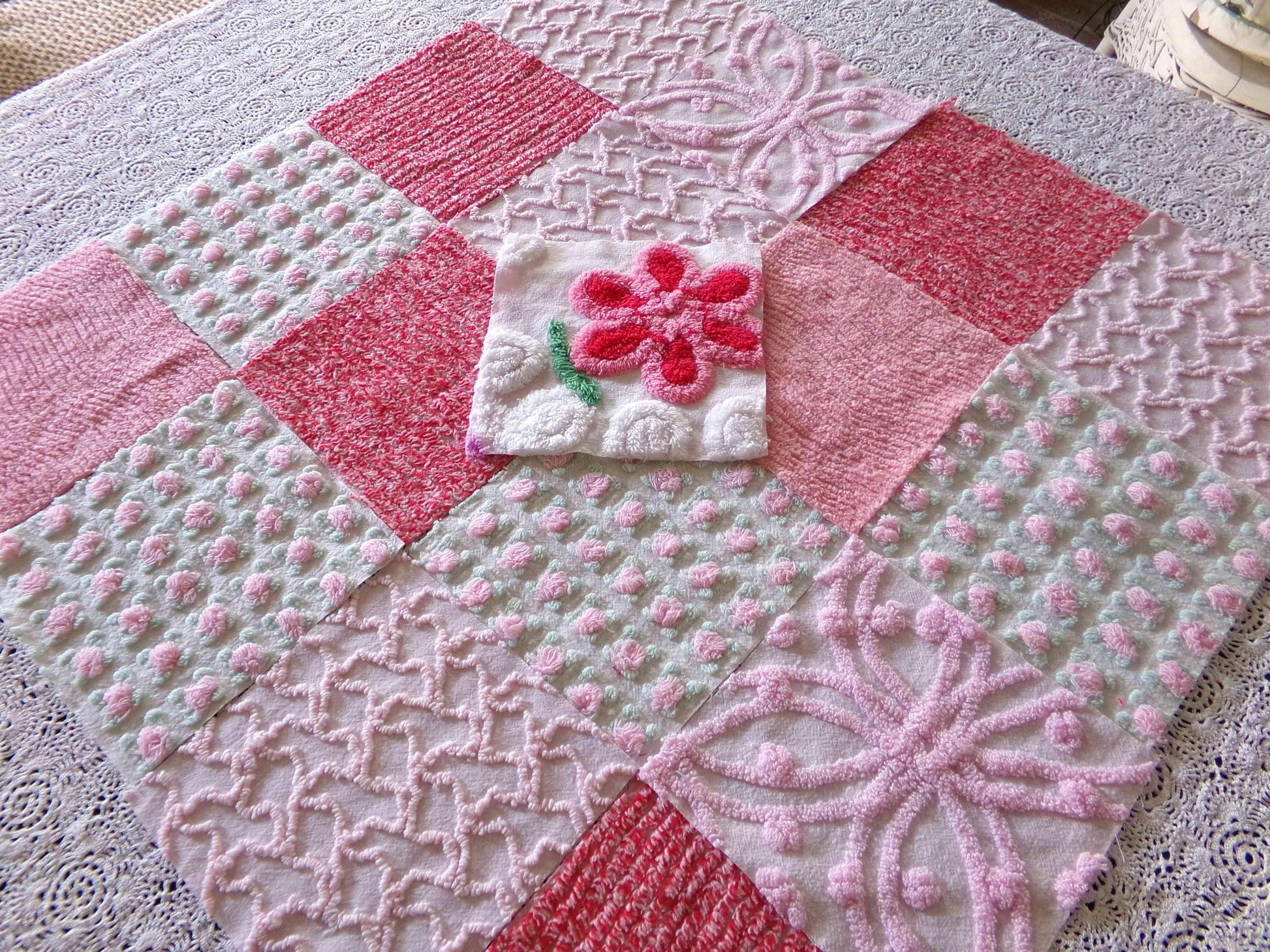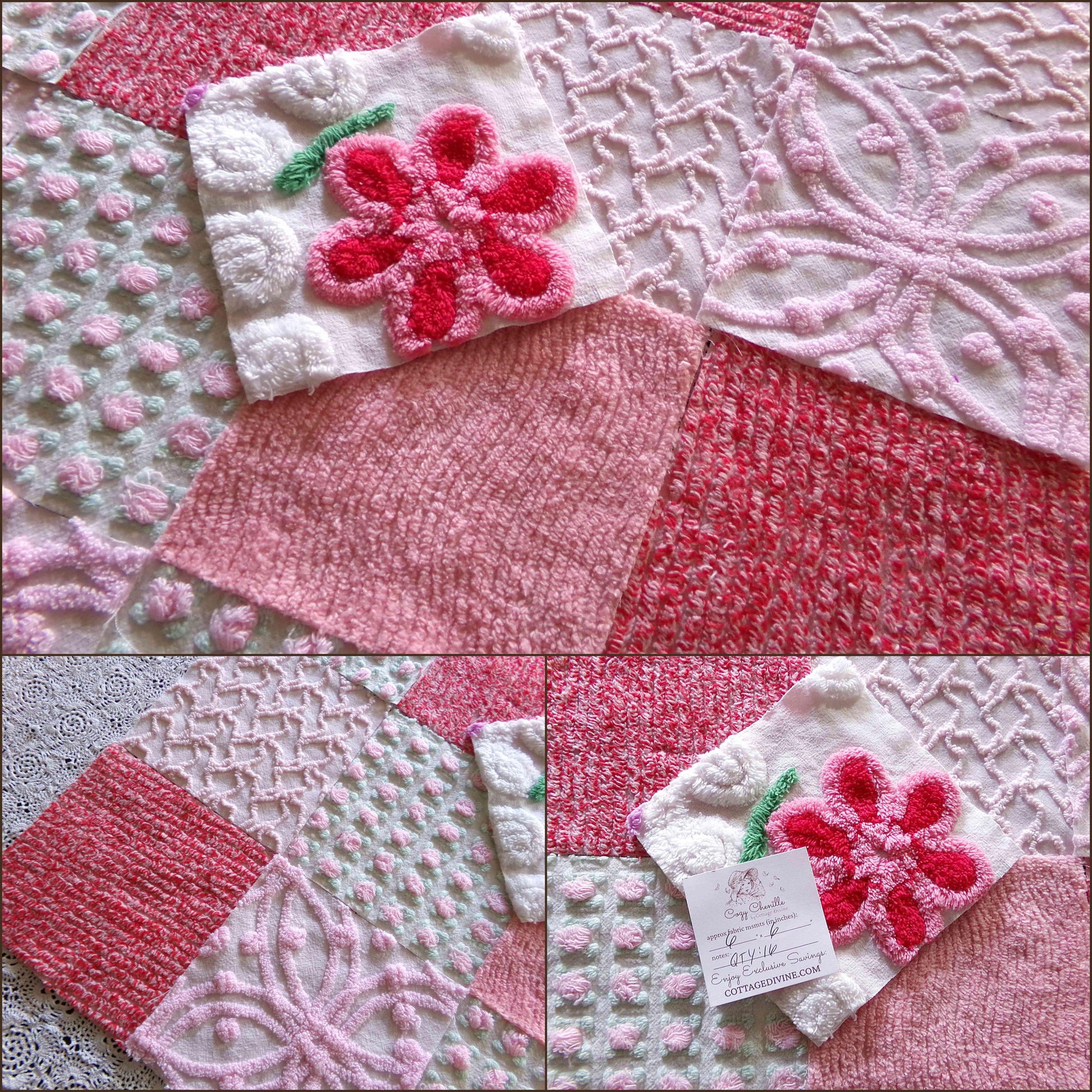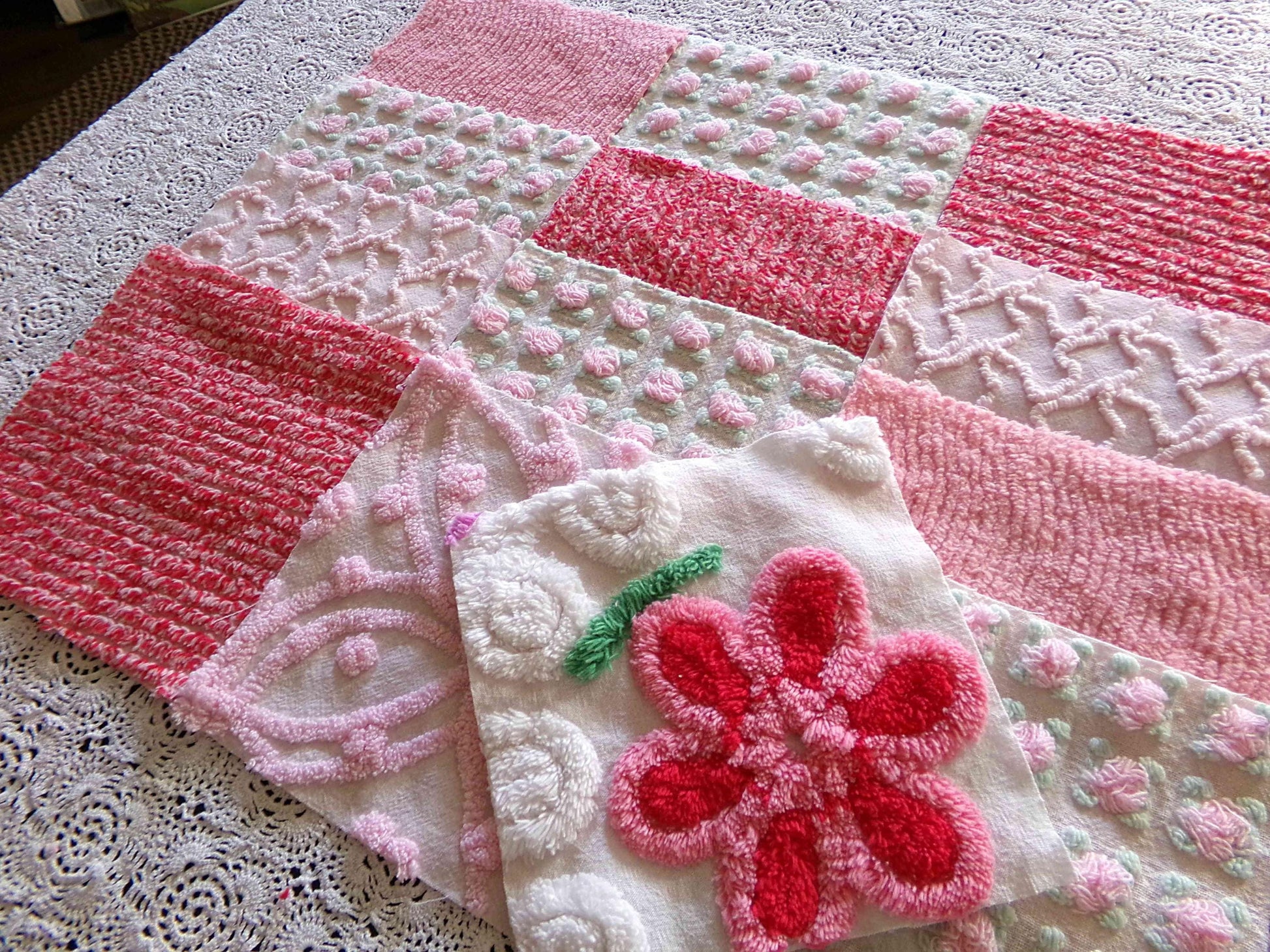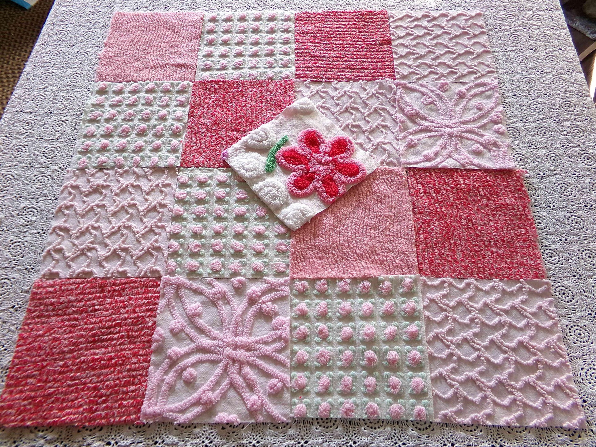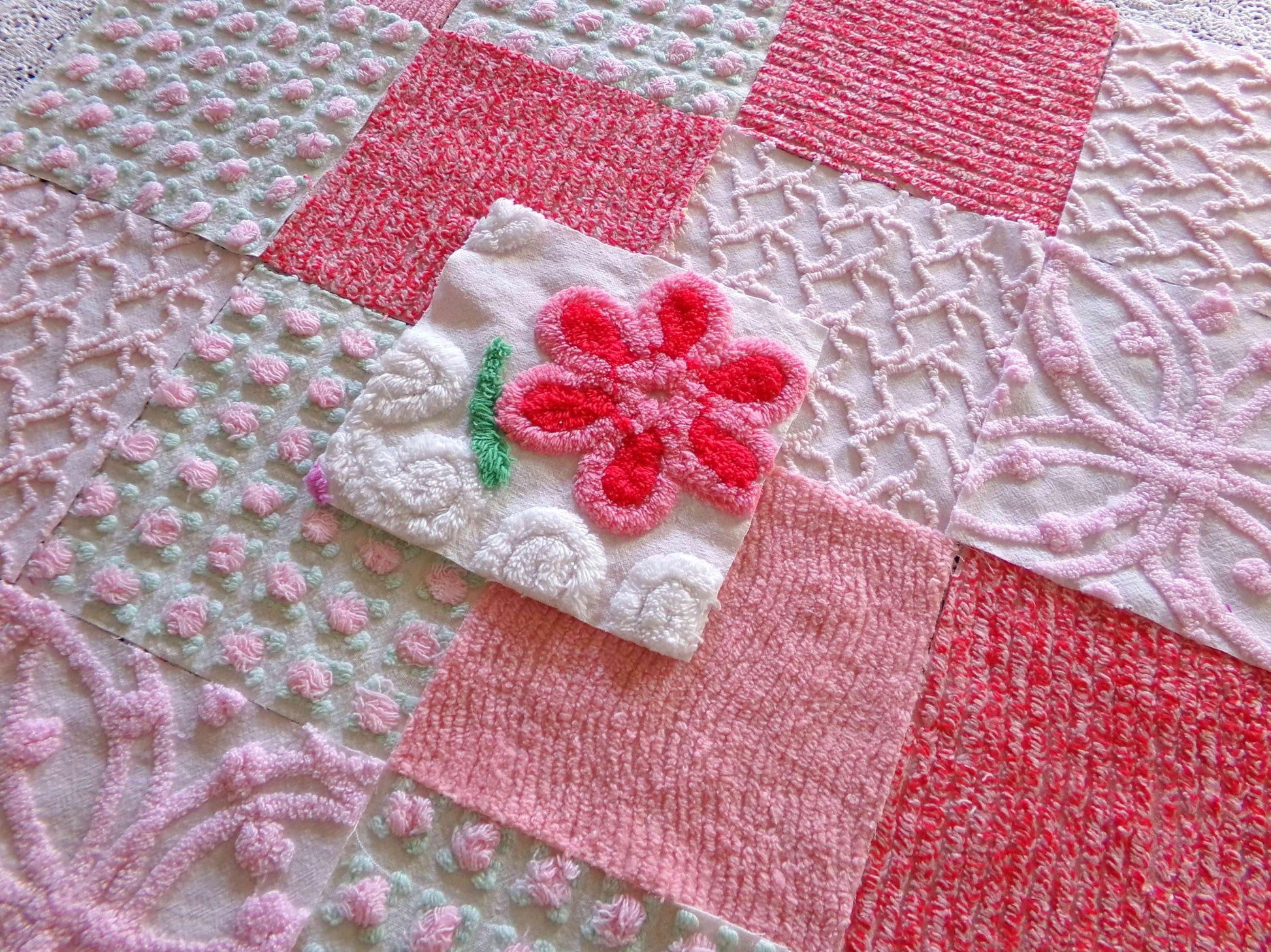 This is a selection of 17 vintage chenille fabric squares in "Sweet Kisses" shades emphasizing pink and red. Includes a cute pink flower square too.This assorted premium mix includes a great range of textures from squiggles and rosebuds to soft lightweight stripes.