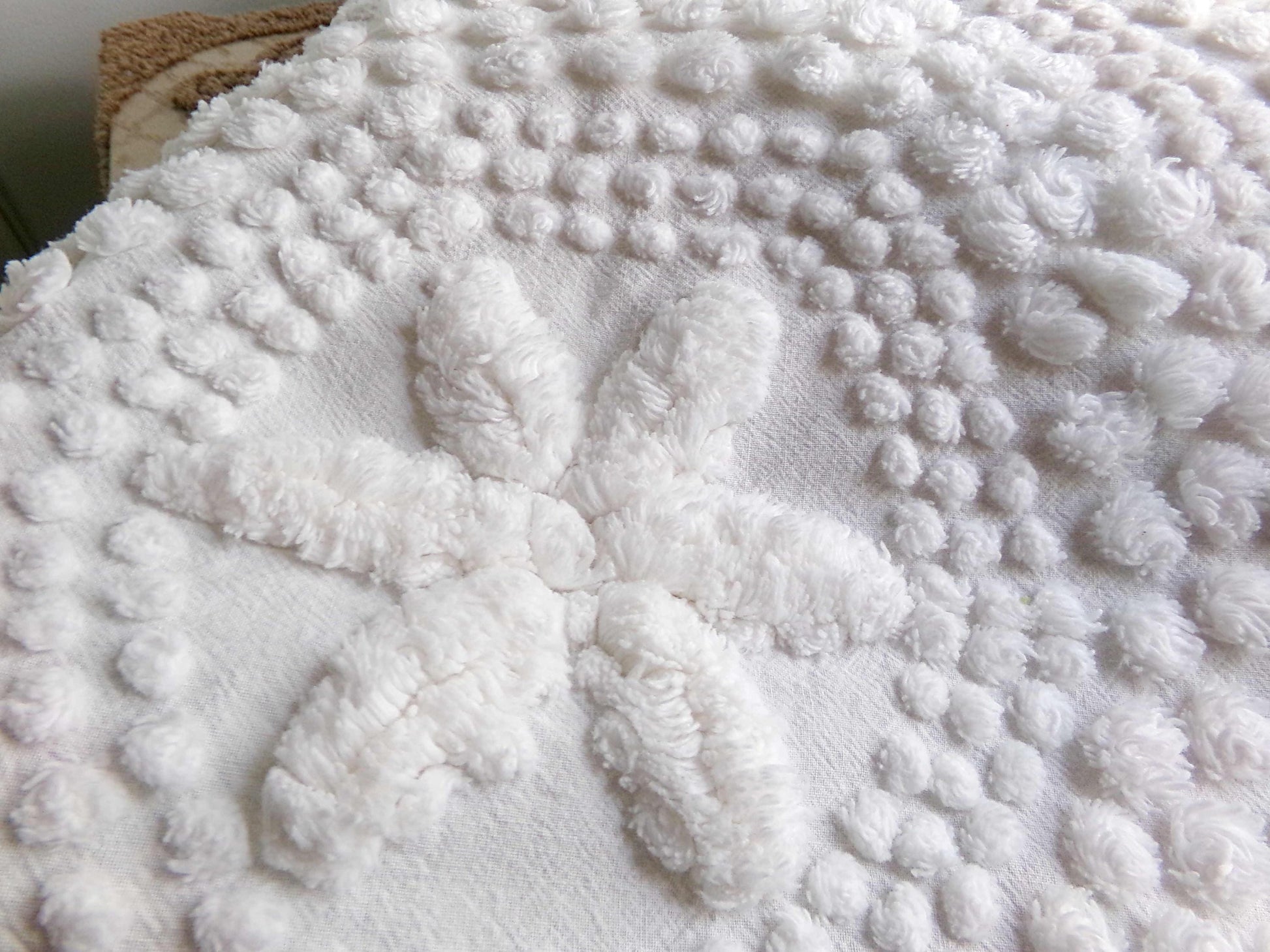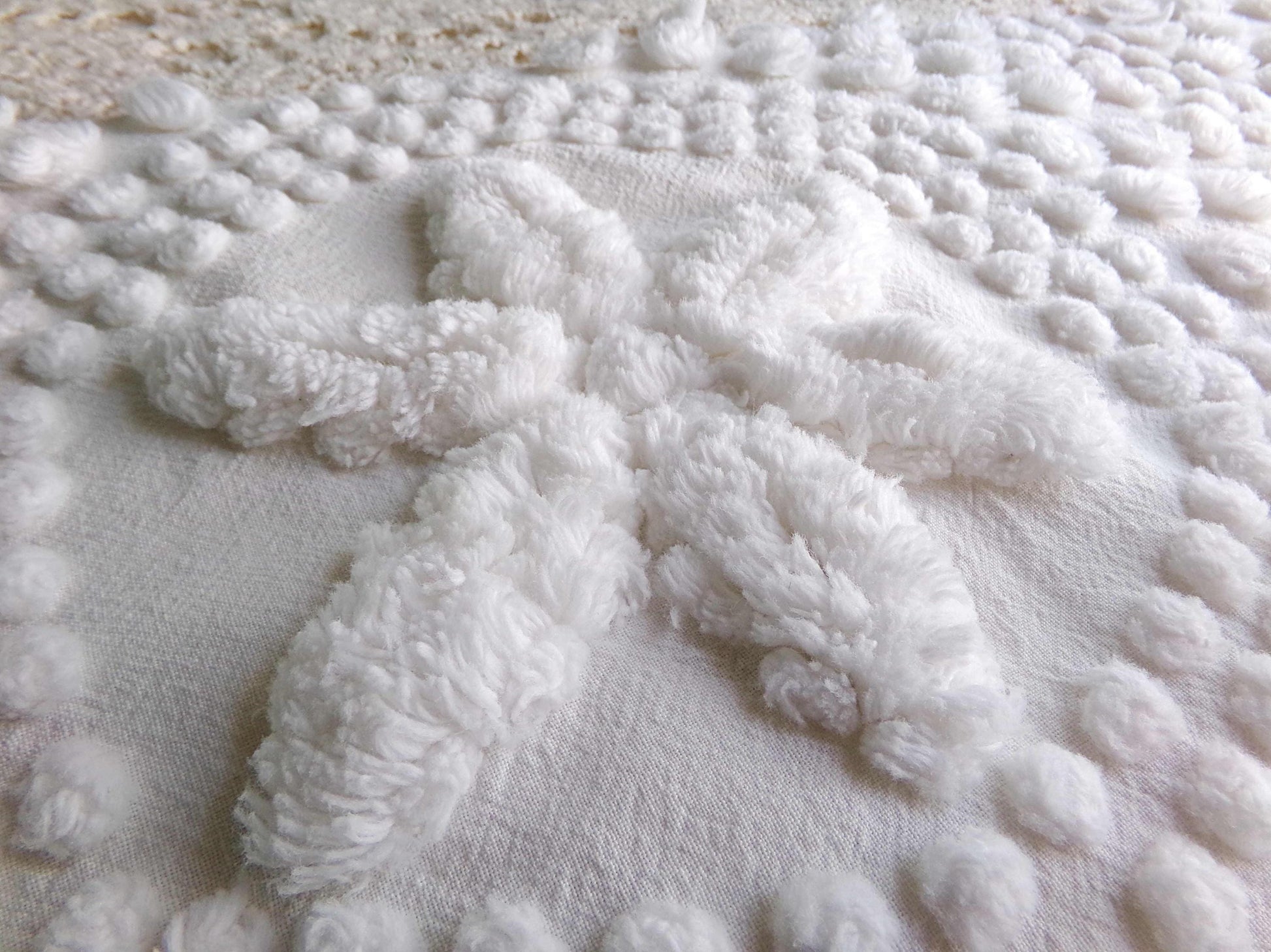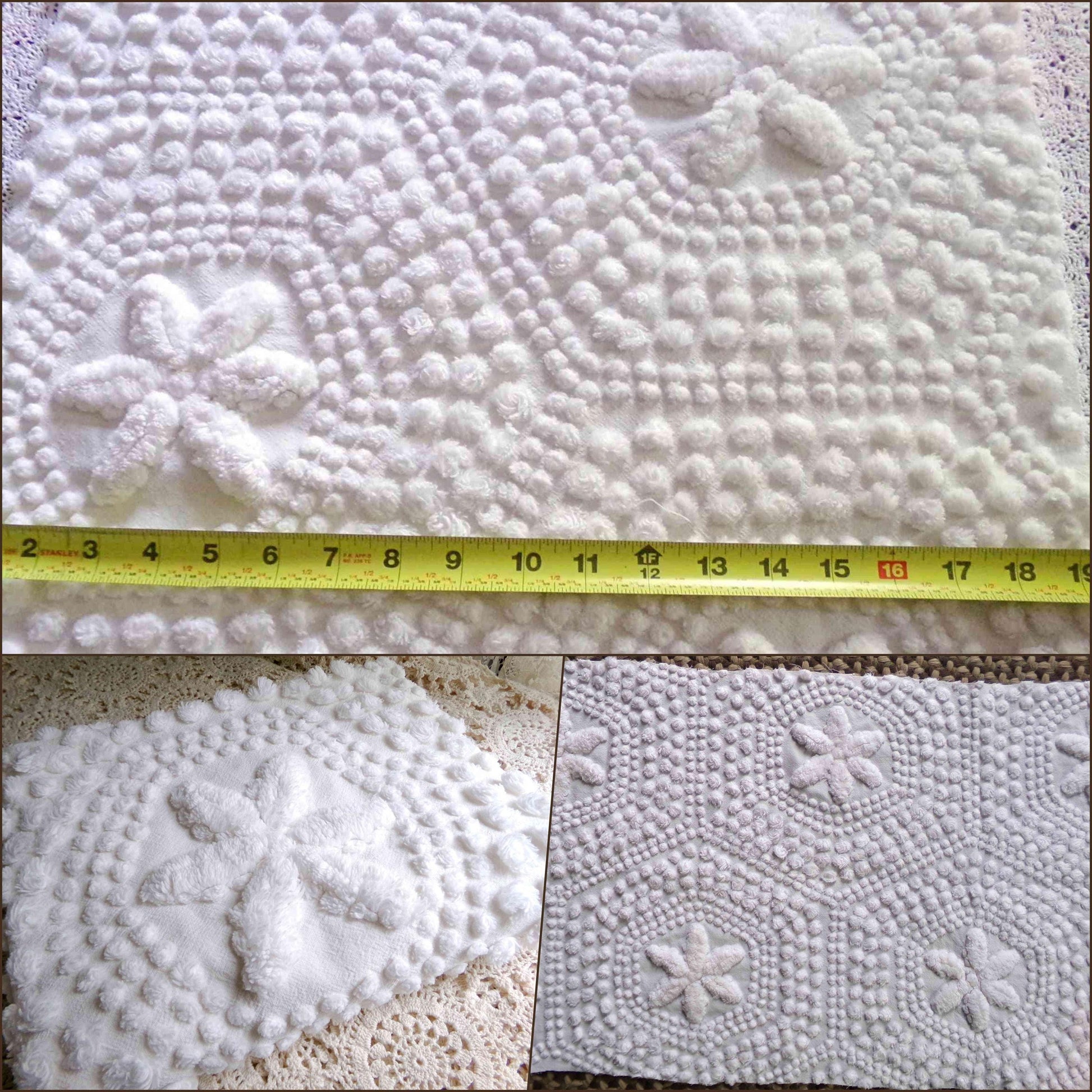 This piece of 28" x 18"-inch vintage chenille fabric features a rare, handtufted 3D star design. Intricately tufted raised flowers are nested within dense pops in a radiating pattern.A true antique heirloom treasure to inspire or enhance your next project. This memorable design is popular in handmade chenille quilts and in coastal style DIY pillows.