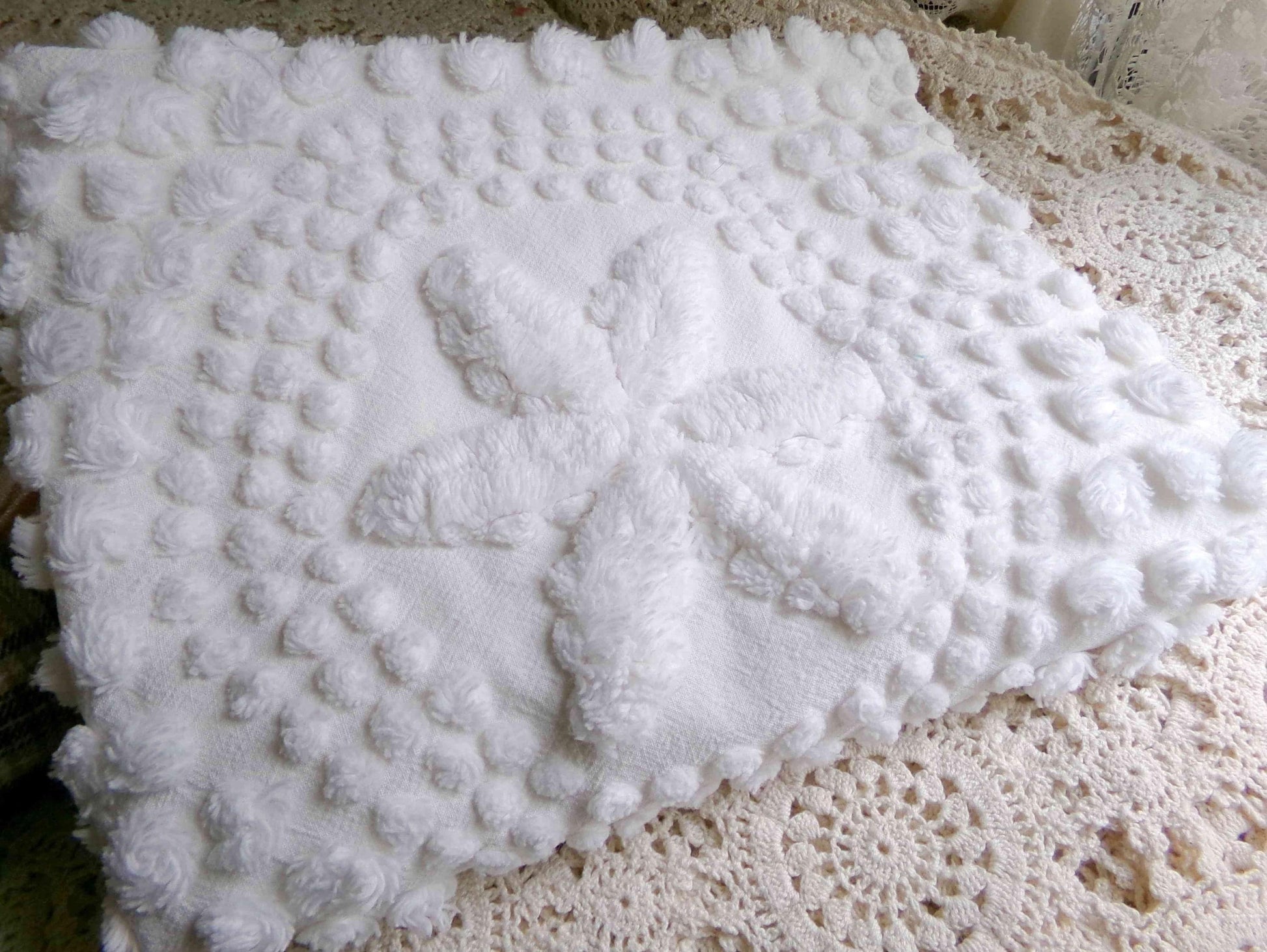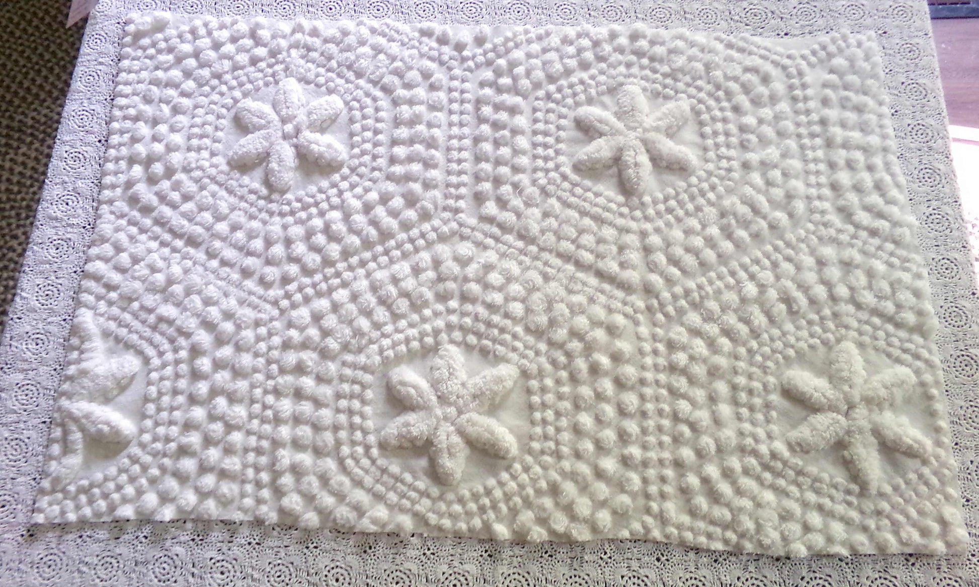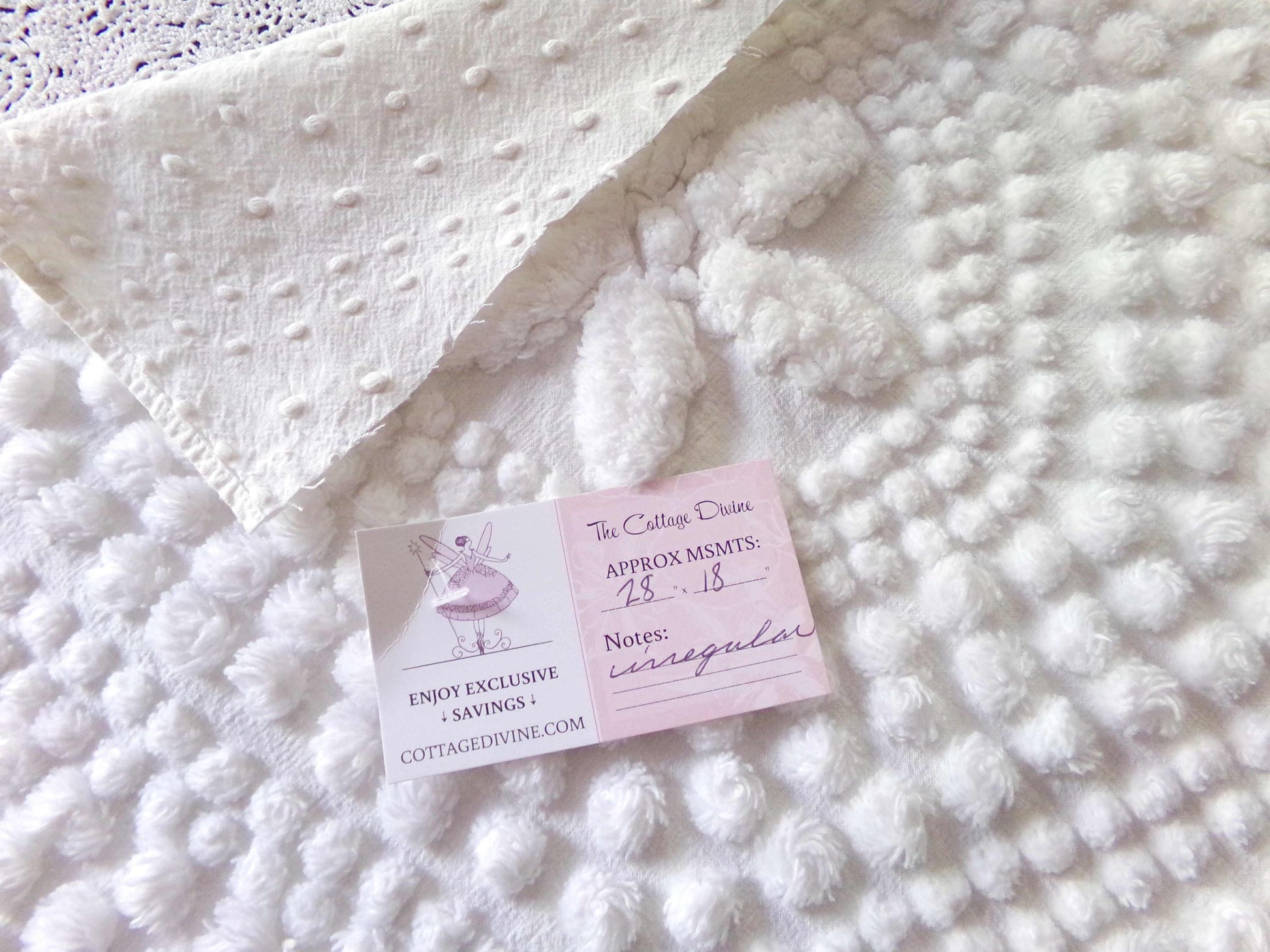 This piece of 28" x 18"-inch vintage chenille fabric features a rare, handtufted 3D star design. Intricately tufted raised flowers are nested within dense pops in a radiating pattern.A true antique heirloom treasure to inspire or enhance your next project. This memorable design is popular in handmade chenille quilts and in coastal style DIY pillows.