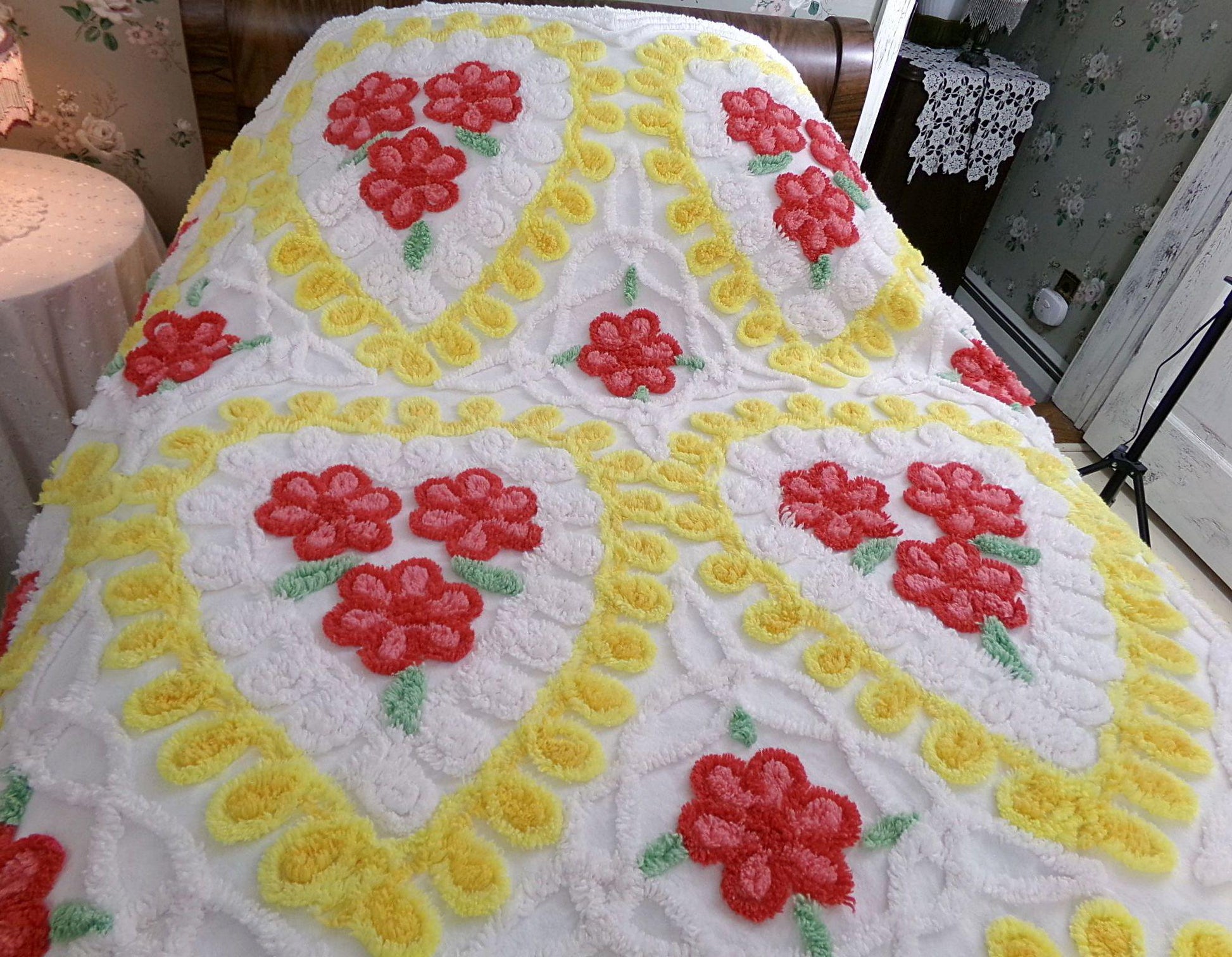An enchanting treasure to uplift your bedroom, this vintage chenille bedspread is adorned with sweet hearts wrapping around trios of vibrant flowers that evoke a sense of midcentury romance. This beautiful piece features a delightful color palette that infuses the perfect blend of retro charm and whimsy to any space.SIZING: Standard Full/Double bed size. Photographed on a high Twin bed. Approx 90"W x 100"L. Softly rounded bottom corners. 100% quality vintage cotton with soft tufting*To see this bedspread staged on a Twin, Full or Queen bed, or if you'd like any specific photos, just let us know.
