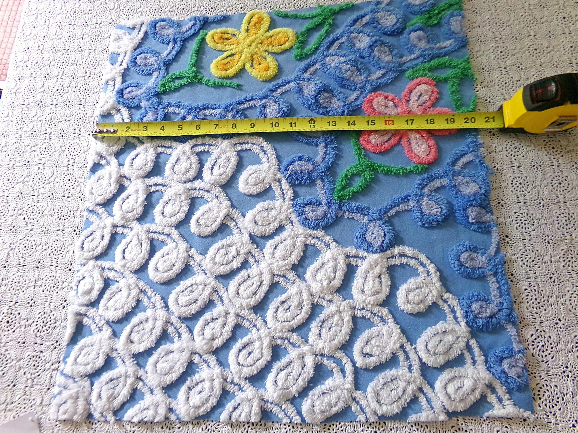 Beautiful smaller piece of vintage chenille fabric in a splashy blue tropical teardrop pattern with lots of curlicues and two cute flowers, one lemon yellow & the other hot pink.Measures about 20" x 21" inches. 100% cotton; easy to sew with. *Always treat vintage red fabrics with caution & care to avoid unintentional color run when laundering. Protect your precious project by testing first!