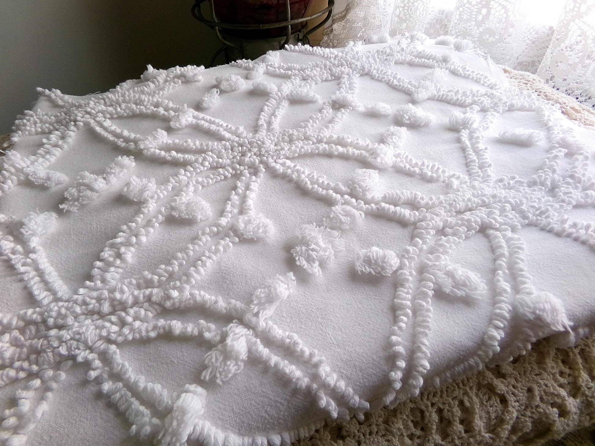 A popular classic, this versatile 20" x 25" inch white chenille fabric piece can incorporate effortlessly into just about any design concept. Traditional white wedding ring & pop design.100% lightweight cotton; a Cabin Crafts design. Popular uses include chenille patchwork quilts, DIY pillows & more. Common to the design, you may notice some minor pulls to needletufting or small pinholes.