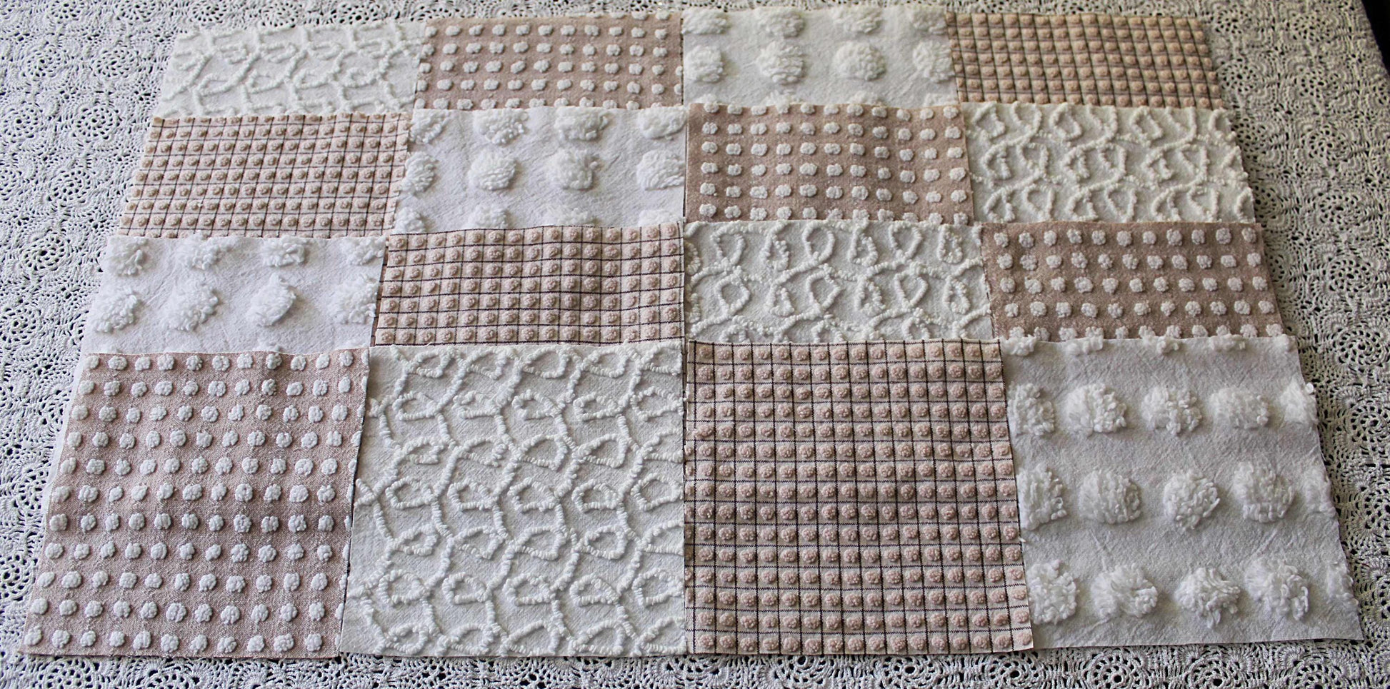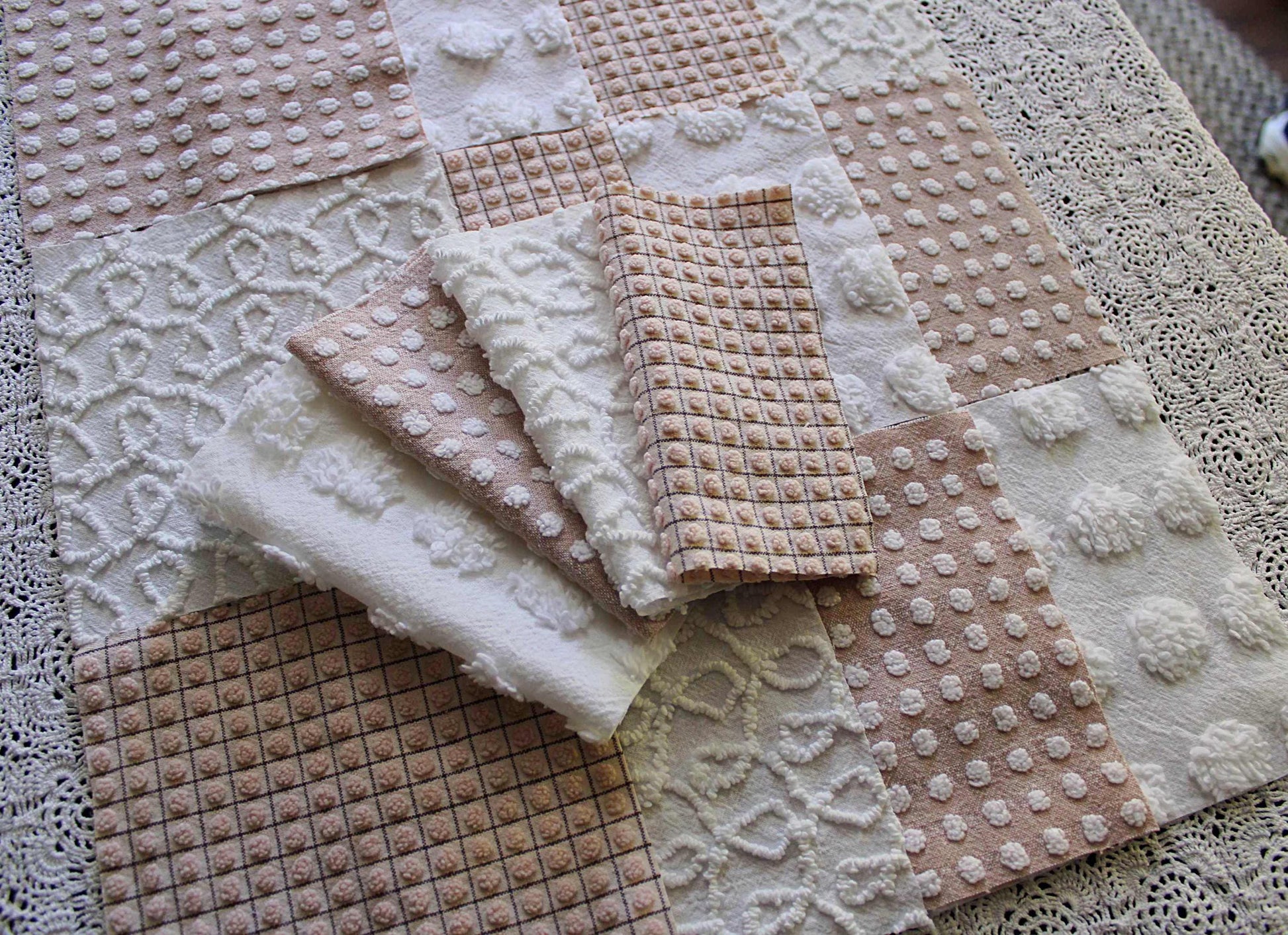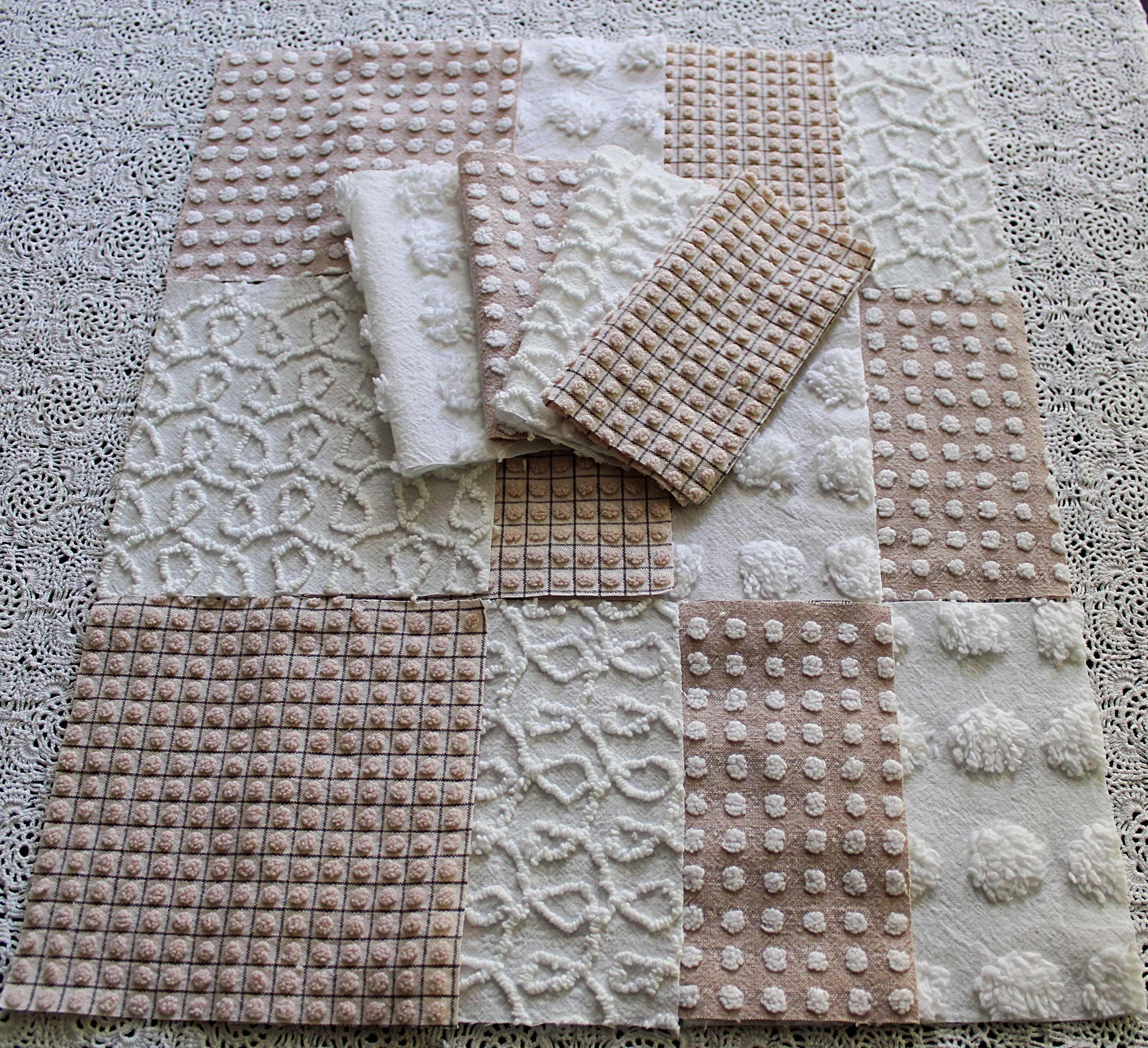 Trendy Neutrals... Vintage meets modern in this selection of chenille fabric craft squares in shades of white and café au lait. Nice, lightweight well-texturized fabric blocks - easy to sew & craft with.Includes 4 of each pattern: white coin dot, white loop squiggle, café au lait pops with chocolate grid lines, cappuccino & white dots. A great set to inspire or enhance your creative design.