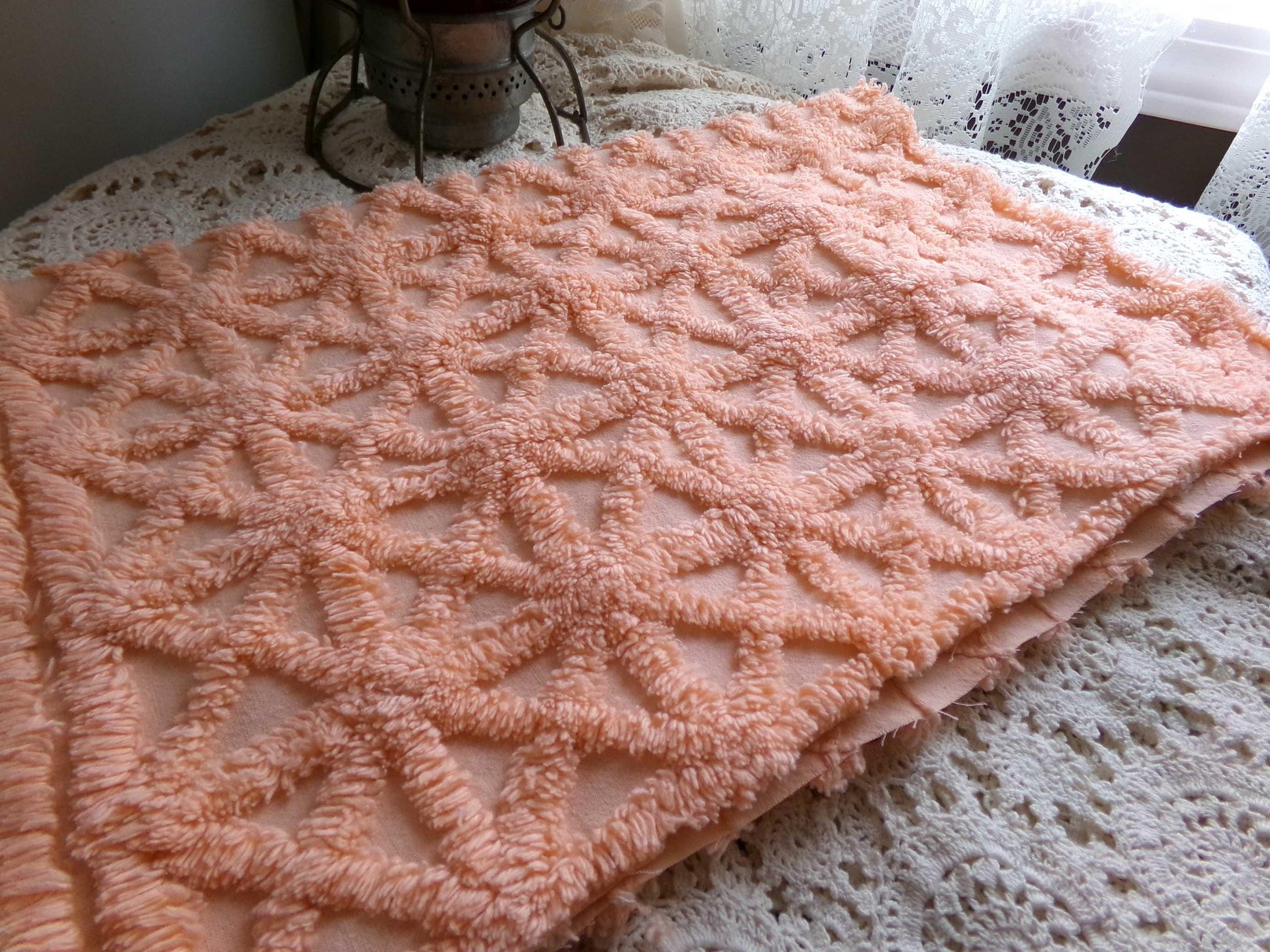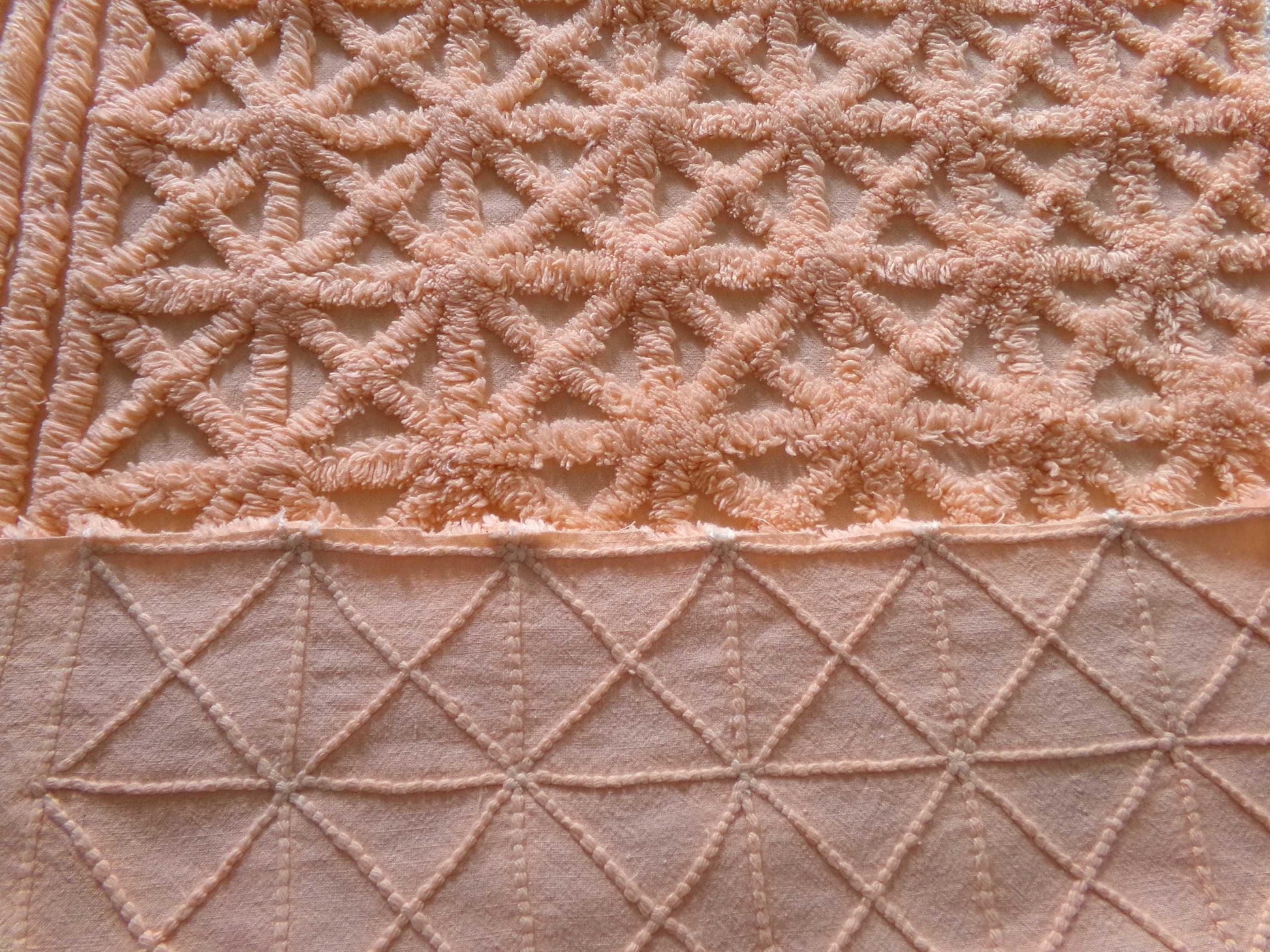 This lovely chenille fabric is a great way to infuse a warm, radiant essence into your creative design. In a gorgeous peach glow color, it features a rare pattern of tufted starbursts.Approx 19" x 23". 100% cotton, heavier weight fabric. Circa midcentury 1950s era in what was a very popular colorway at the time.