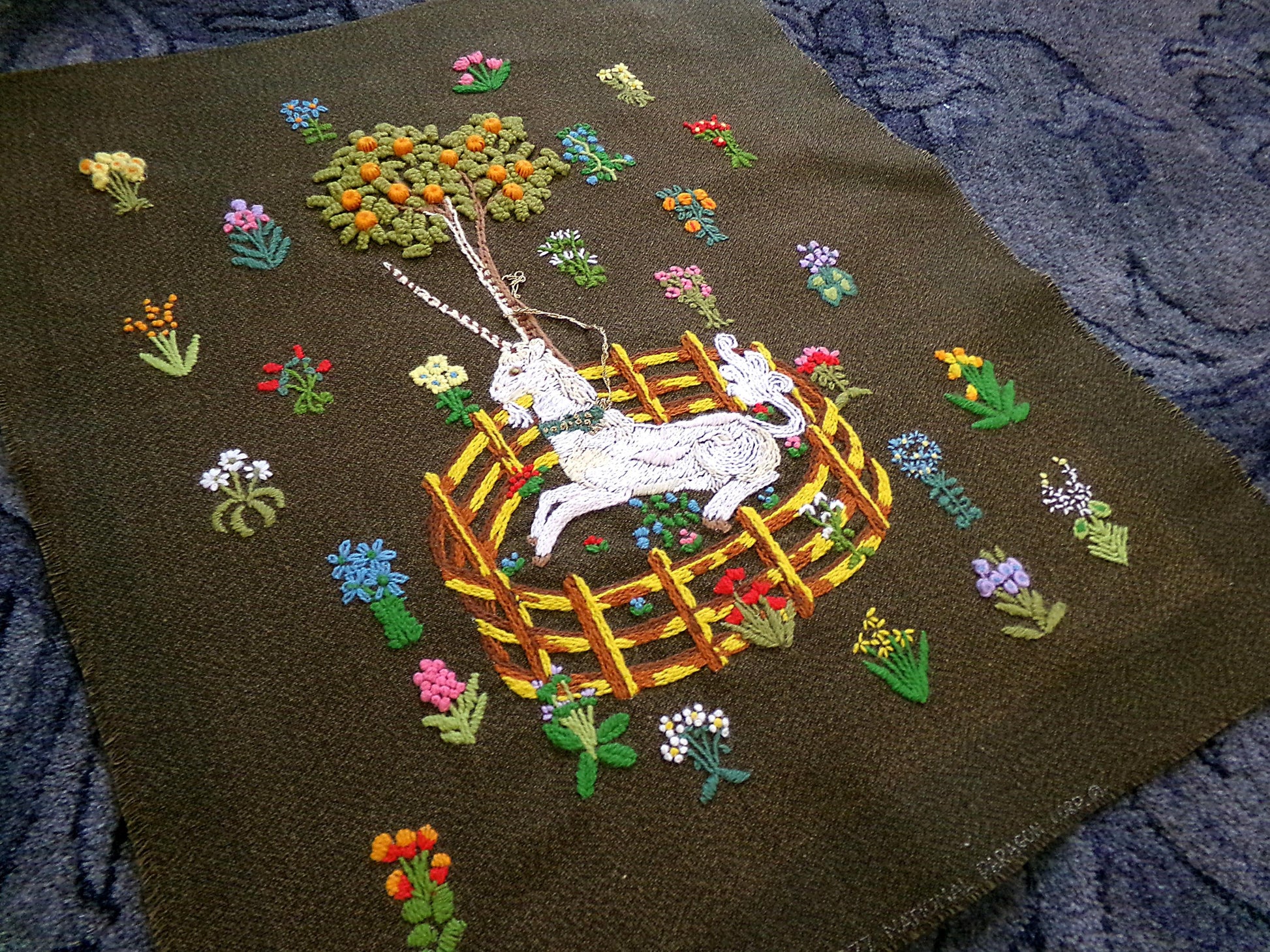 Exquisitely embroidered crewel piece called "The Unicorn in Captivity." Stitched by hand from an original Paragon Needlecraft stitchery kit #0846.A little background...