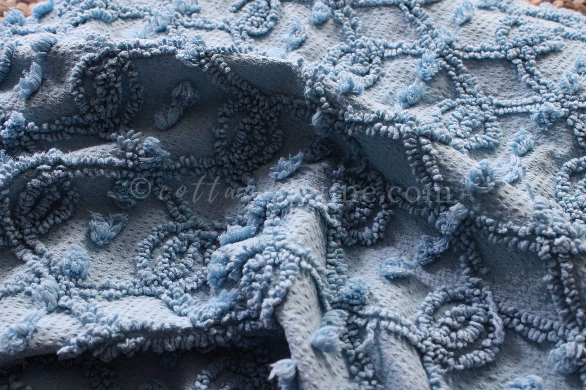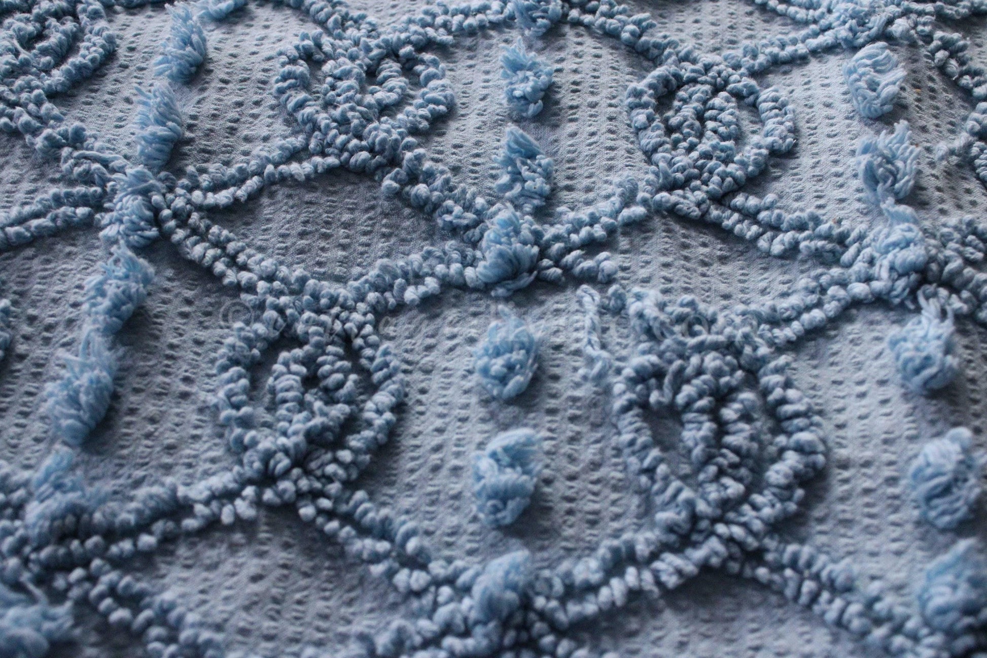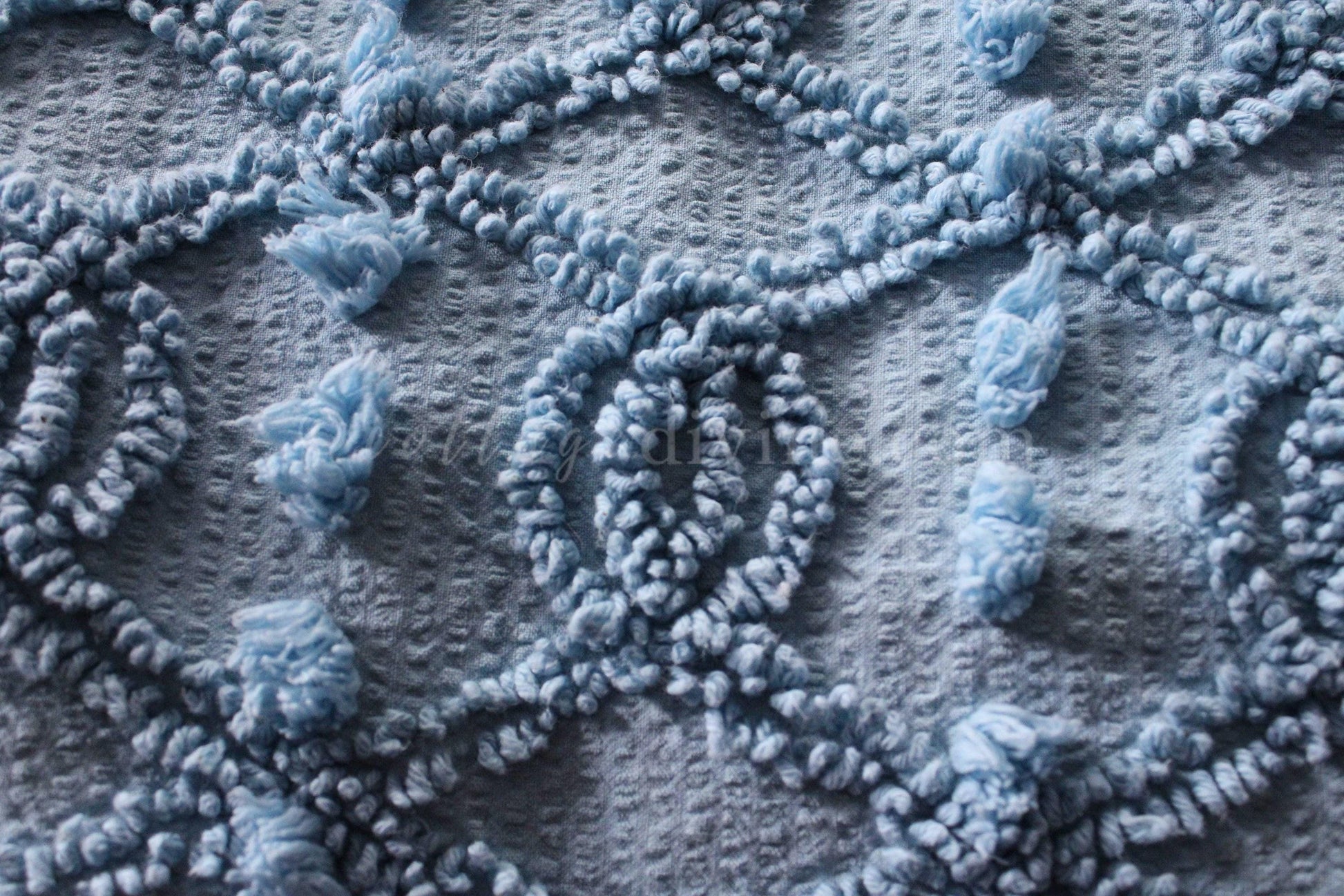 Trendy with a vintage meets modern vibe, this 20" x 24" inch vintage chenille fabric piece is so versatile with a seersucker cotton groundcloth tufted with a wideset infinity link & pops pattern. From cool coastal pillows to beach chic handmade quilts, the fabric adapts well wherever you choose to incorporate it.100% cotton, quality 1950s Cabin Crafts original design. Striking serene blue with geometric needletufting & fluffy pops intersecting. Expect to see some pulls to the tufting, common to the fabric.