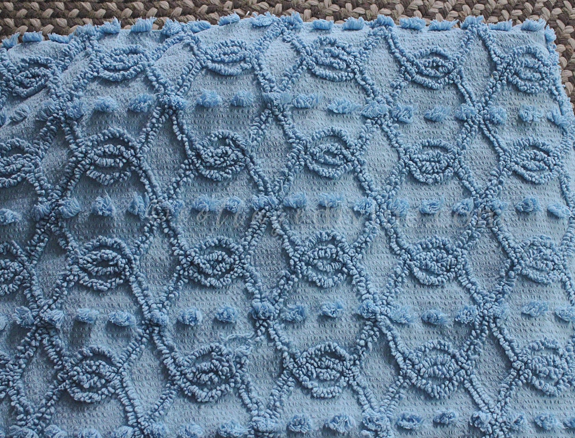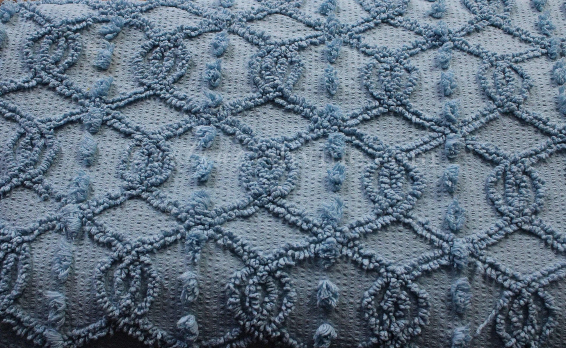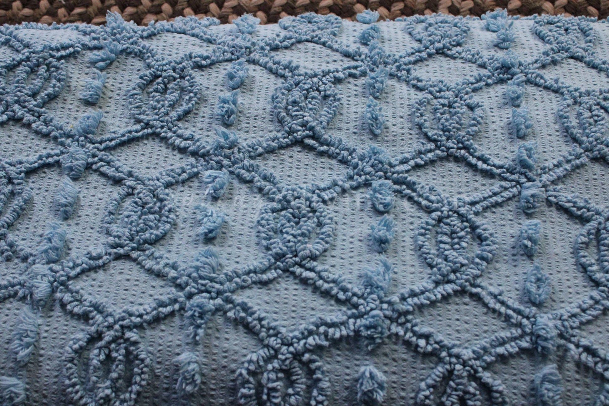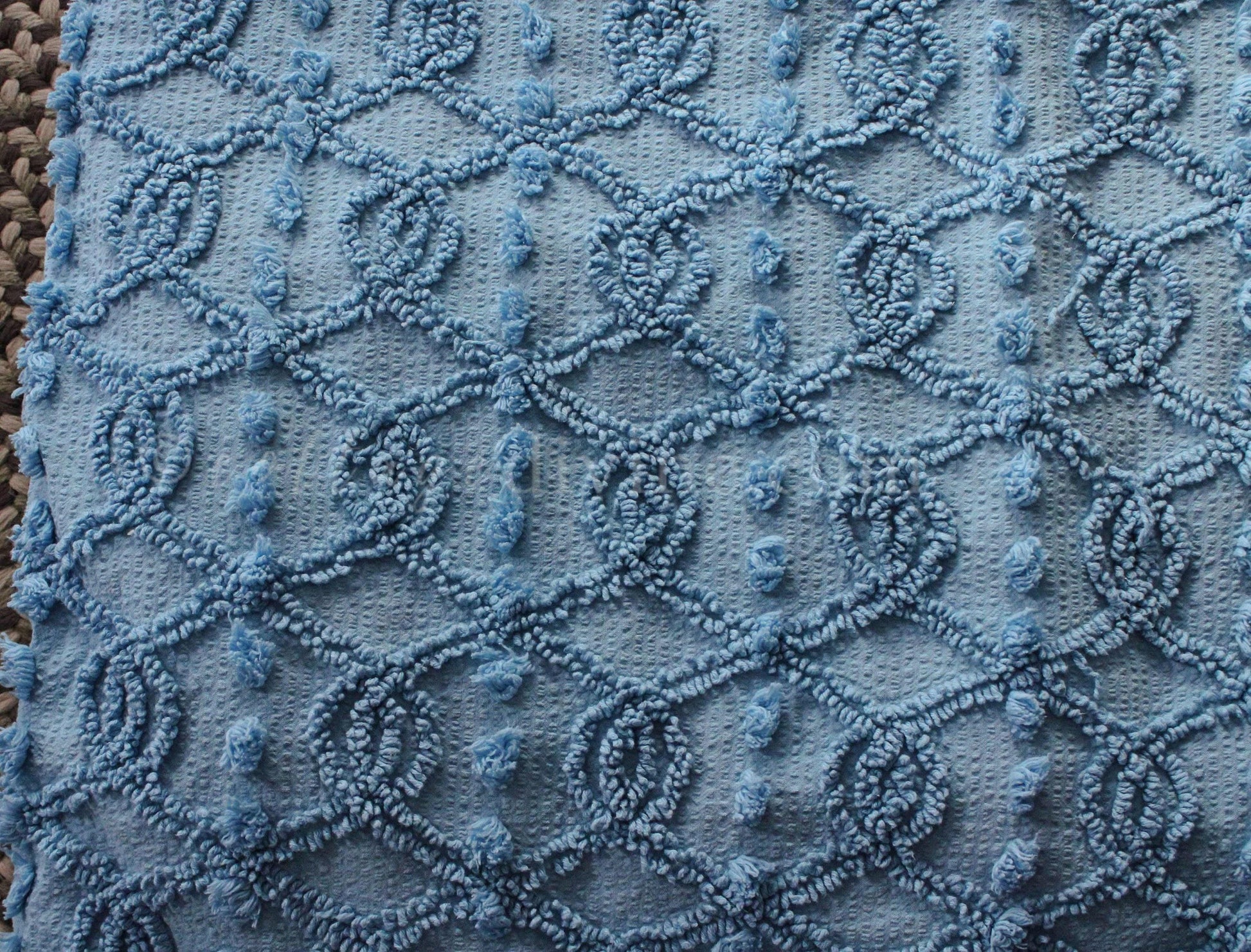 Trendy with a vintage meets modern vibe, this 20" x 24" inch vintage chenille fabric piece is so versatile with a seersucker cotton groundcloth tufted with a wideset infinity link & pops pattern. From cool coastal pillows to beach chic handmade quilts, the fabric adapts well wherever you choose to incorporate it.100% cotton, quality 1950s Cabin Crafts original design. Striking serene blue with geometric needletufting & fluffy pops intersecting. Expect to see some pulls to the tufting, common to the fabric.
