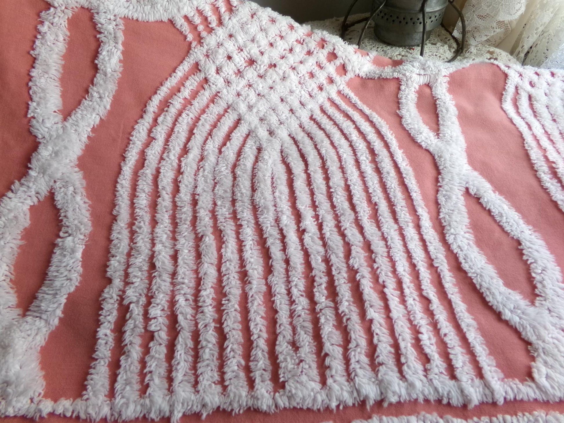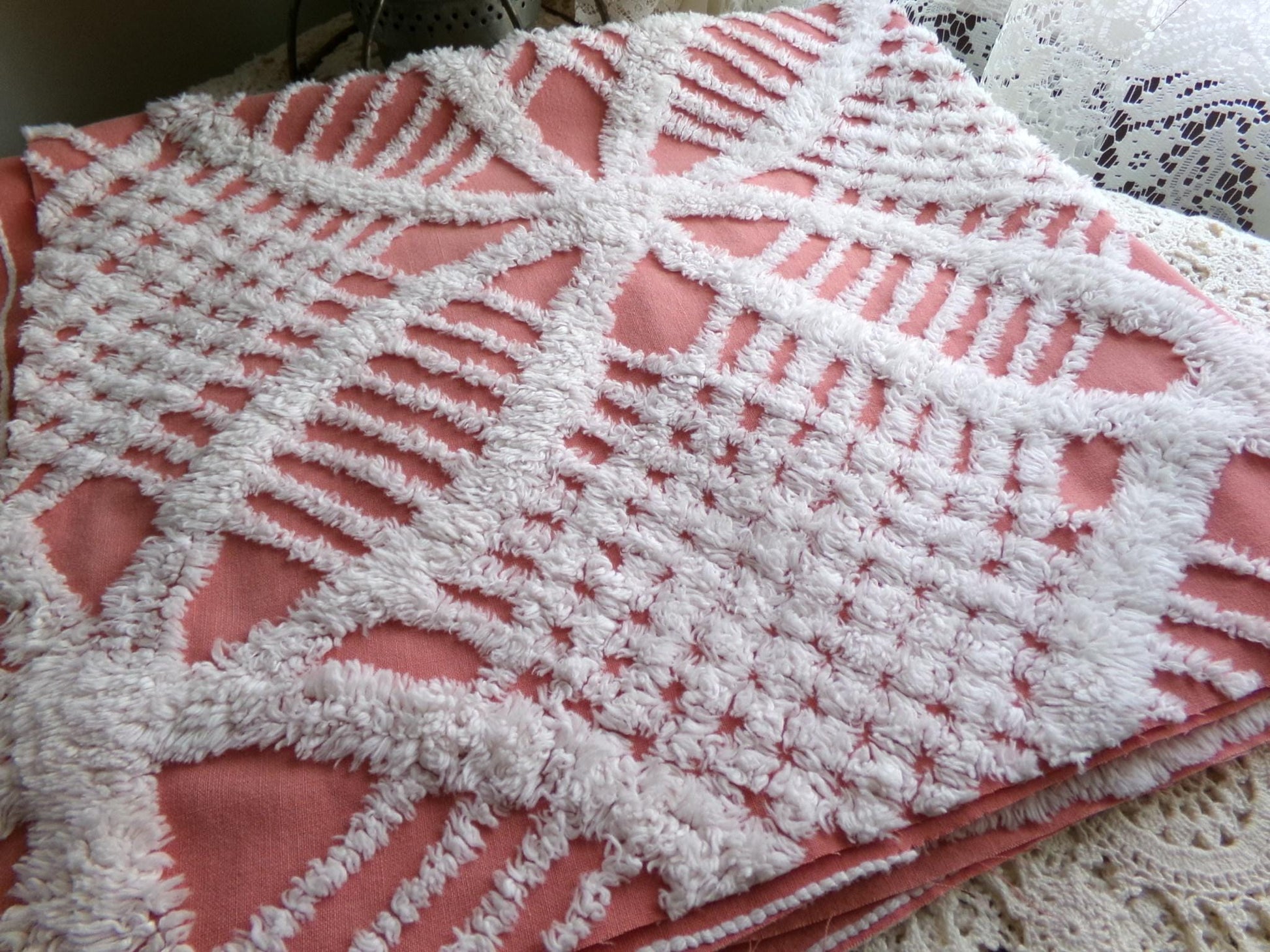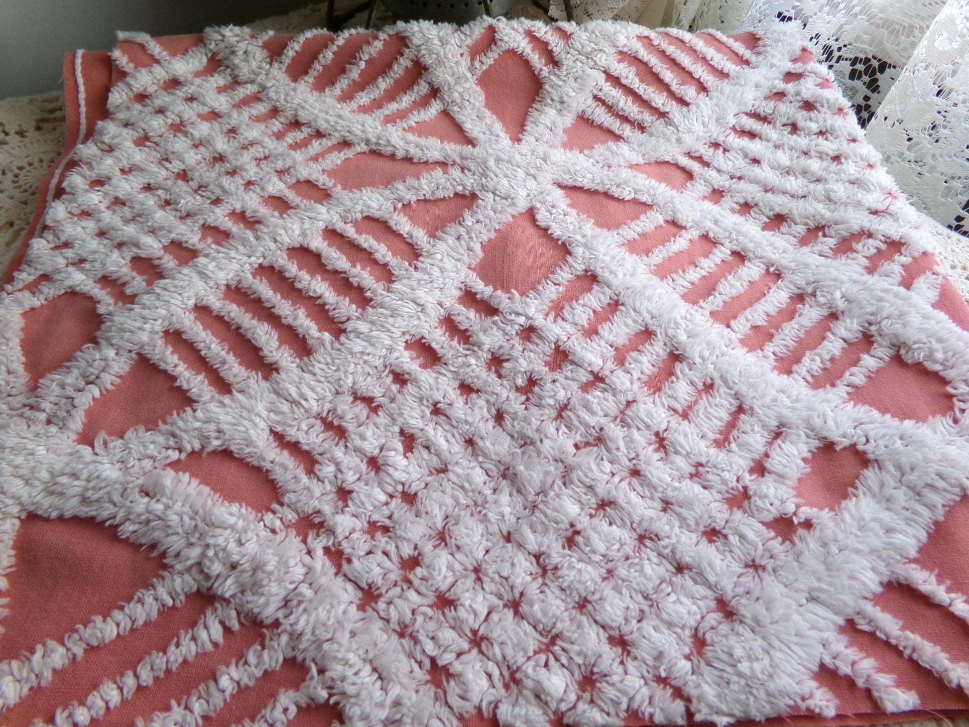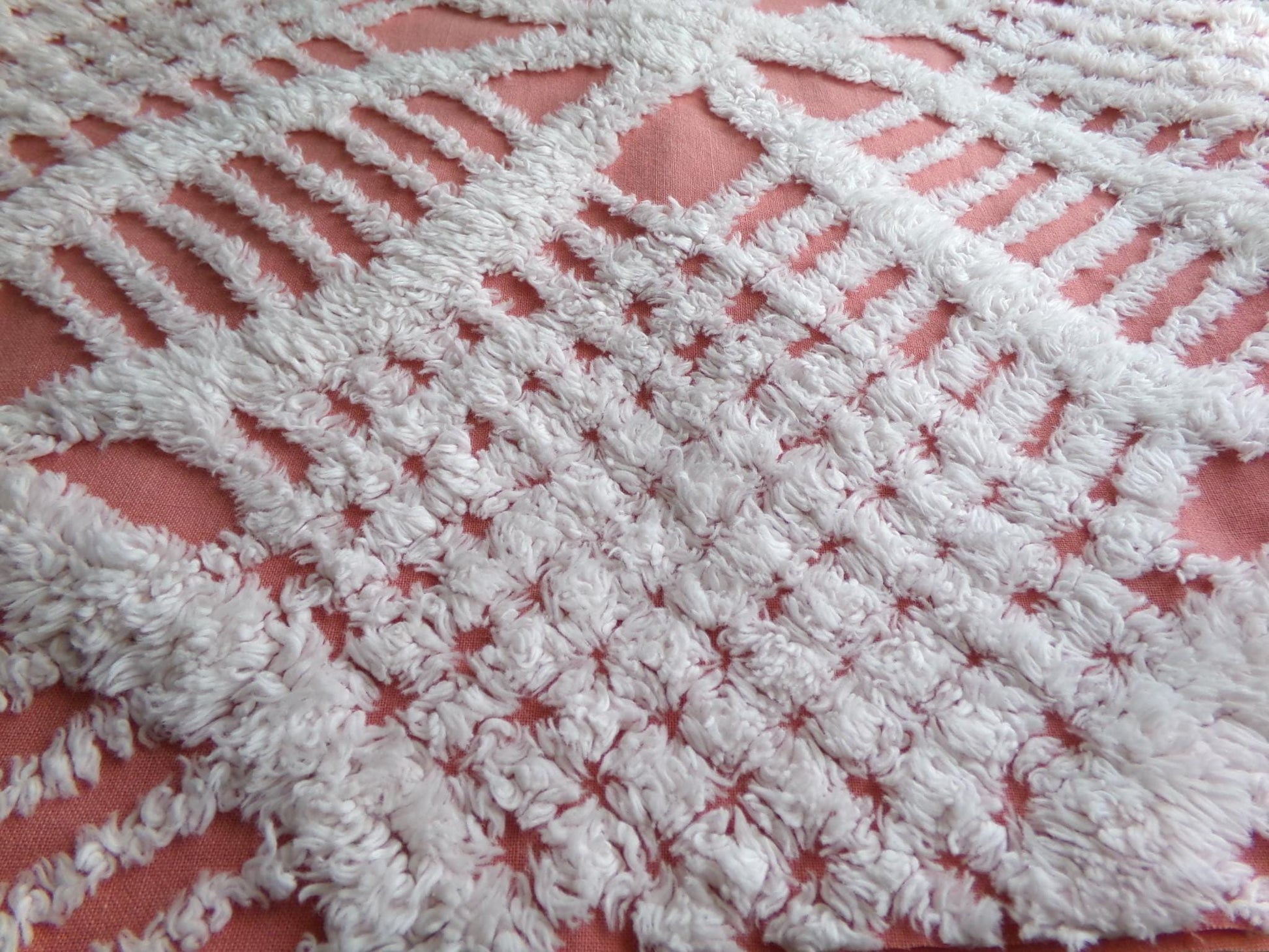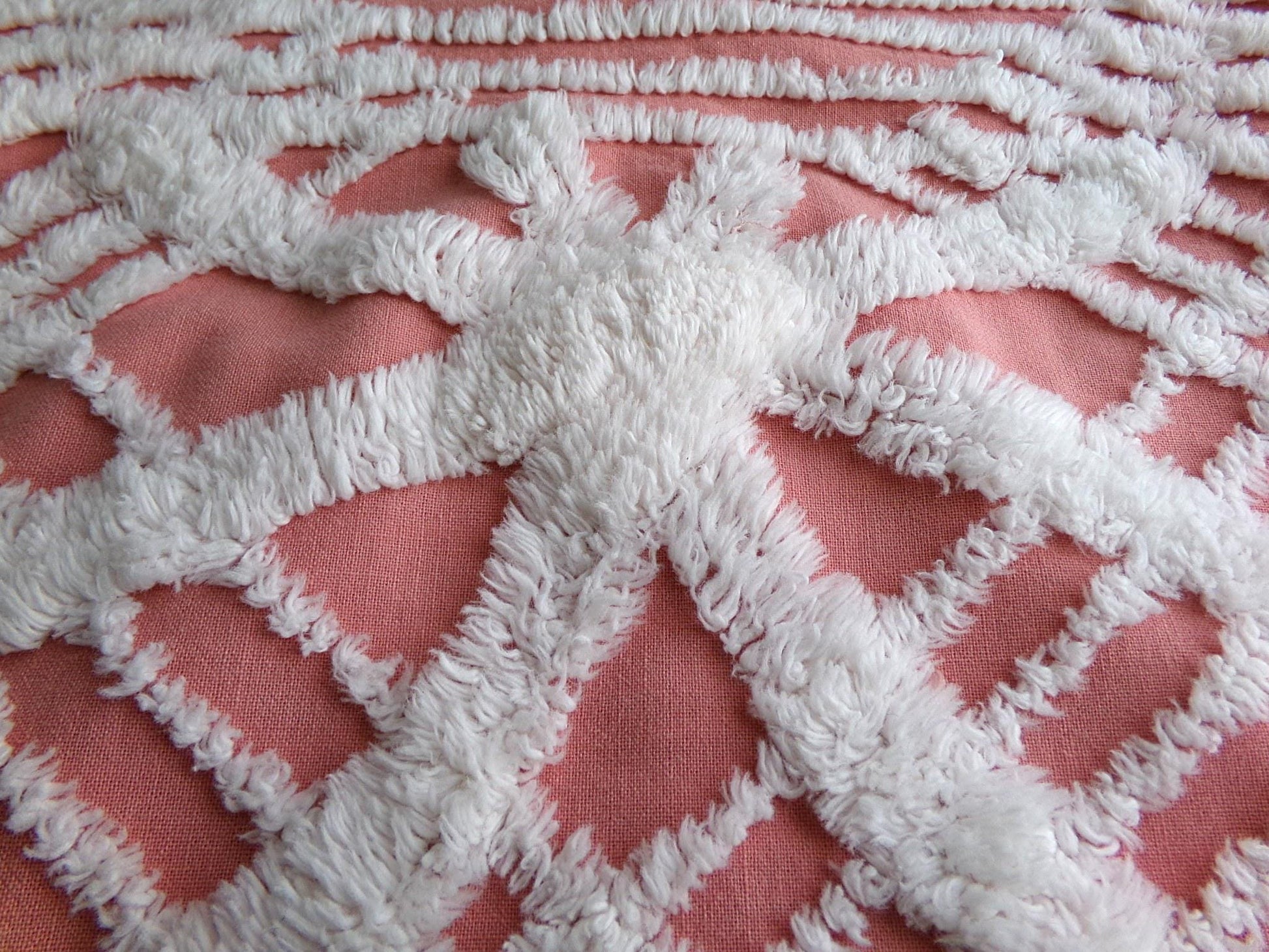 Shabby vintage chenille fabric features a popular white geometric pattern set on an uncommonly colored background - a warm shade of terracotta rose that's highly adaptive to light. It offers an inviting essence that works well to add a touch of old-fashioned nostalgia without overpowering your design.Measures about 29" x 27" inches. 100% lightweight cotton; 1950s era original. Note light tuft loss/small pinholes.