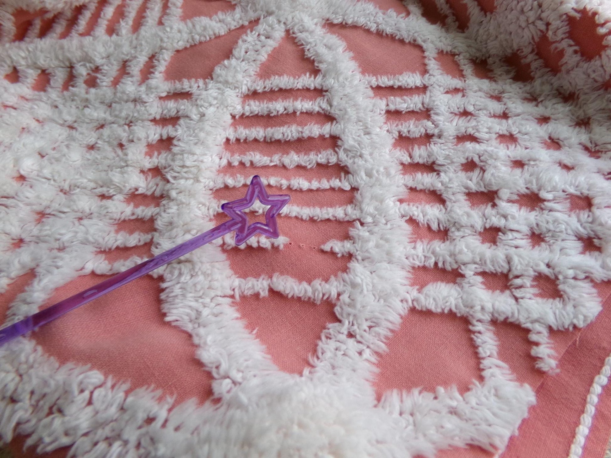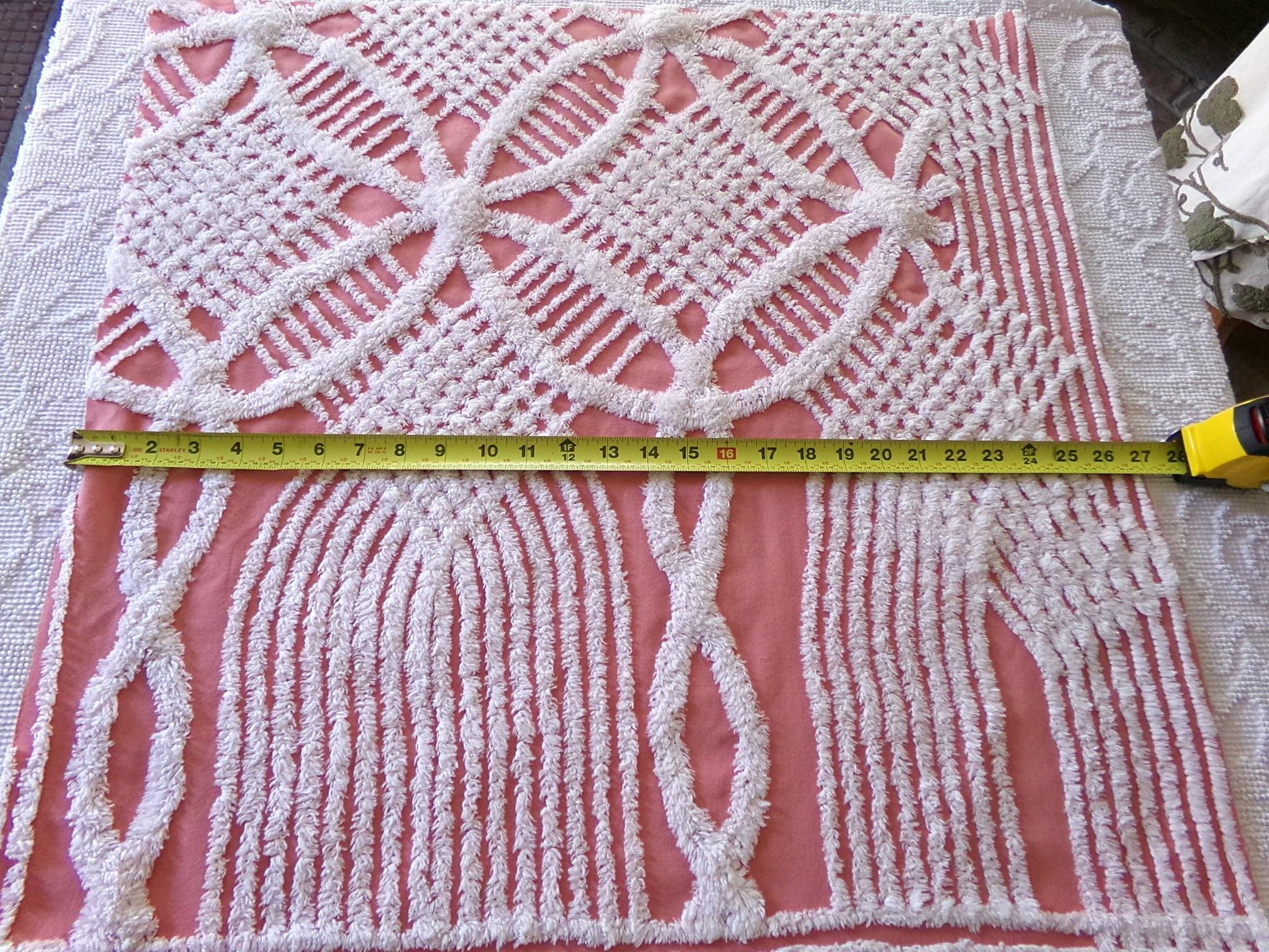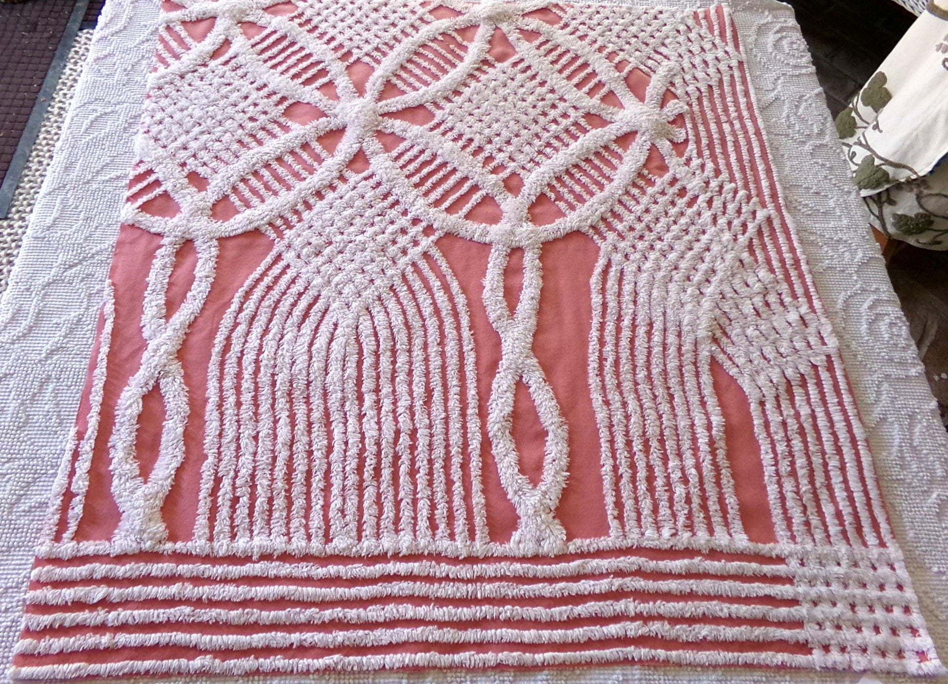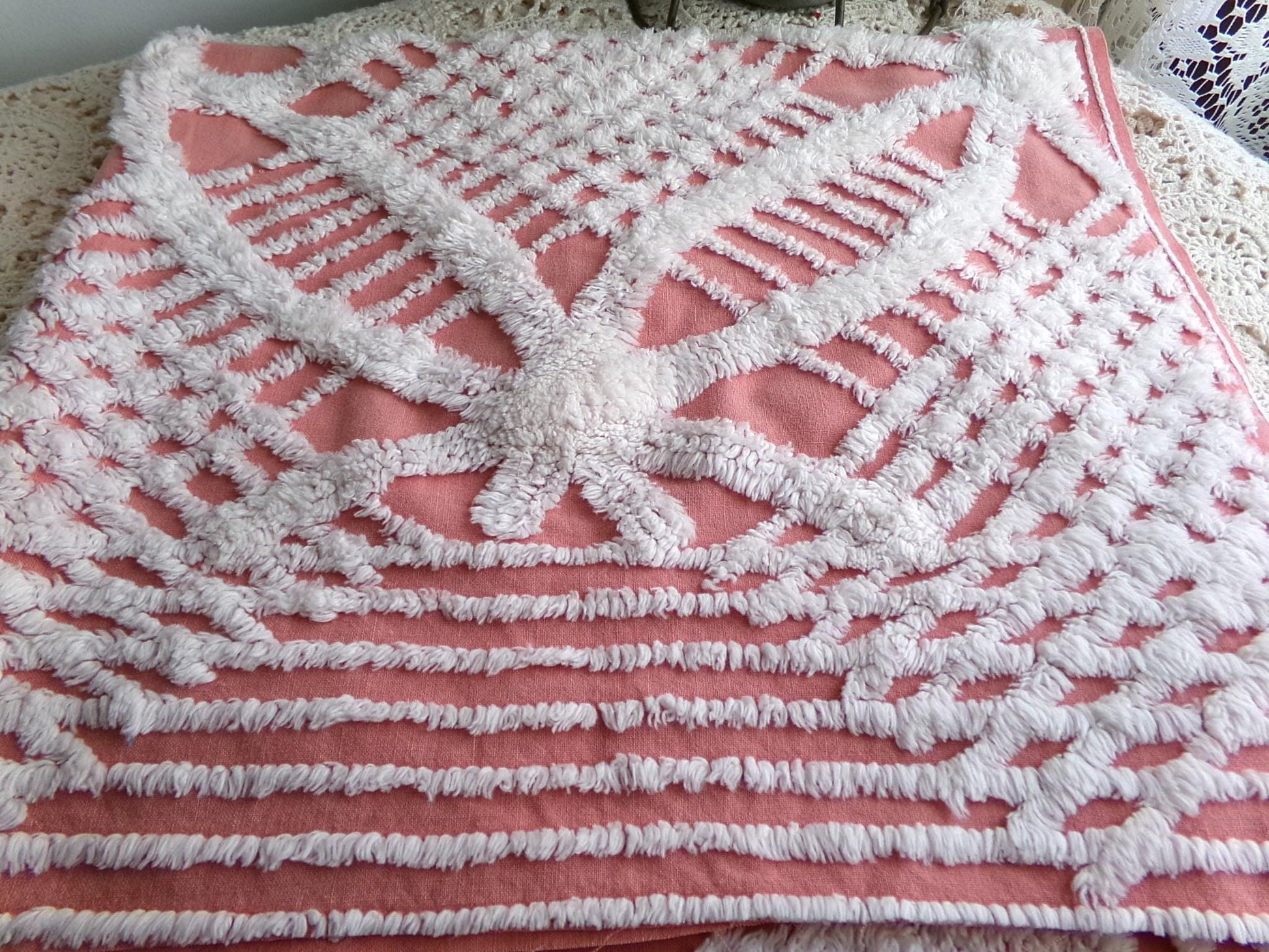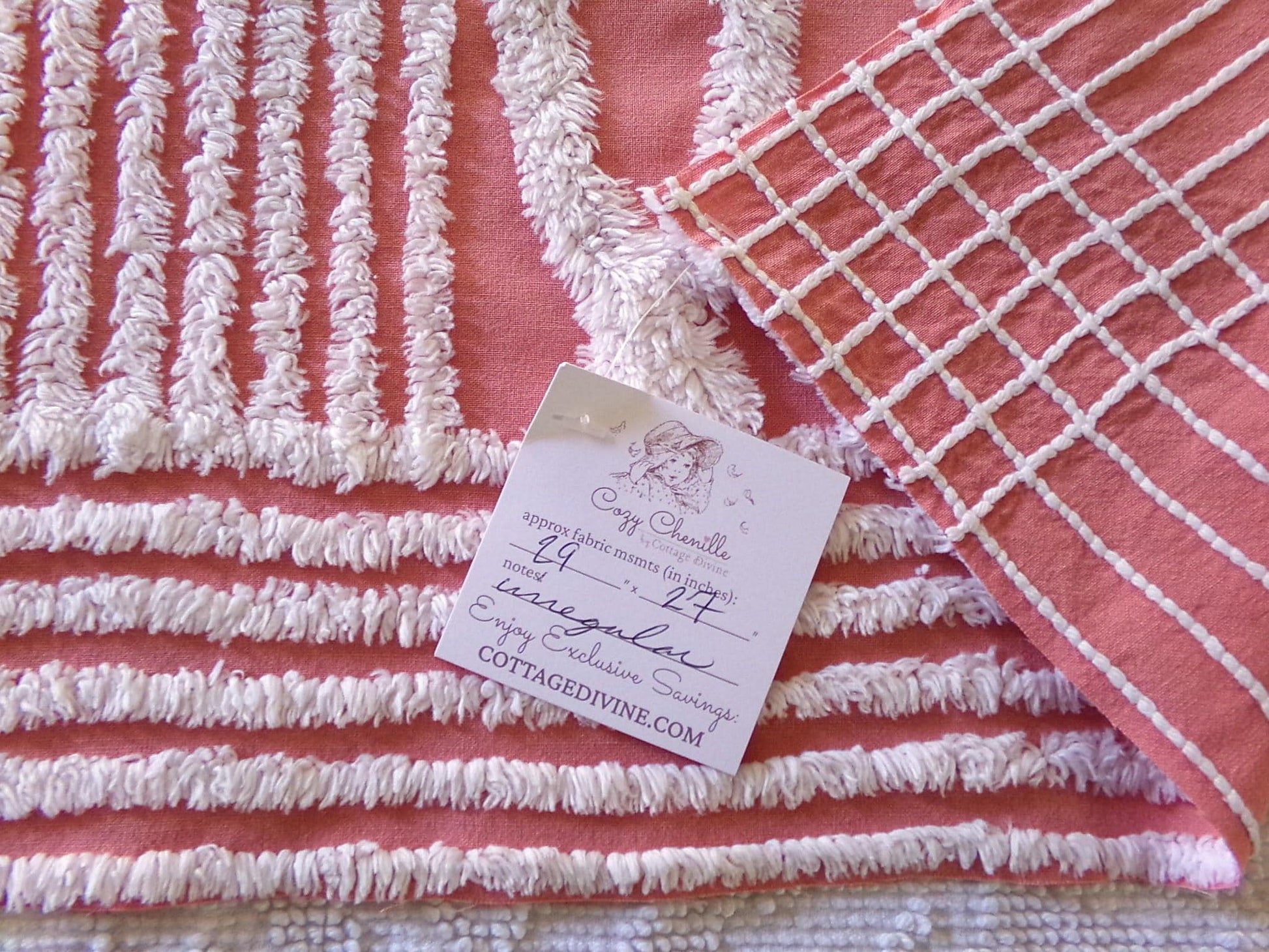 Shabby vintage chenille fabric features a popular white geometric pattern set on an uncommonly colored background - a warm shade of terracotta rose that's highly adaptive to light. It offers an inviting essence that works well to add a touch of old-fashioned nostalgia without overpowering your design.Measures about 29" x 27" inches. 100% lightweight cotton; 1950s era original. Note light tuft loss/small pinholes.