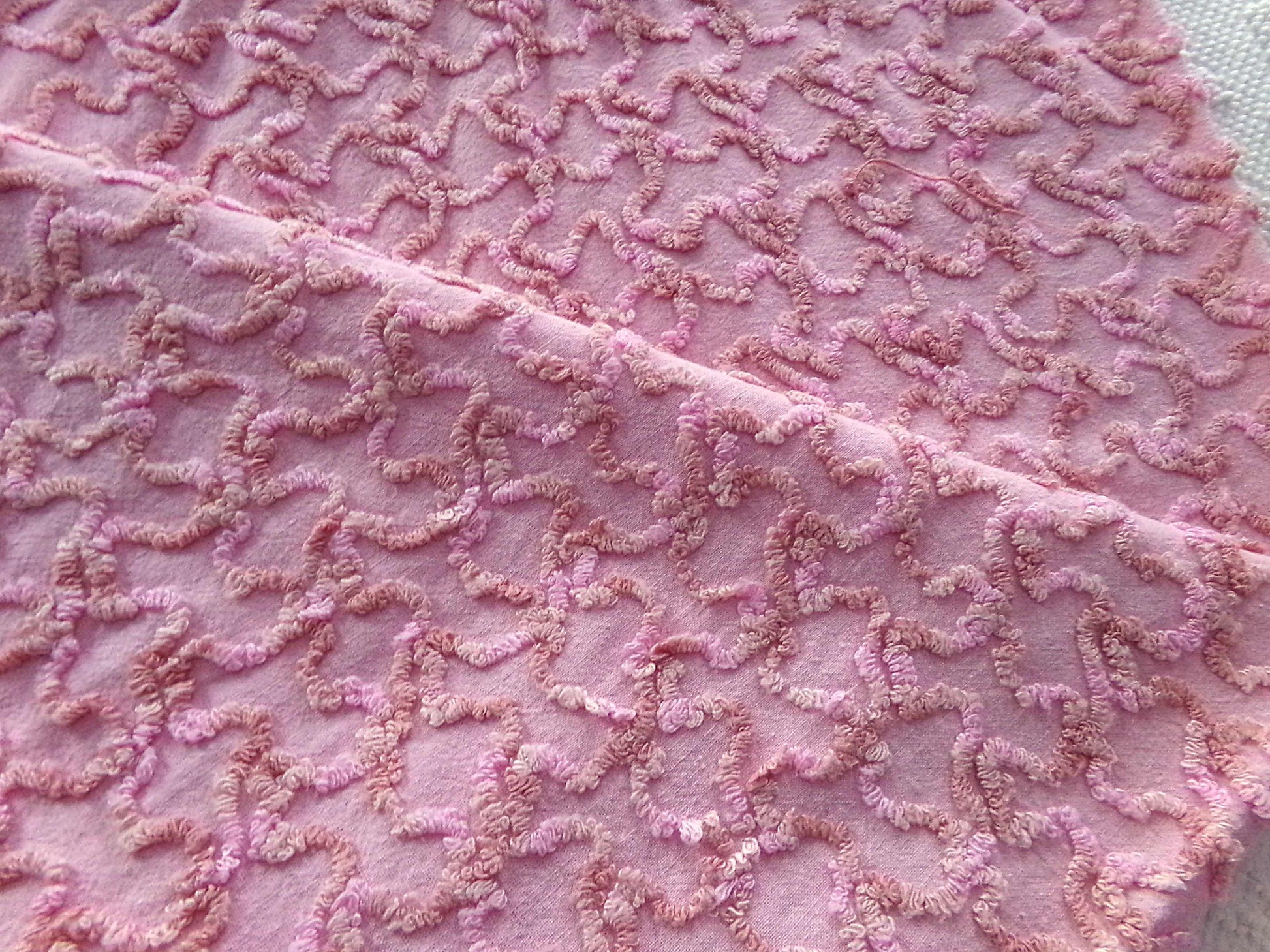 Deliver unique visual interest to your creative design with this piece of vintage chenille fabric. It features a texturized squiggle pattern in an eyecatching marbleized rainbow colorway. Even the accent fringe displays the same rainbow coloration.Piece measures approx 25" x 20" inches. 100% cotton, lightweight & easy to work with. An original Cabin Crafts design from the 1960s era.