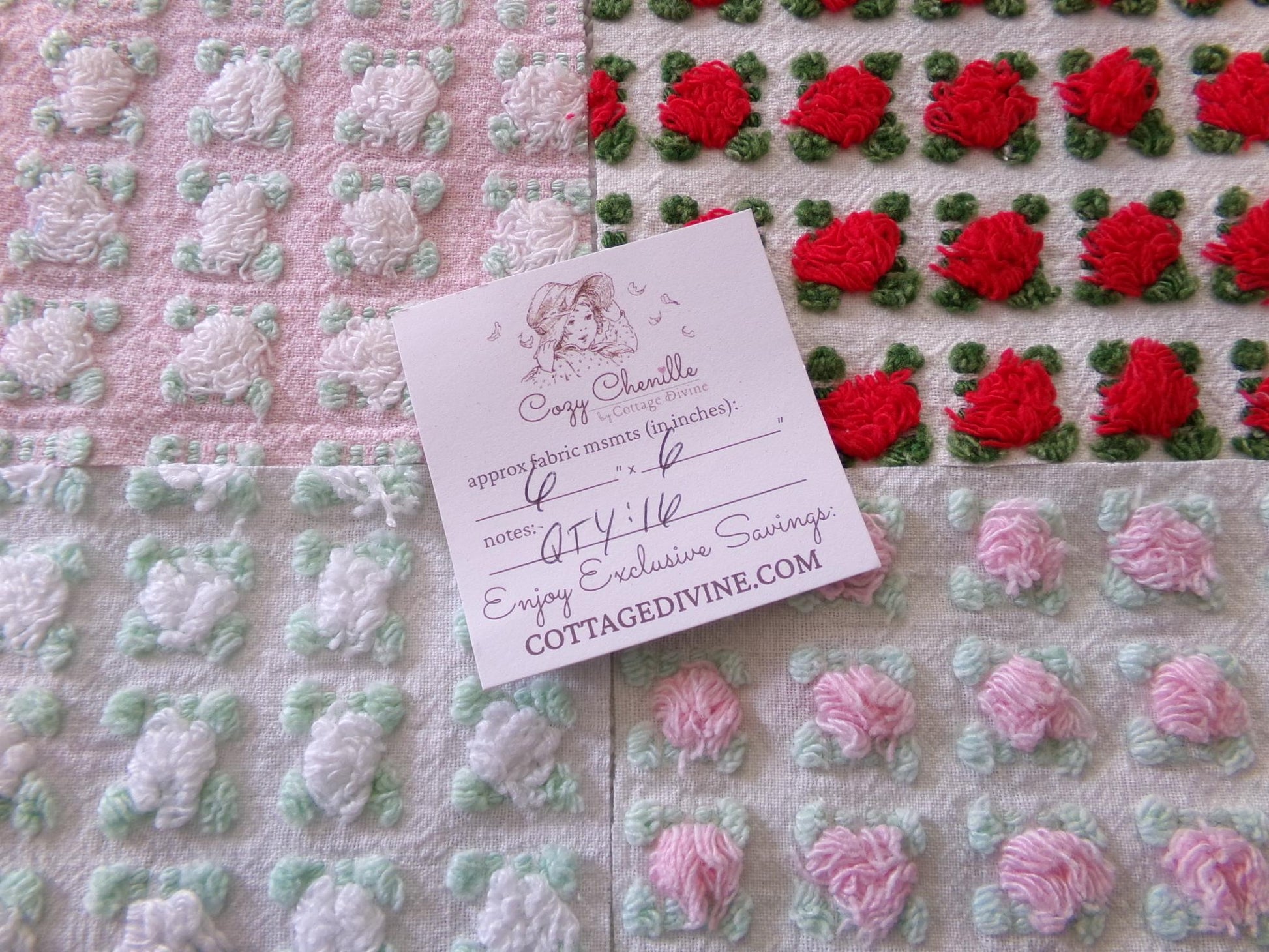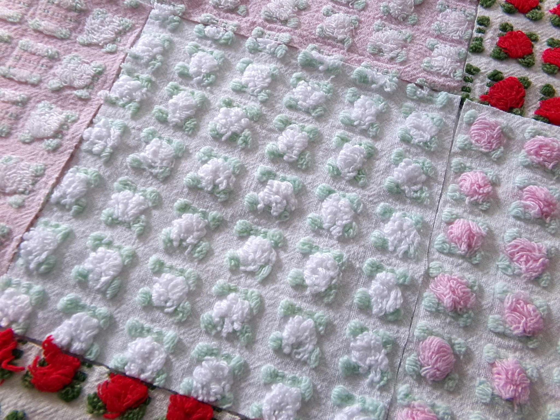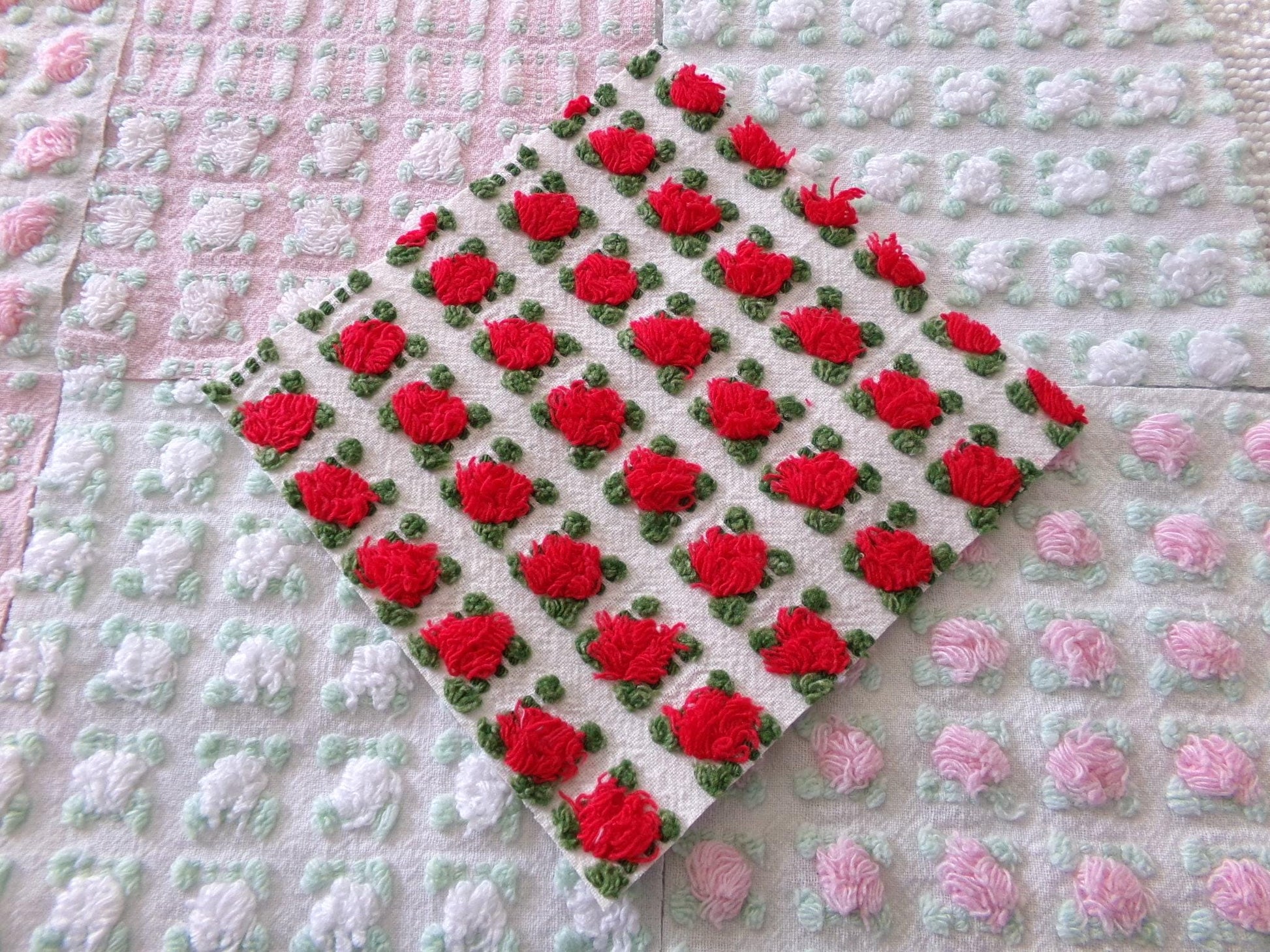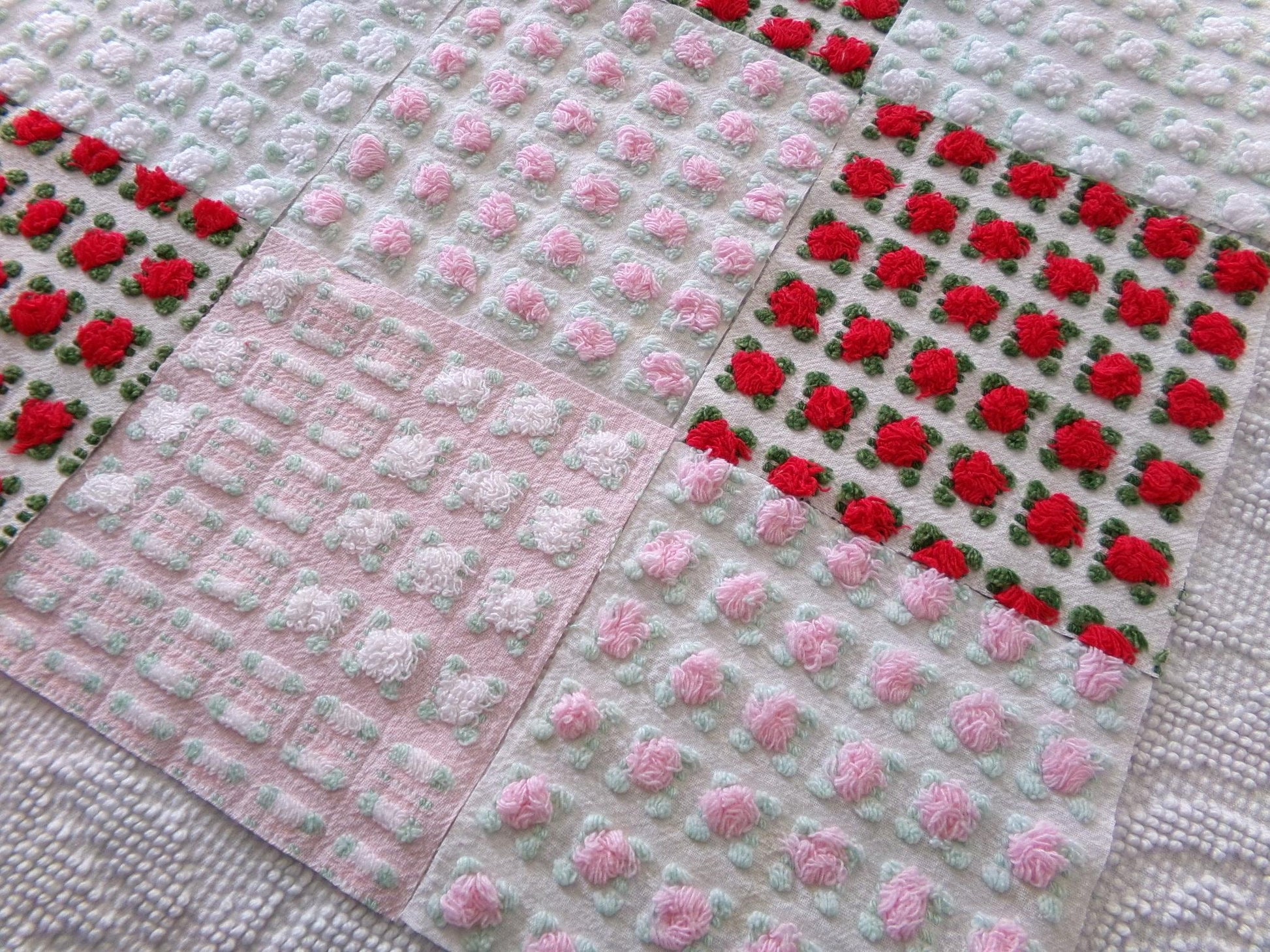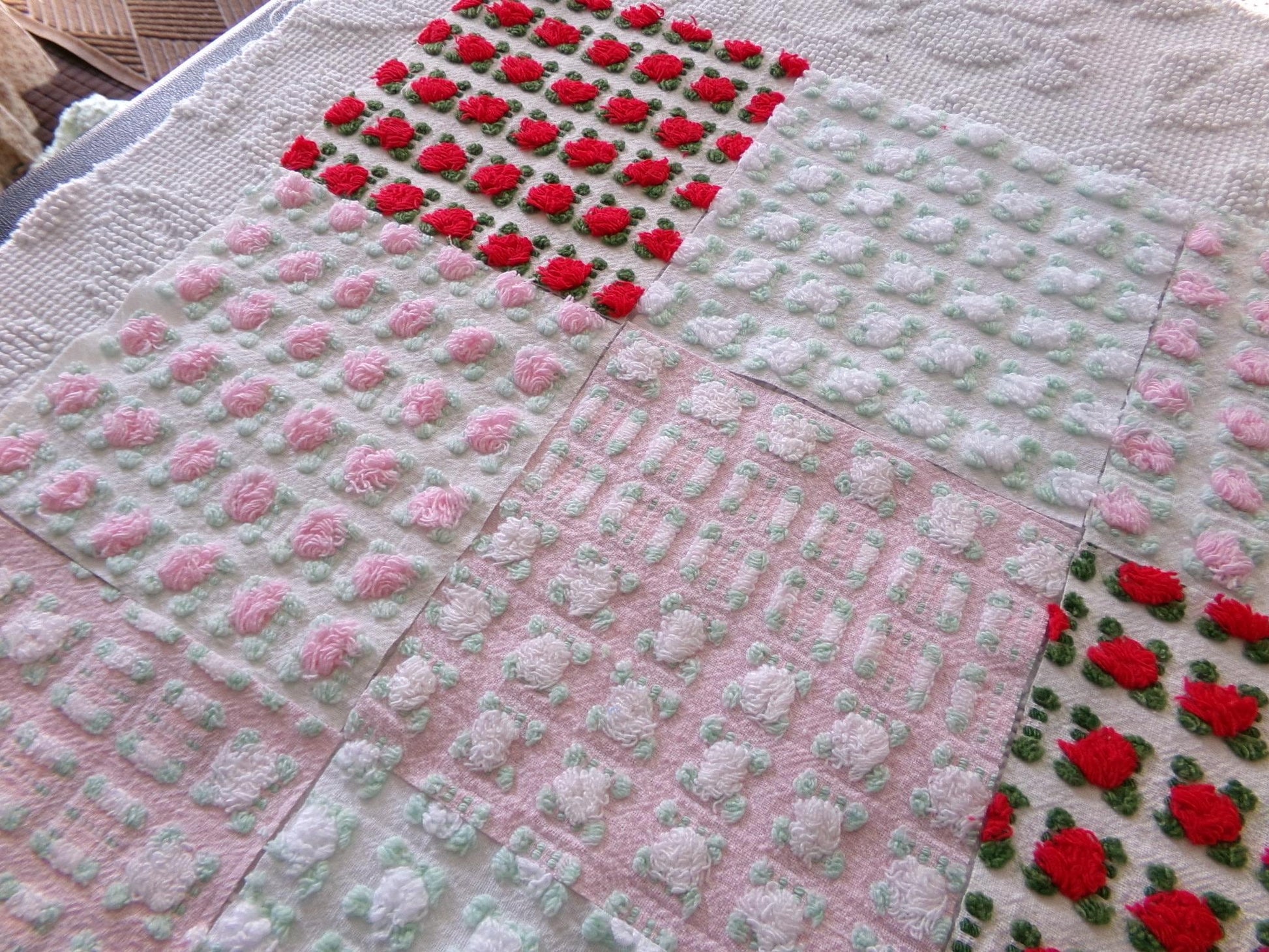 "Valentine Rosebuds"...this premium set of vintage chenille quilt squares features a sampling of four of the most rare rosebud colors: rich red, snow white, pretty pink & phantom white rosebud on pink.Note that the white on pink rosebud "Phantom" pattern may feature "empty" roses, where only the leaves are seen, this is intentional and factory done. See an upclose example in img #9.