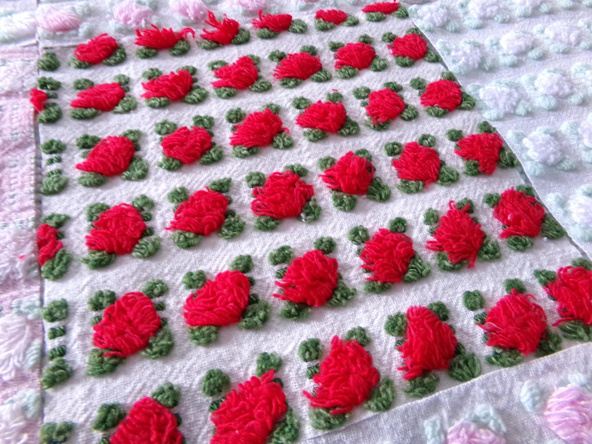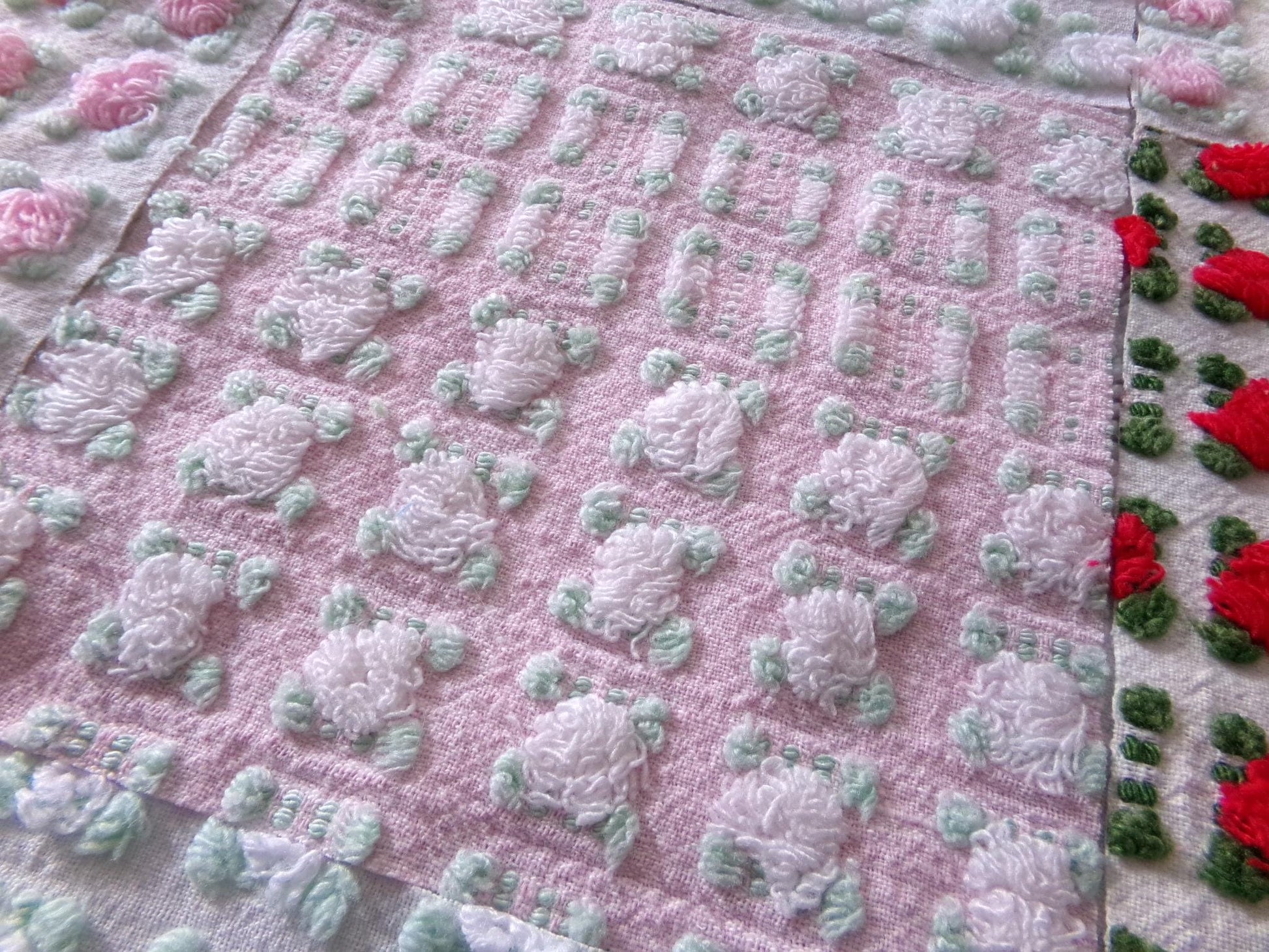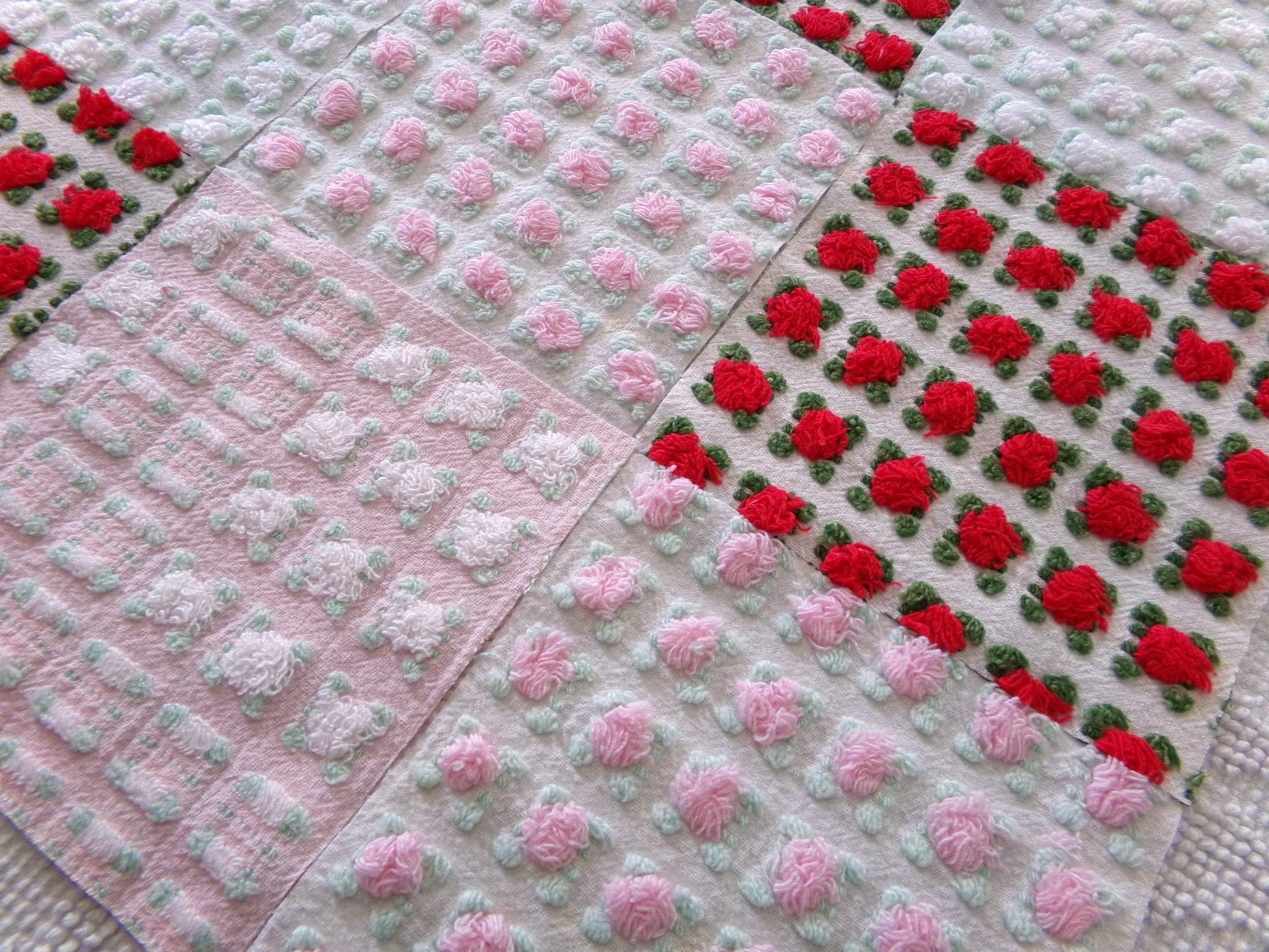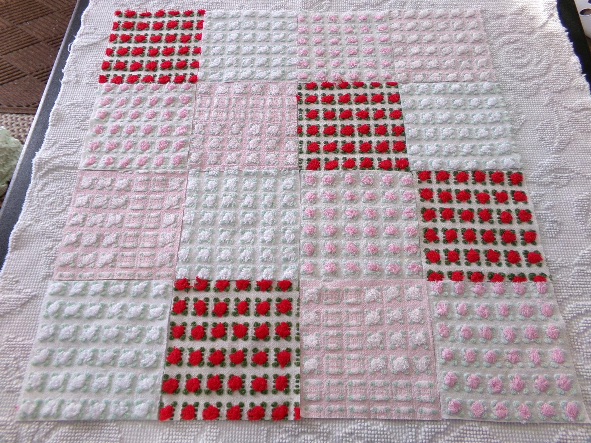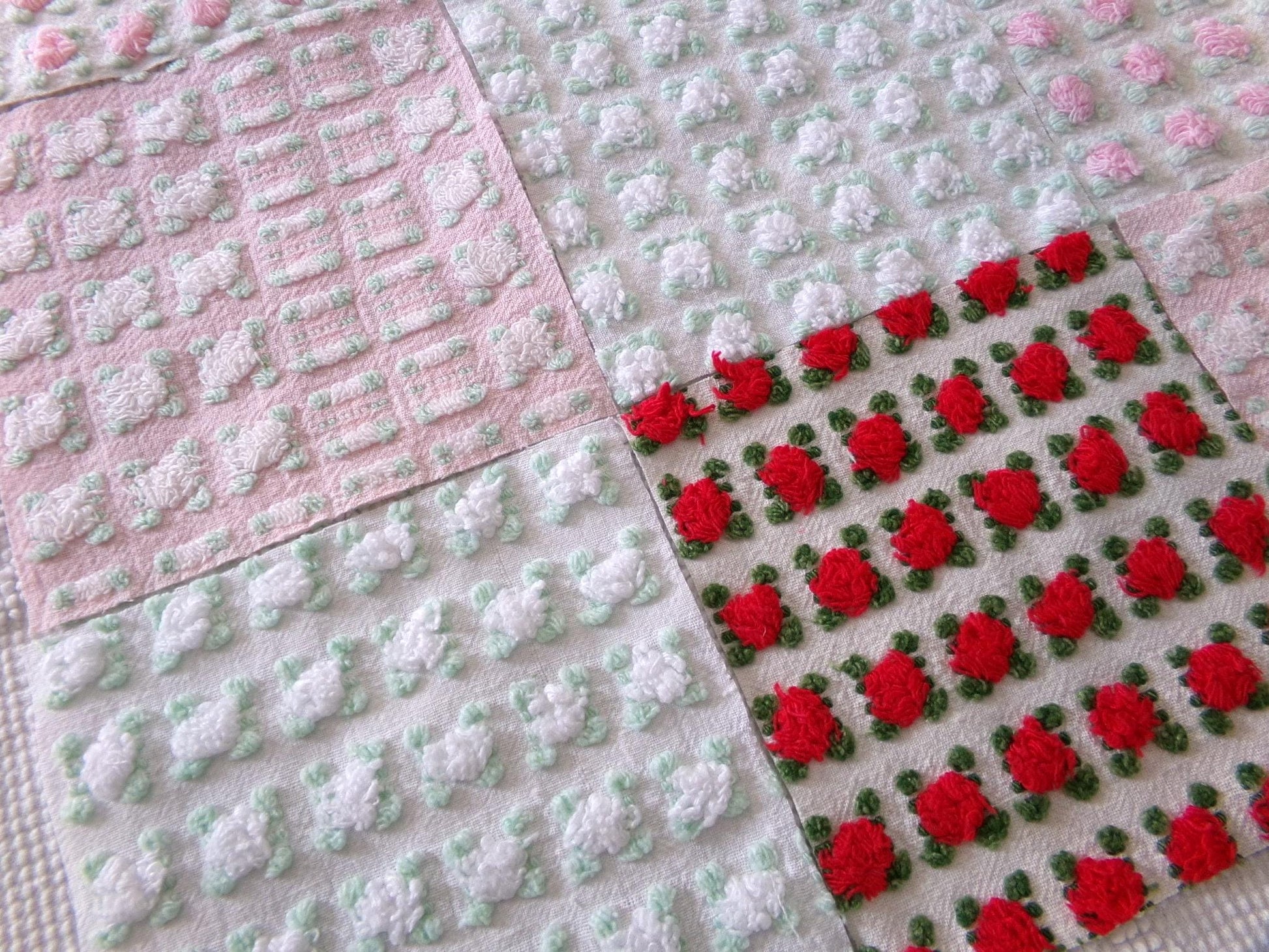 "Valentine Rosebuds"...this premium set of vintage chenille quilt squares features a sampling of four of the most rare rosebud colors: rich red, snow white, pretty pink & phantom white rosebud on pink.Note that the white on pink rosebud "Phantom" pattern may feature "empty" roses, where only the leaves are seen, this is intentional and factory done. See an upclose example in img #9.