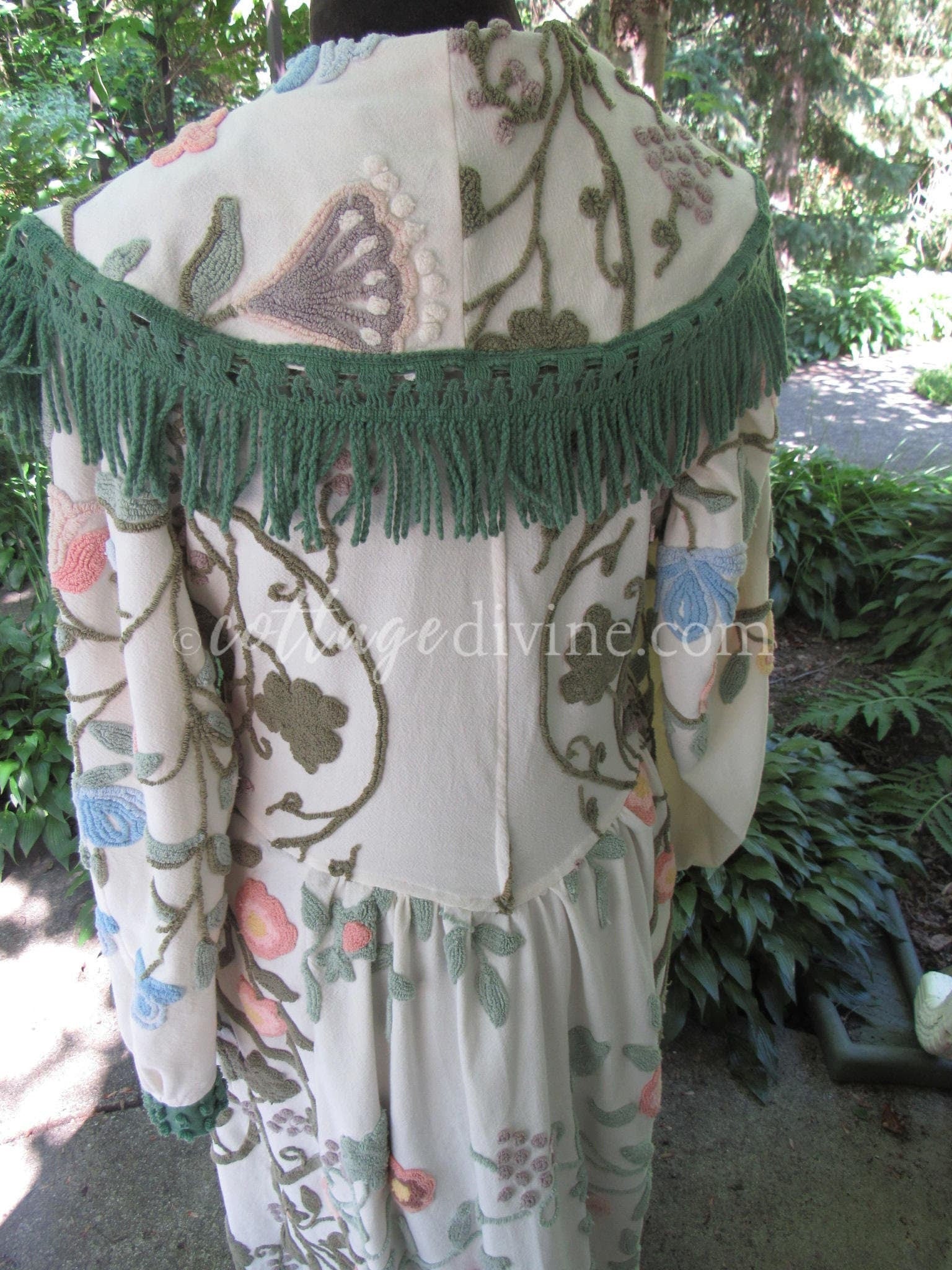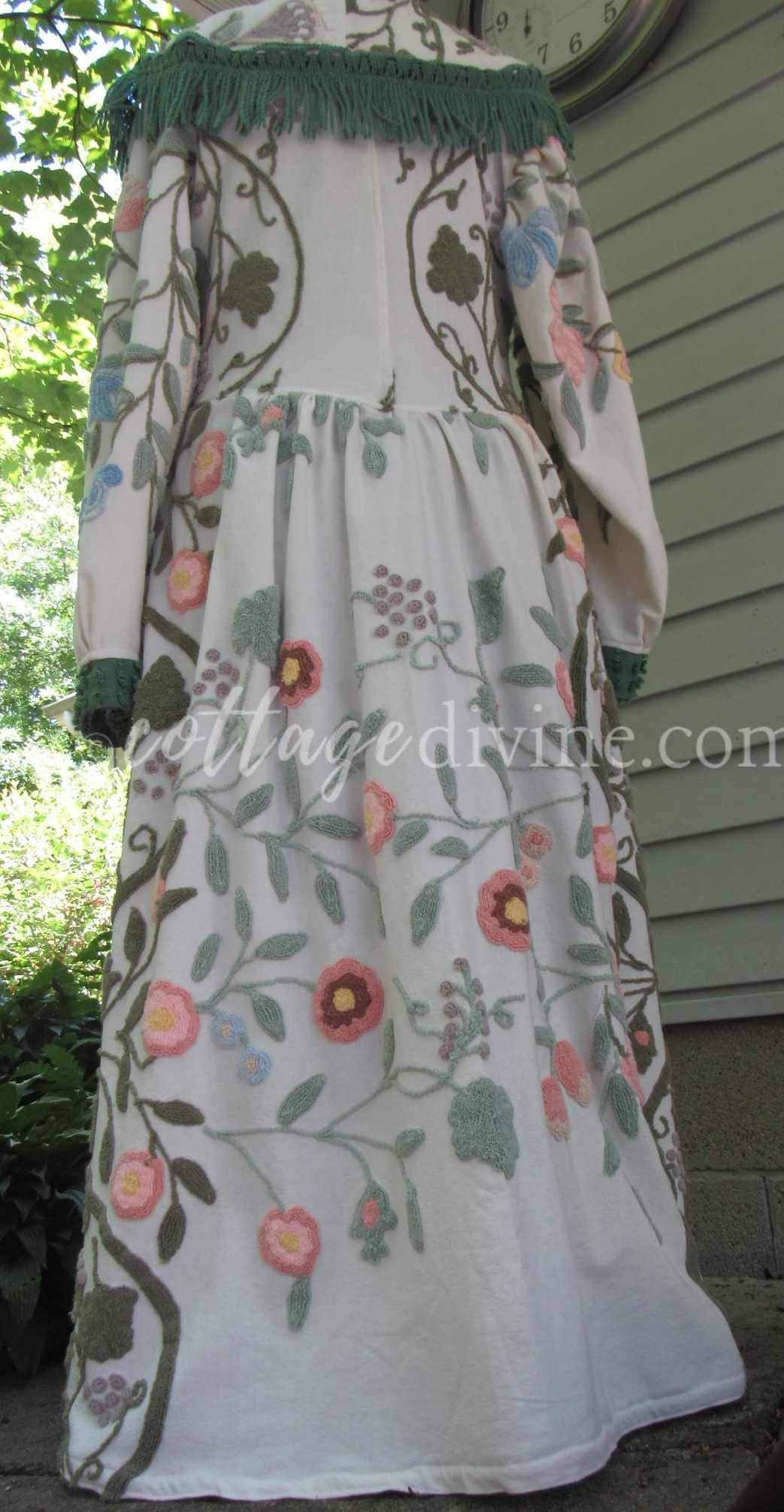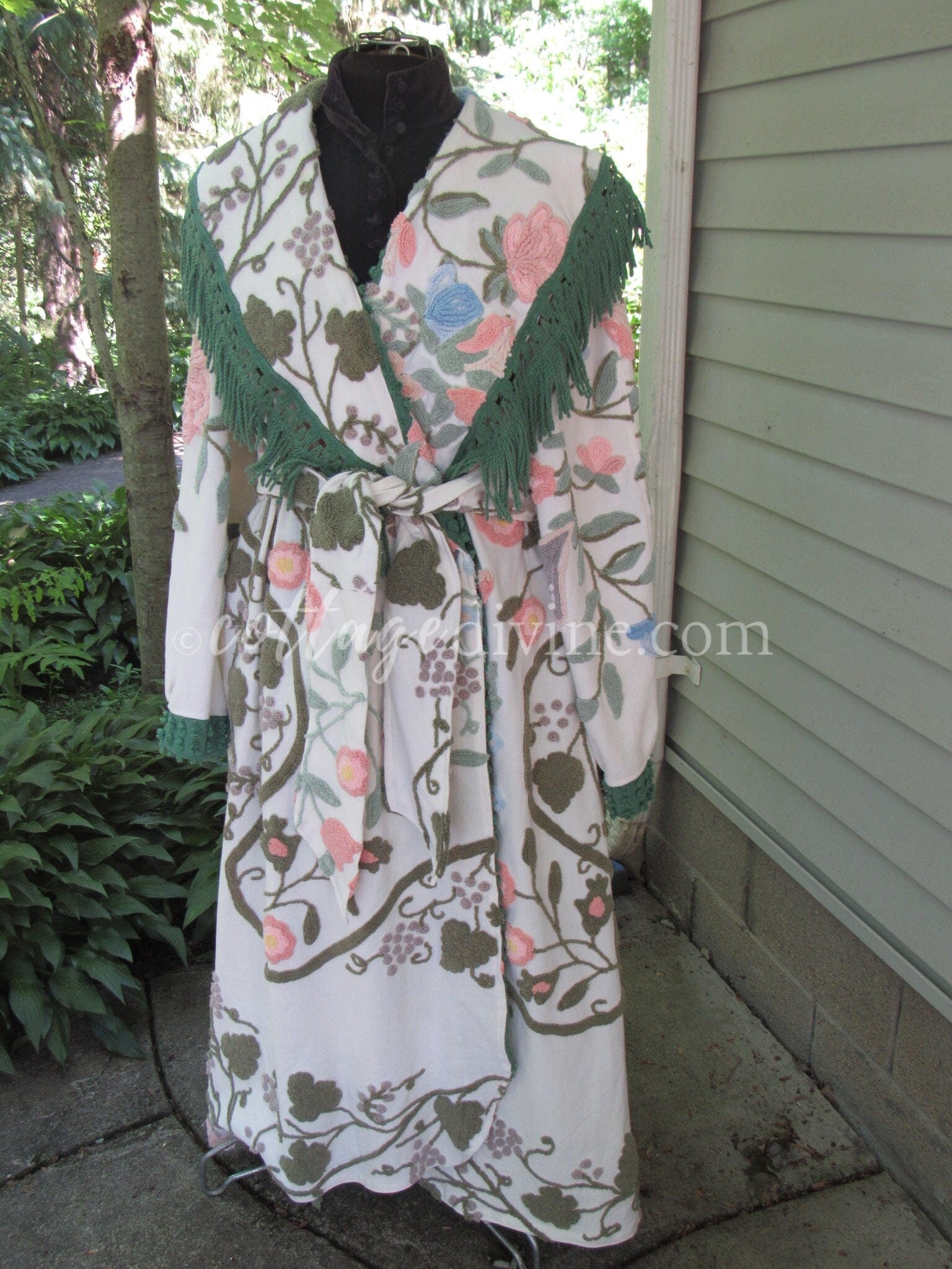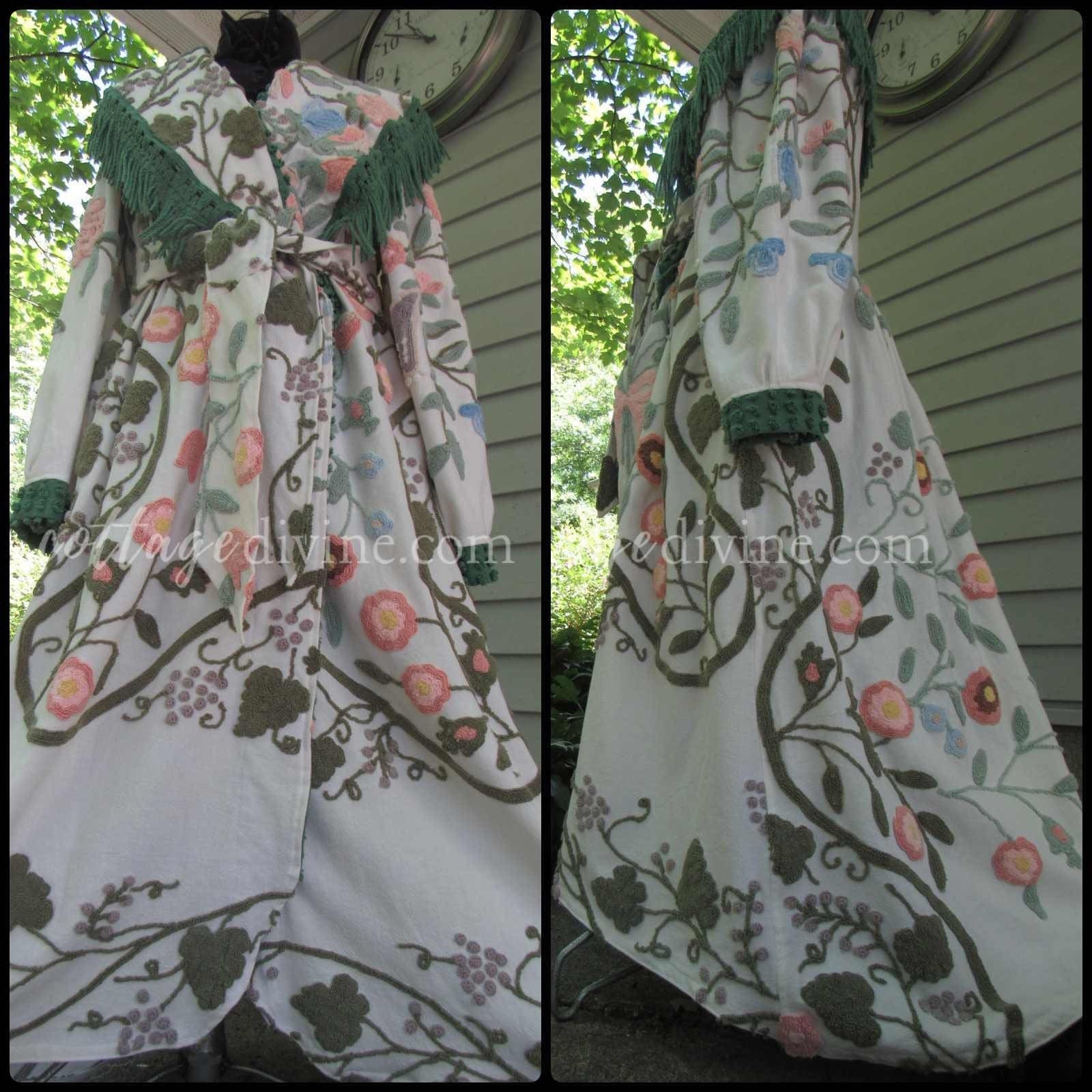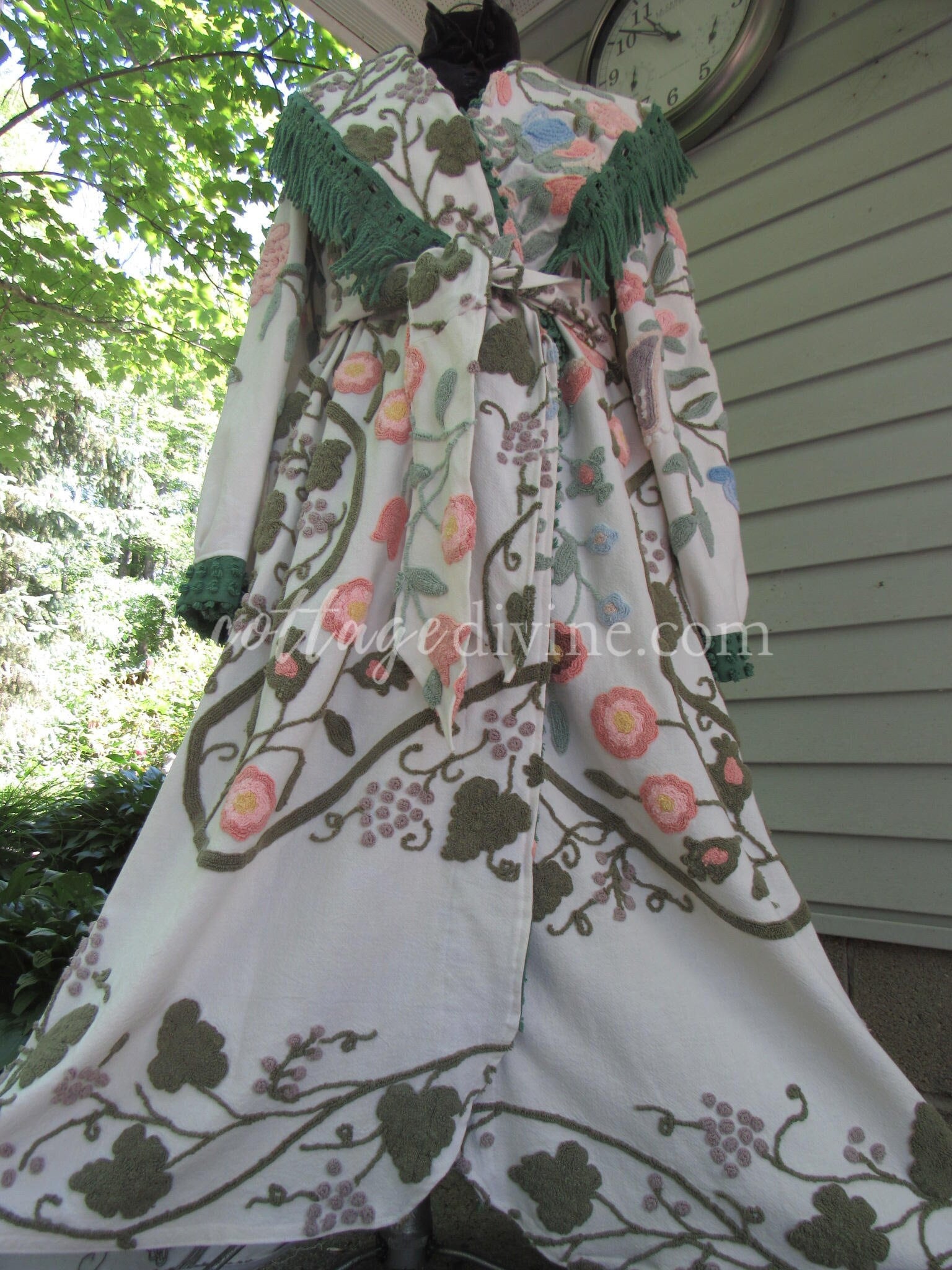 Step back in time to the Victorian era...Shabby fabulous distressed vintage costume style chenille robe handmade using several antique Cabin Crafts bedspreads...Fringe accents, many floral appliques all hand cut from coordinating vintage chenille..Original Cabin Crafts tag from one of the chenille bedspreads this was designed from is sewn into a collar facing, where it is accented with more cut flowers. The collar facing is intentionally wrinkled and distressed to create an antiqued look.A mysterious, haunting silhouette...gently swooping hem...fitted throughout bodice with a flowing skirt... integrated belt tie, puff sleeve shoulders and banded wrists. Perfect for costume wear, we have designed this same style for theater productions because of the prominent Victorian styling.