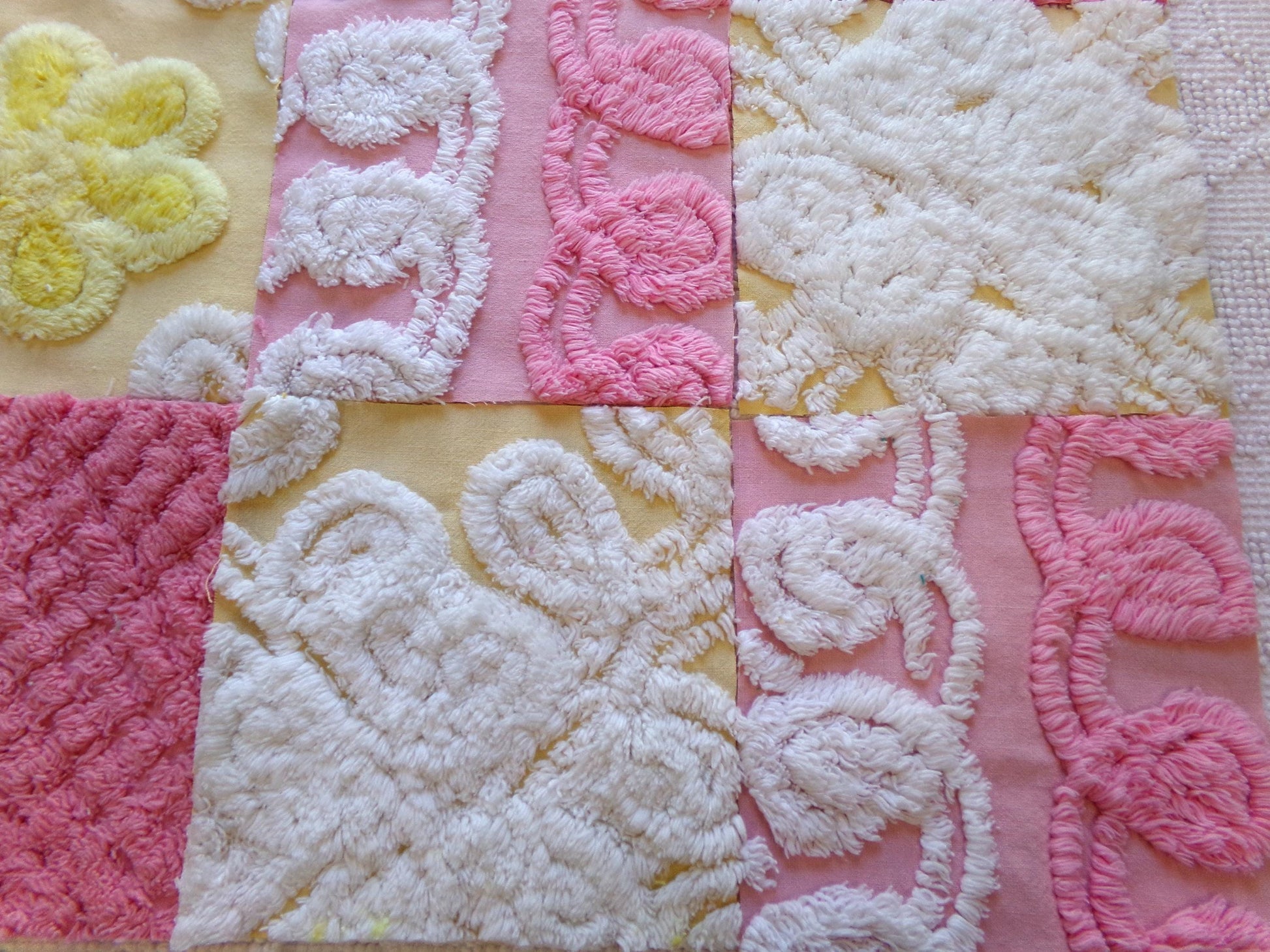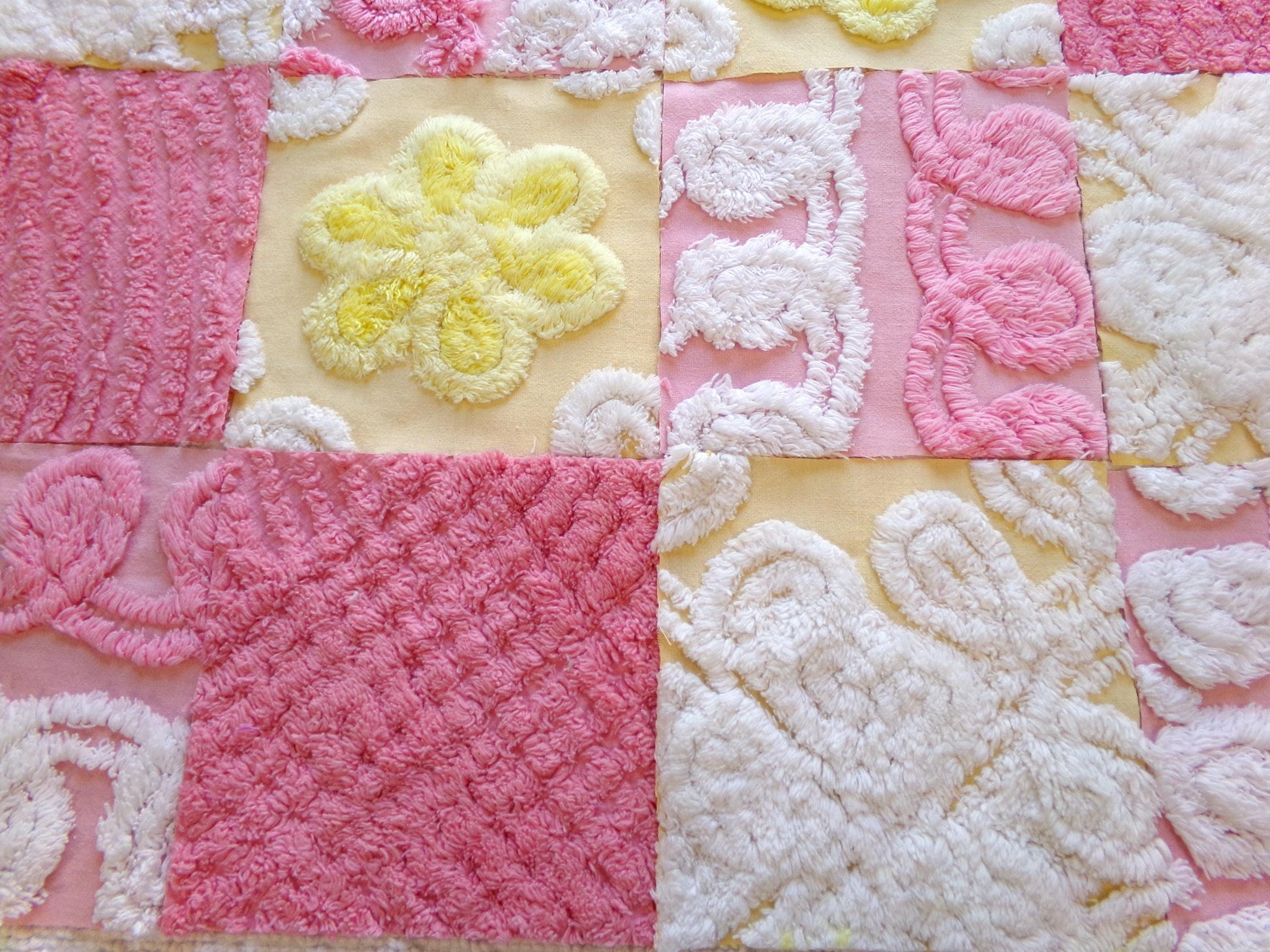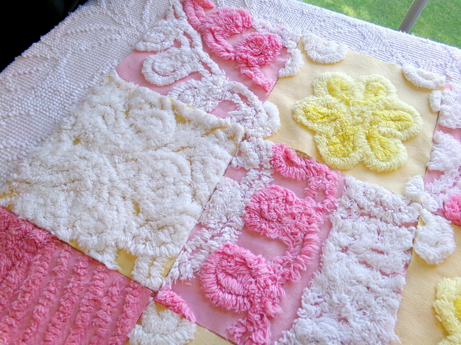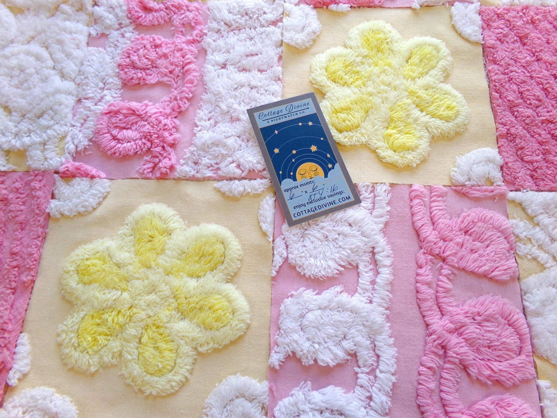 see more, cottagedivine.comNeed a little sunshine in your day today? This set of 16 vintage chenille fabric blocks in a medley of bright yellows and happy pinks will make you smile.