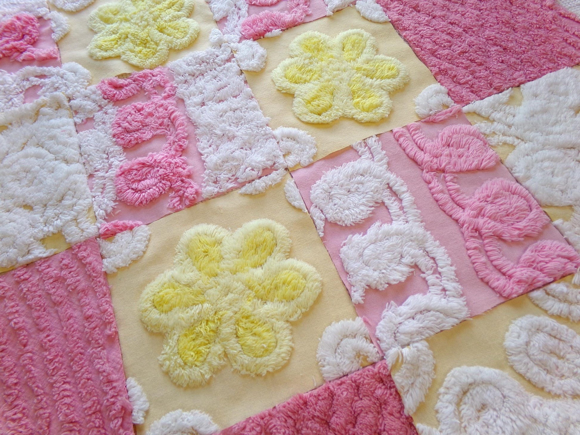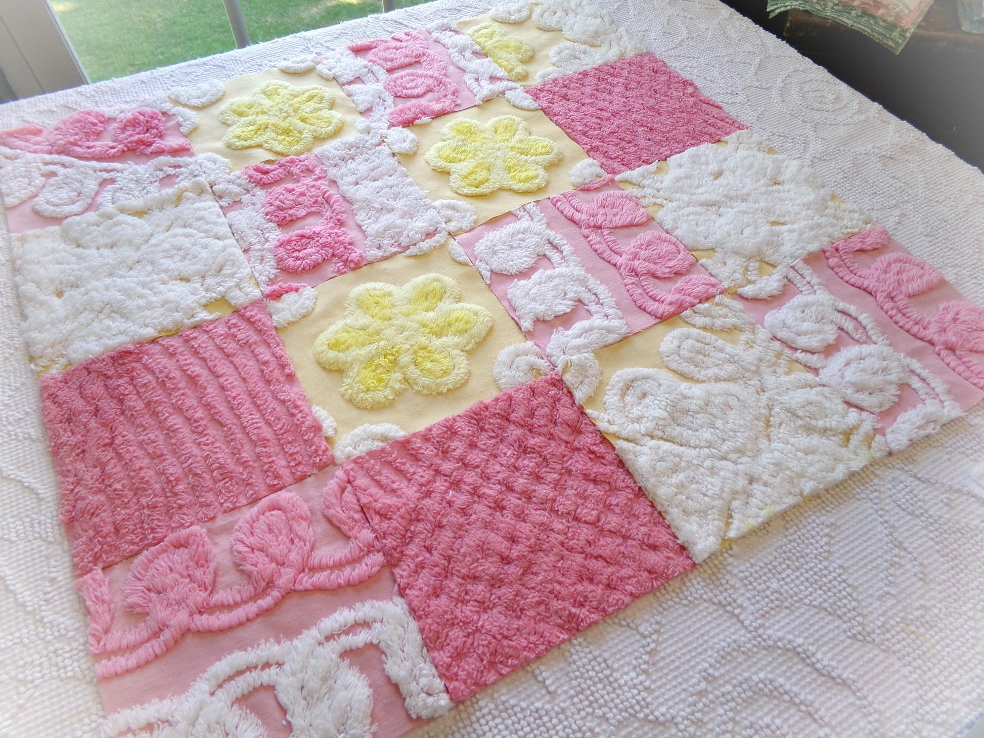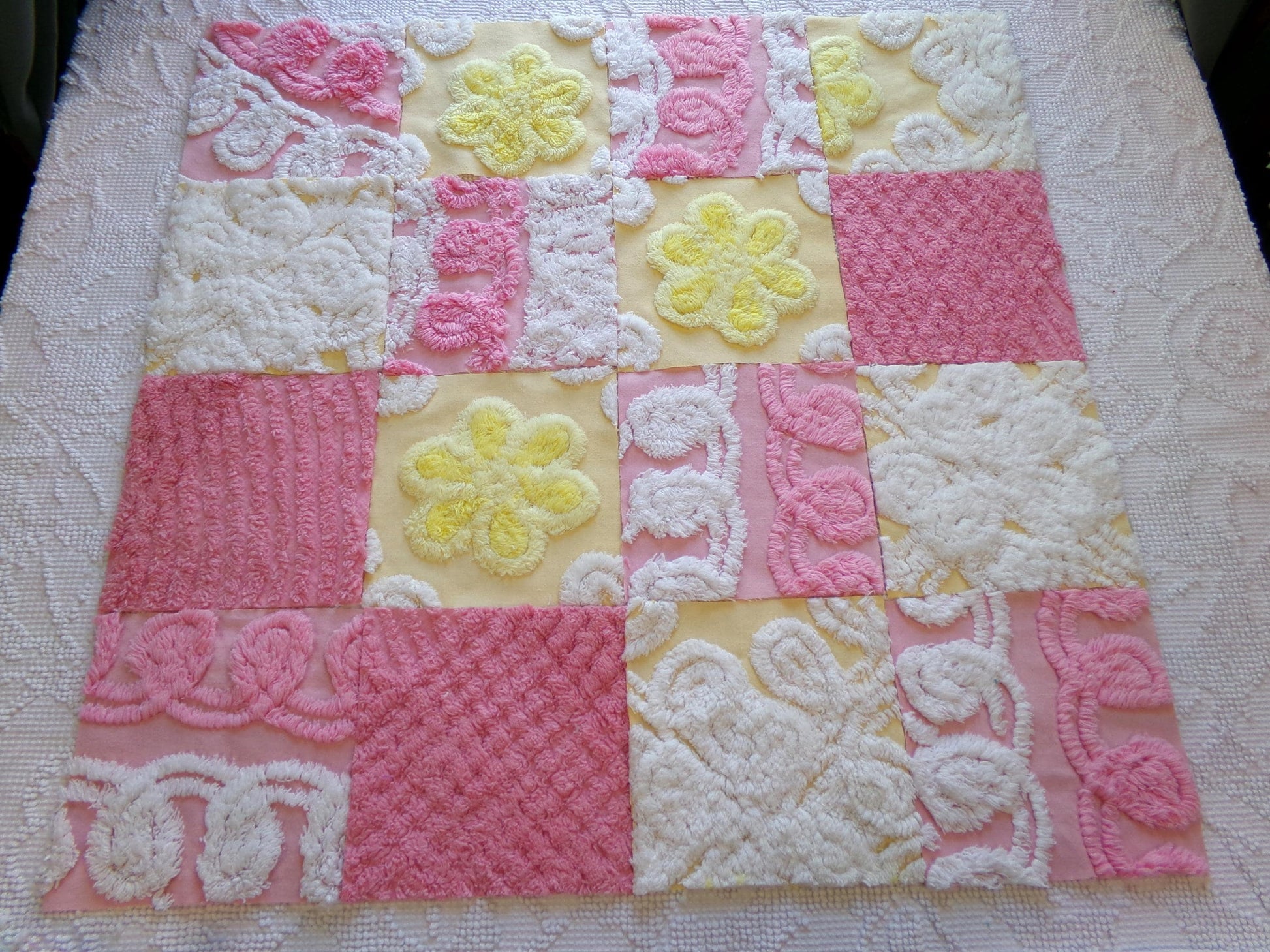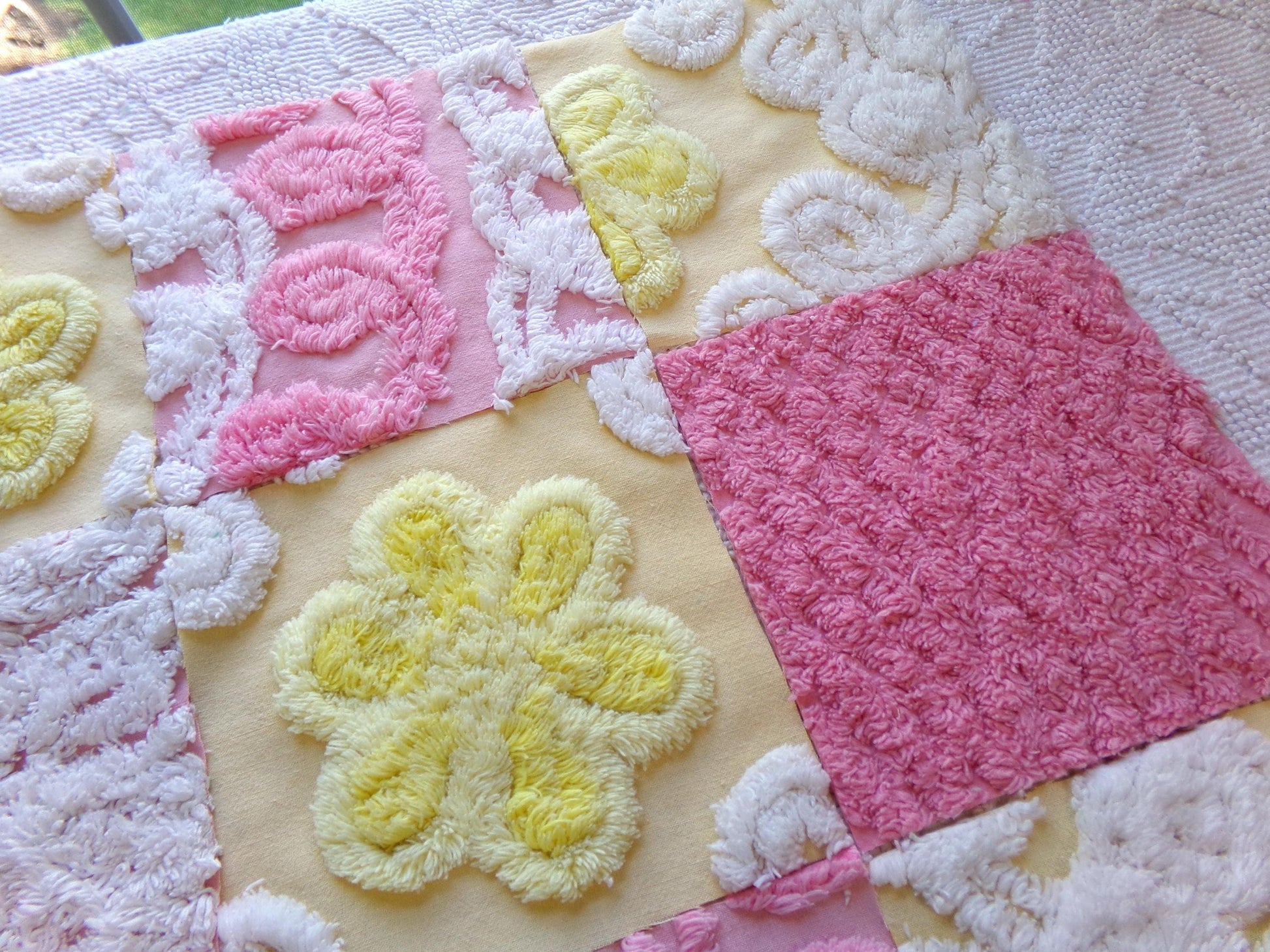 see more, cottagedivine.comNeed a little sunshine in your day today? This set of 16 vintage chenille fabric blocks in a medley of bright yellows and happy pinks will make you smile.