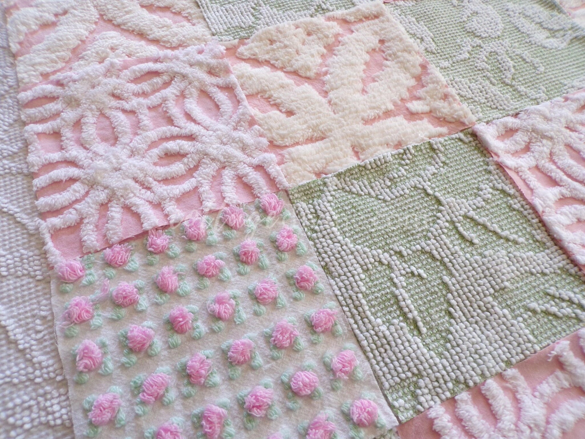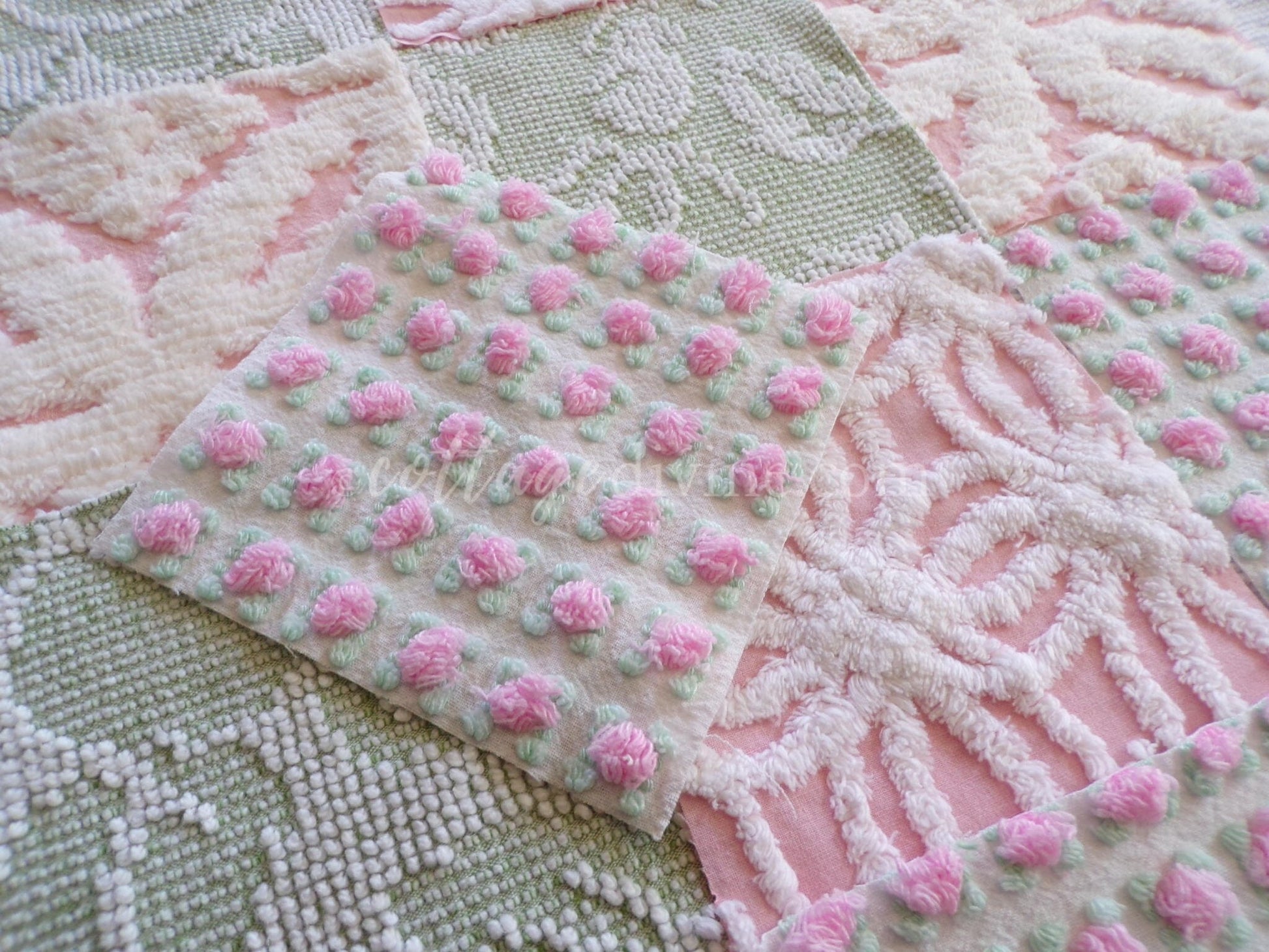 "Rose Blooms" is a beautiful assorted medley of 16 vintage 6" chenille quilt squares I've assembled for your crafting enjoyment.You'll receive 4 each of the following patterns: pink & white spider tuft; classic pink rosebud, woven hobnail in sage & cream, plush pink & white geometrics. Additional sets available.
