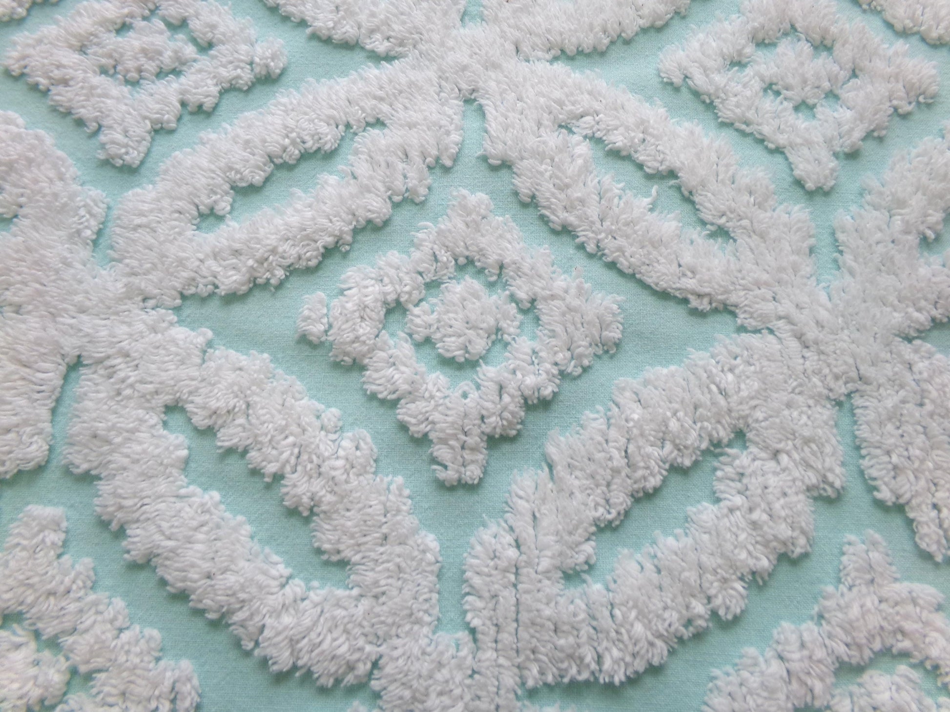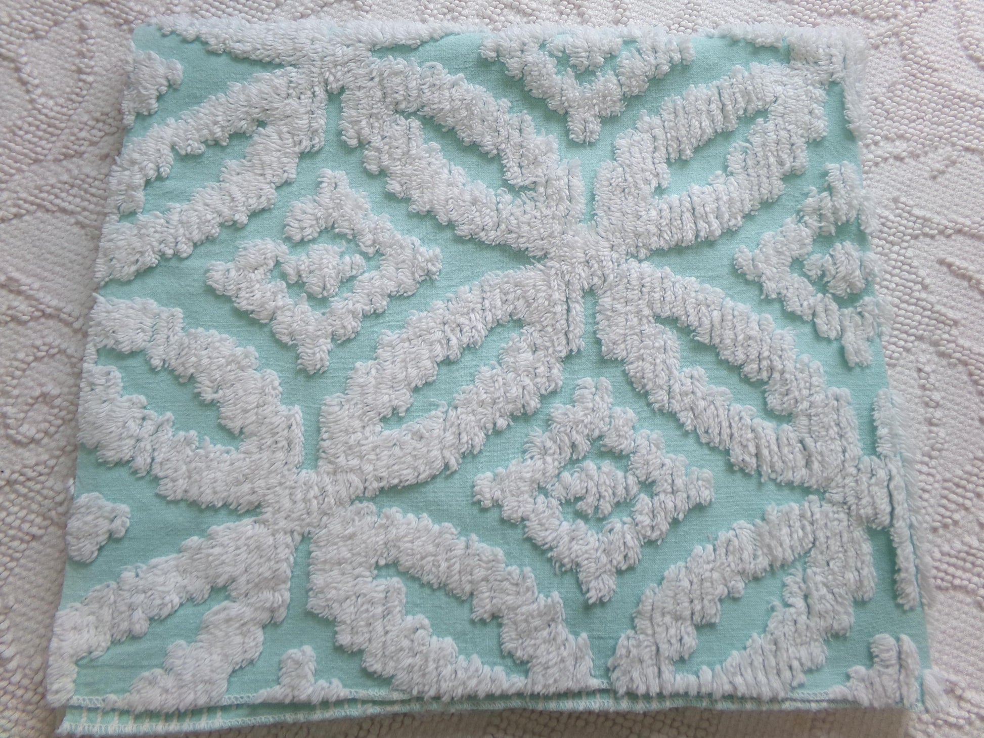 The color on this piece of vintage chenille fabric is so fresh and calming, in a pleasing shade of aqua tufted with white sculpted geometric petal designs.Measures about 20" x 24" inches. 100% cotton. Versatile enough to incorporate into a range of design concepts, from cozy cottage charming to modern chic.