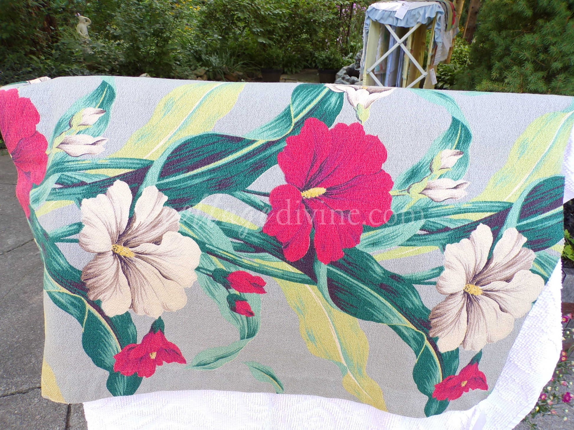 see more, cottagedivine.comSalvaged MCM tropical barkcloth fabric (18" x 28" inch piece) in an amazingly brilliant tropical hibiscus botanical print. Vivid colors are set on a steely grey background.