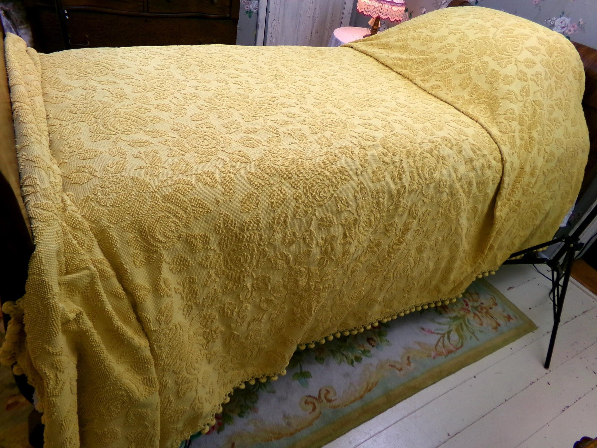 This gorgeous full size vintage chenille bedspread is the perfect blend of classic texture and modern boho style - in a warm, welcoming sunflower honey golden blonde colorway. It features a traditional hobnail "Imperial Rose" woven design by the well-known manufacturer Fieldcrest. Love that pom pom trim, too.If you're looking to add warmth and retro style, this bedspread is incredibly versatile. The solid color palette means it layers beautifully with any decor, and that textured chenille adds just the right amount of visual interest without overwhelming your space.