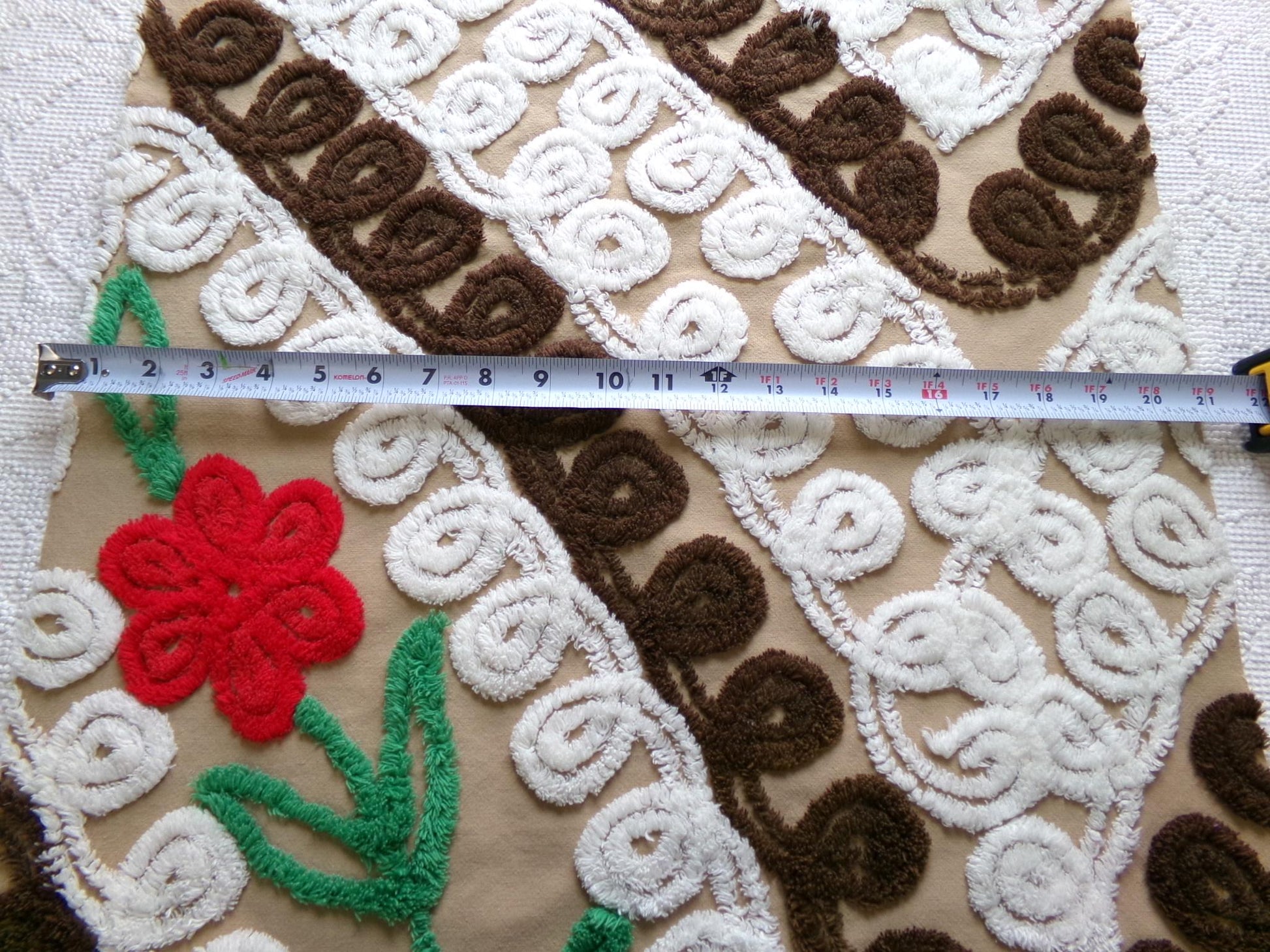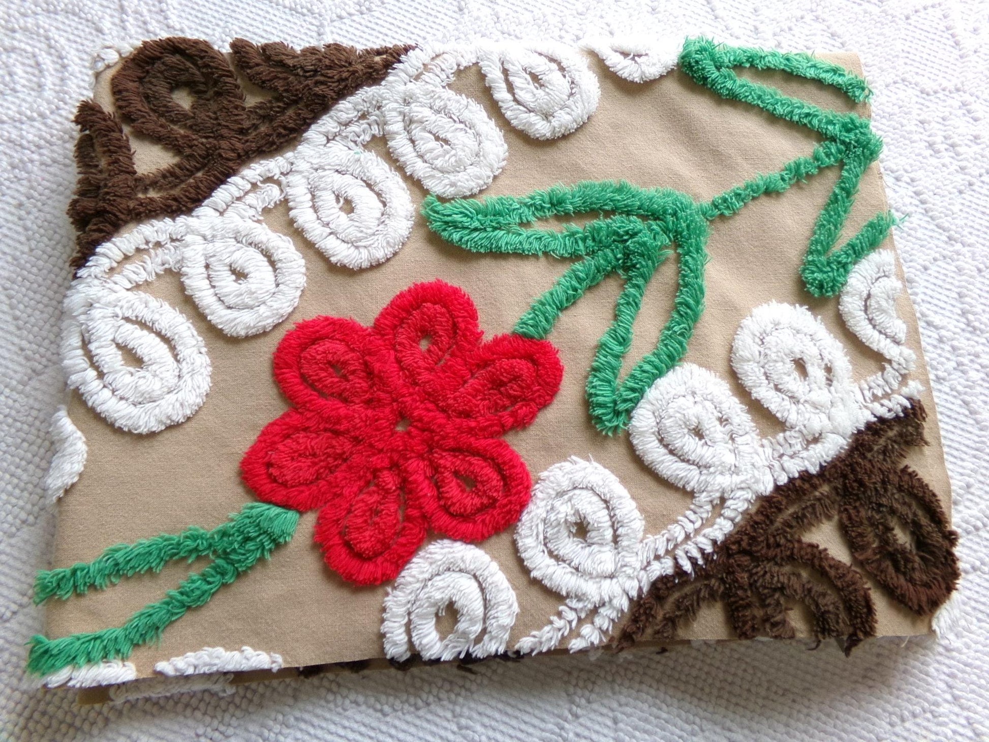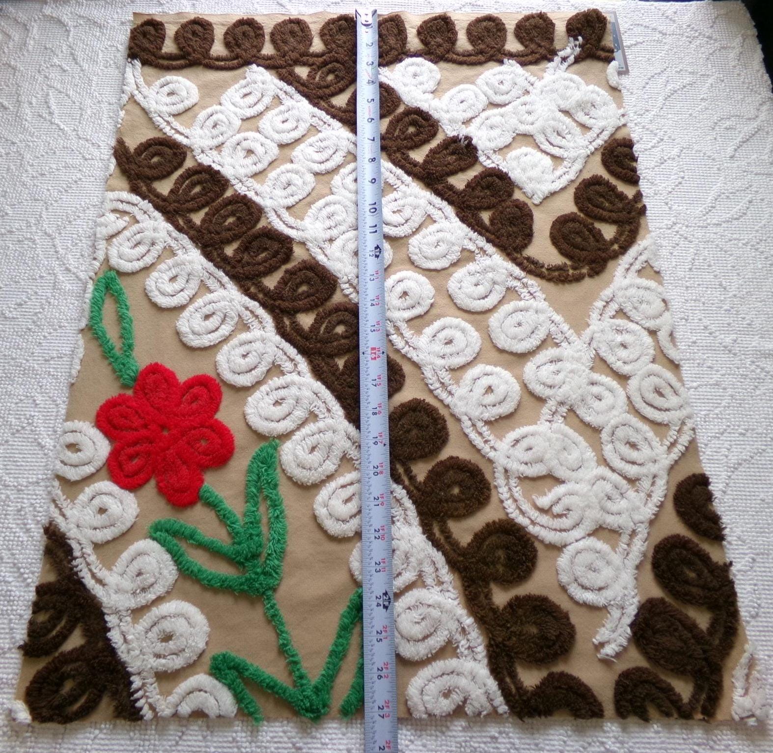 How do you envision upcycling this vintage chenille fabric? It is such a unique piece that might look great as a small wall hanging, an oversize pillow...or whatever else your creative mind imagines. Beautiful contrast chocolate and white curlicues emphasize a single red rose flower...like chocolate cake with a little "cherry" on top :)Measures approx 20" x 26" inches. 100% cotton. You may spot a few light tuft skips or pinholes; this is original fabric cut from a late 1940s vintage chenille bedspread.
