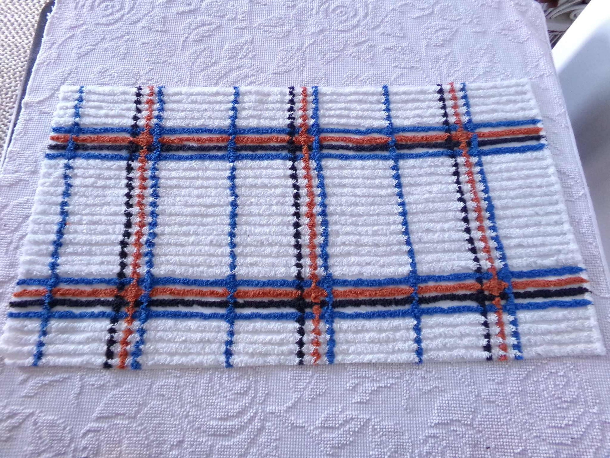 Here is a unique piece of vintage chenille fabric in a wide-set geometric plaid pattern, situated on a white bkgd. Plaid stripes create a striking appearance in colors of rust, royal blue, and washed black.Fabric piece measures approx 15.5" x 28" inches. 100% cotton, soft tufting.