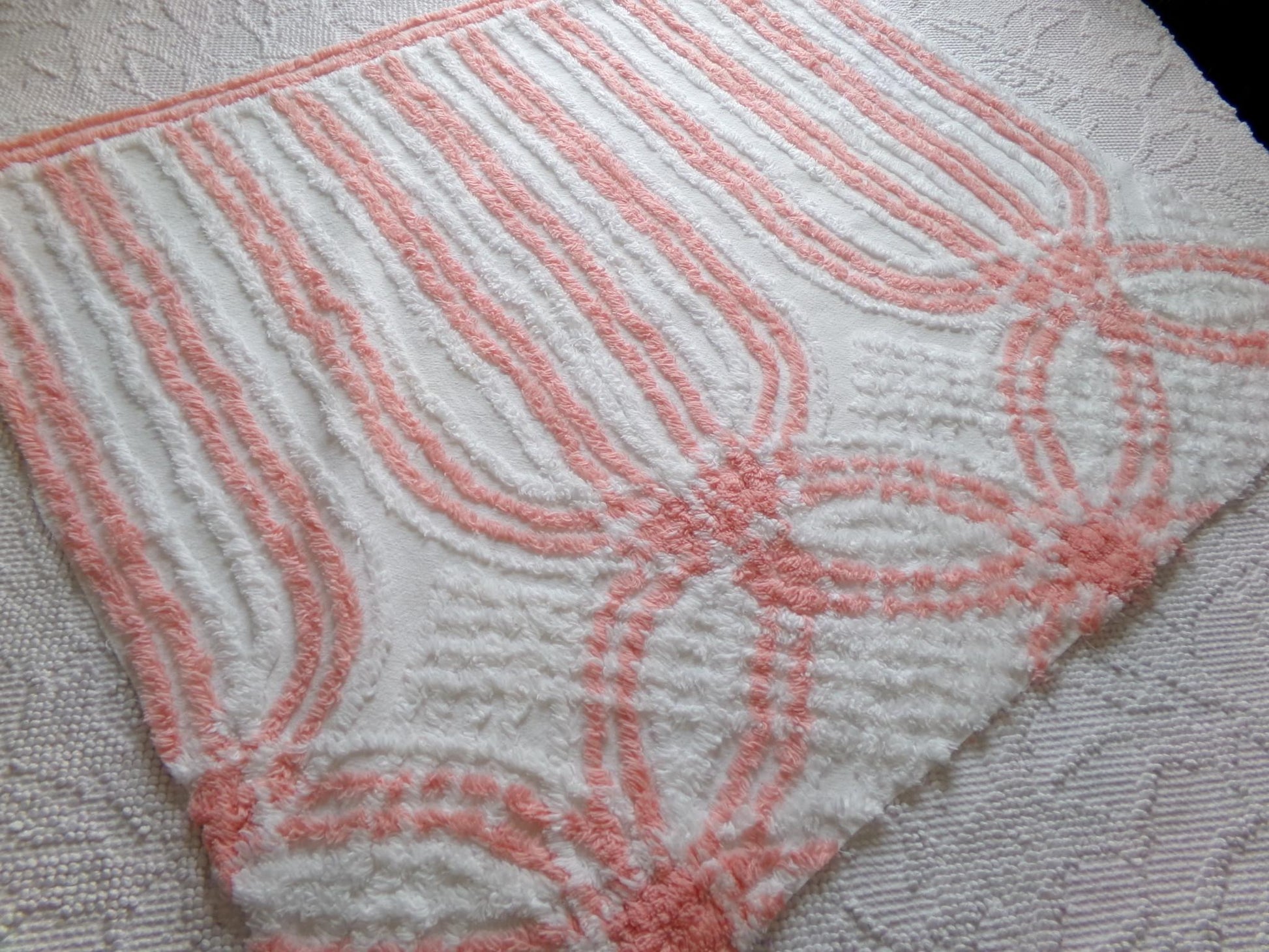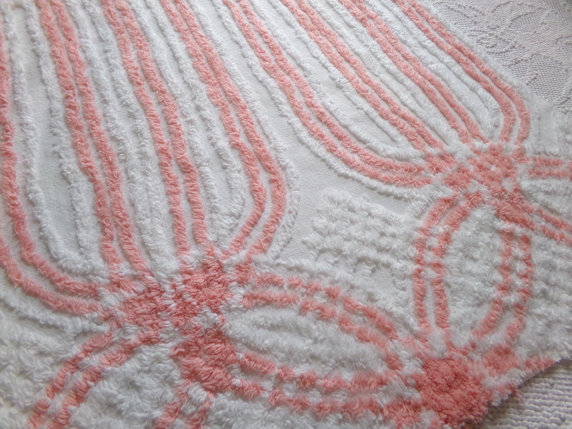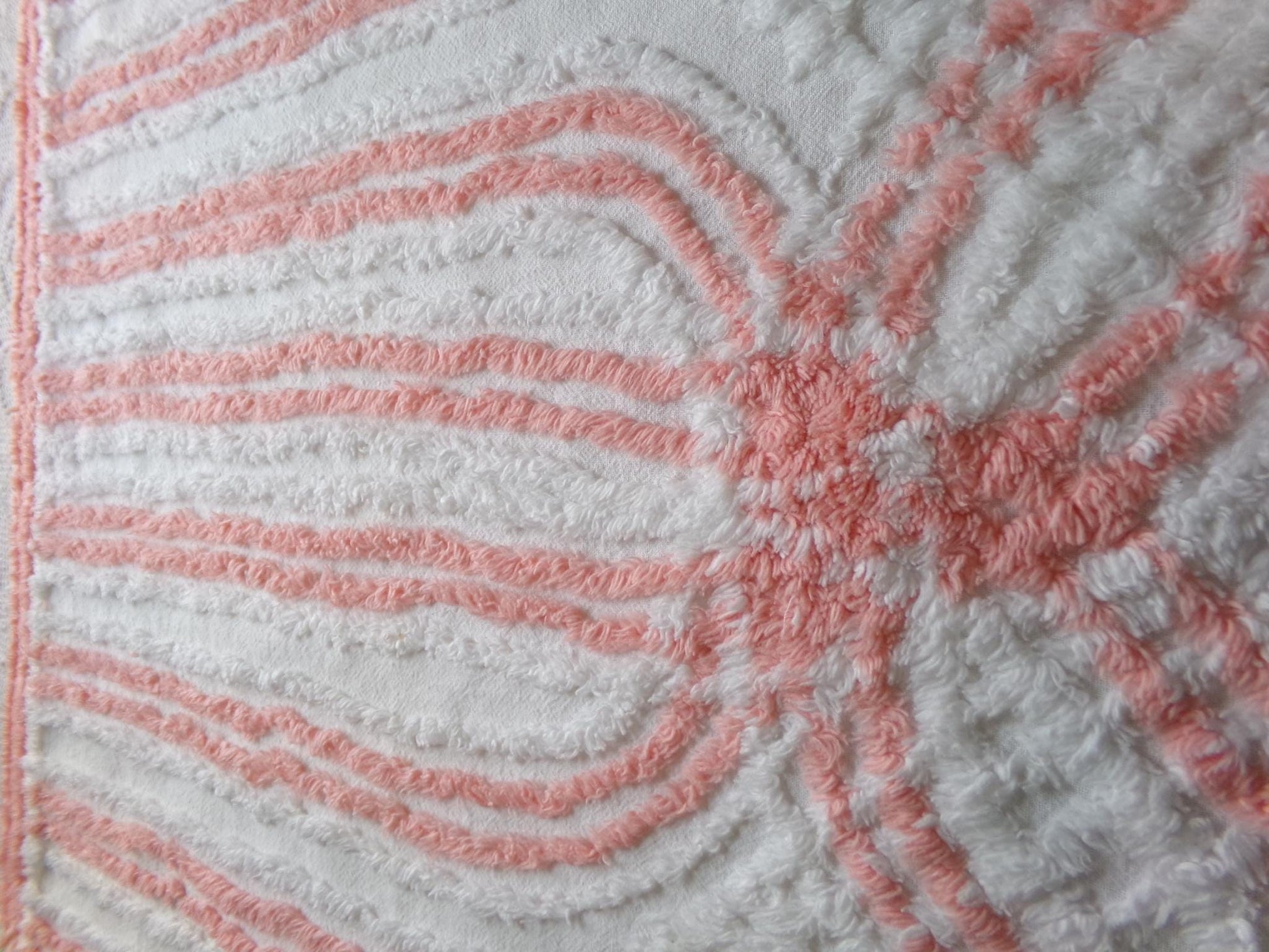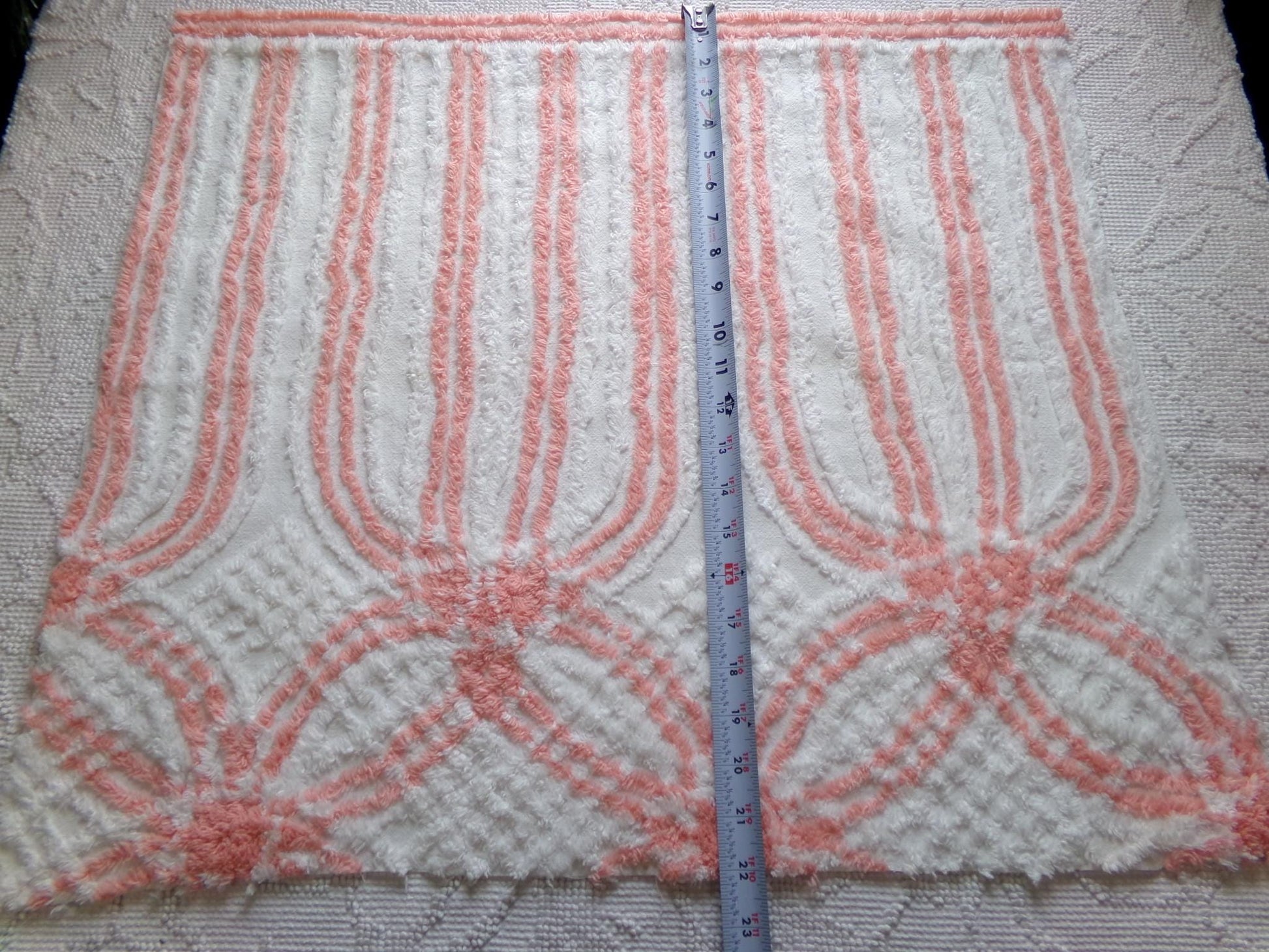 This is such a pretty and unique piece of vintage chenille fabric. It features a striking cathedral stripe design in a delightful shade of peach on white. Summery, uplifting vibes.Measures approx 22" x 24" inches. 100% lightweight cotton. Few shabby attributes such as a minor pinhole.