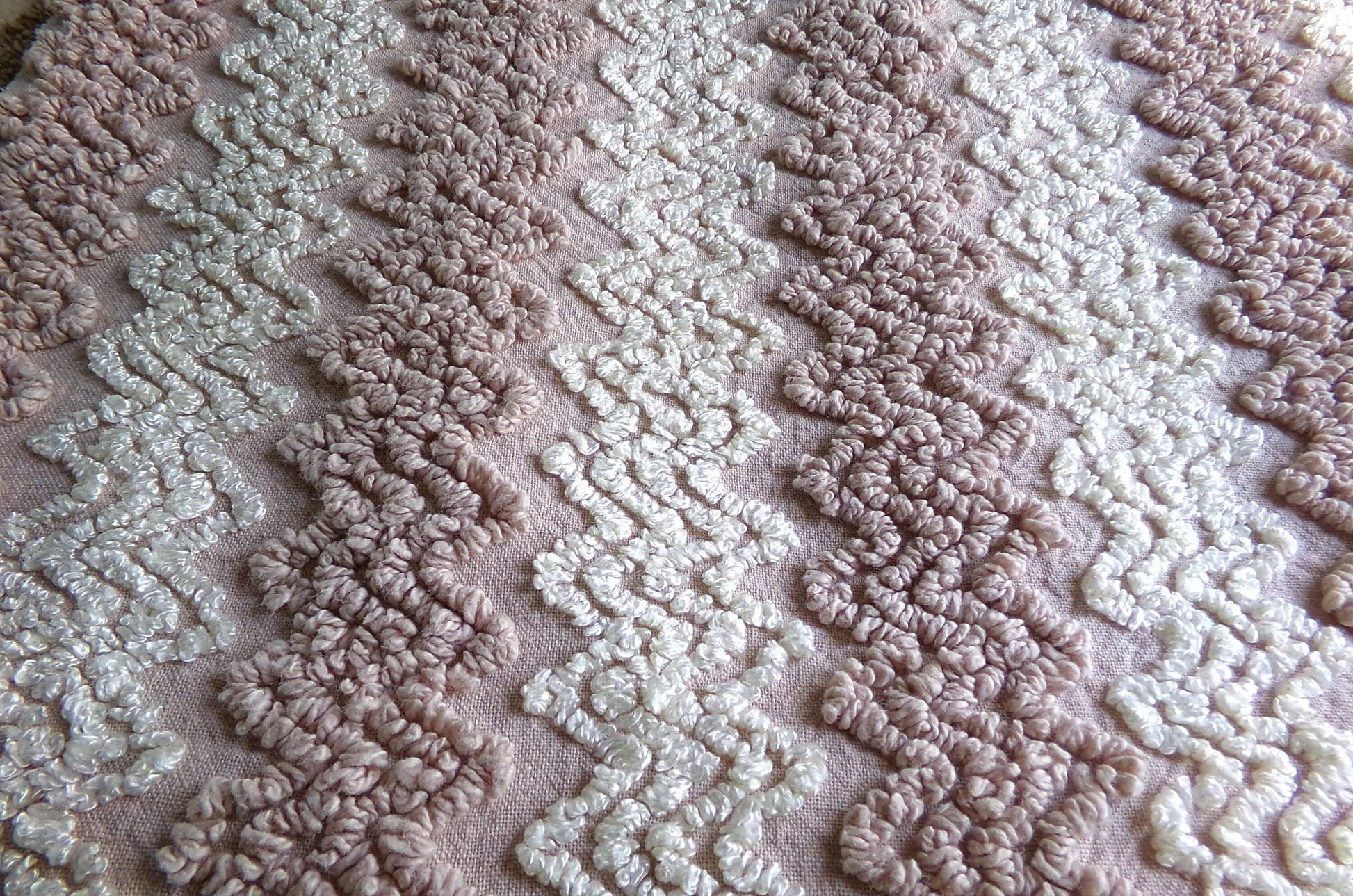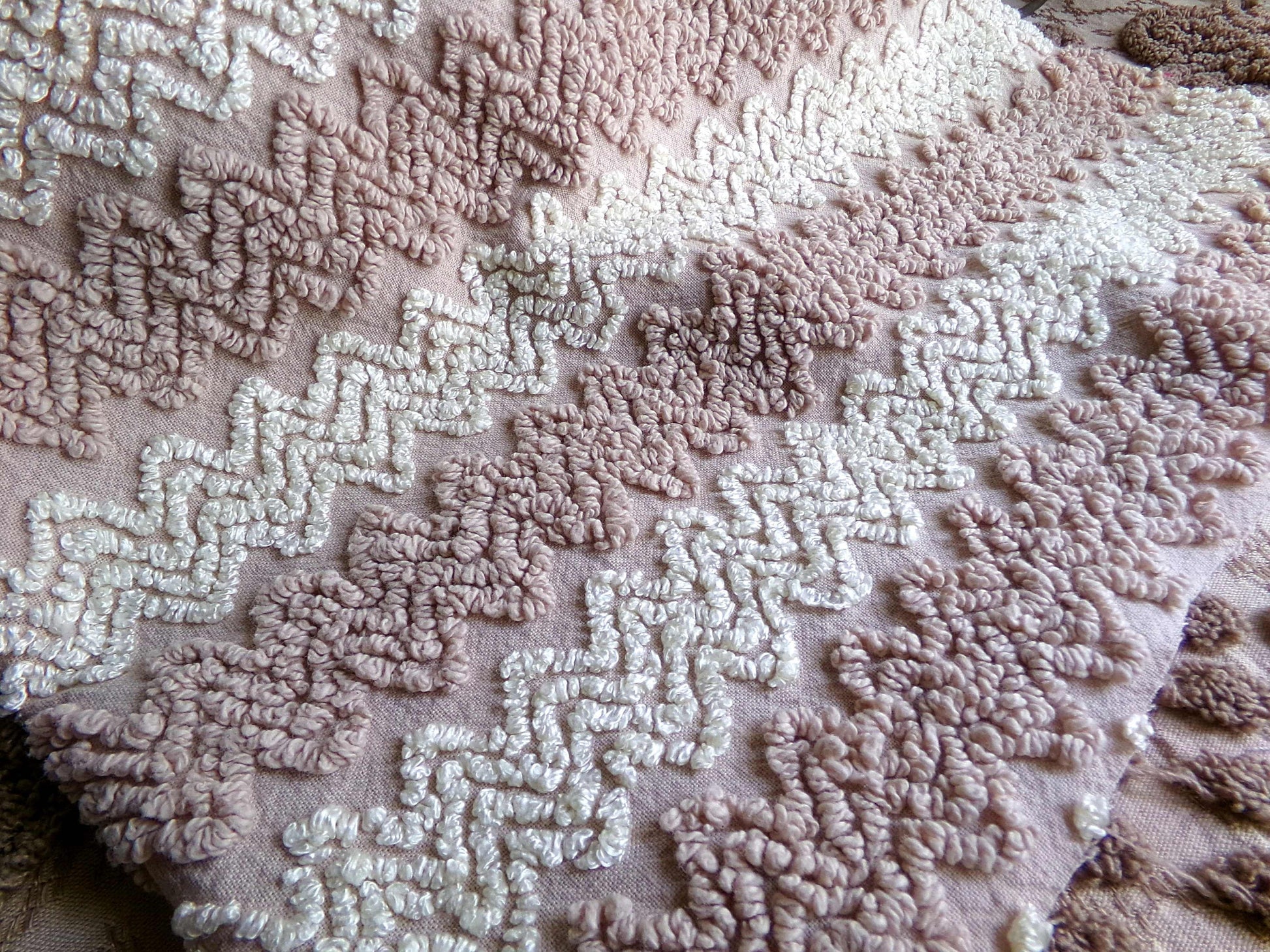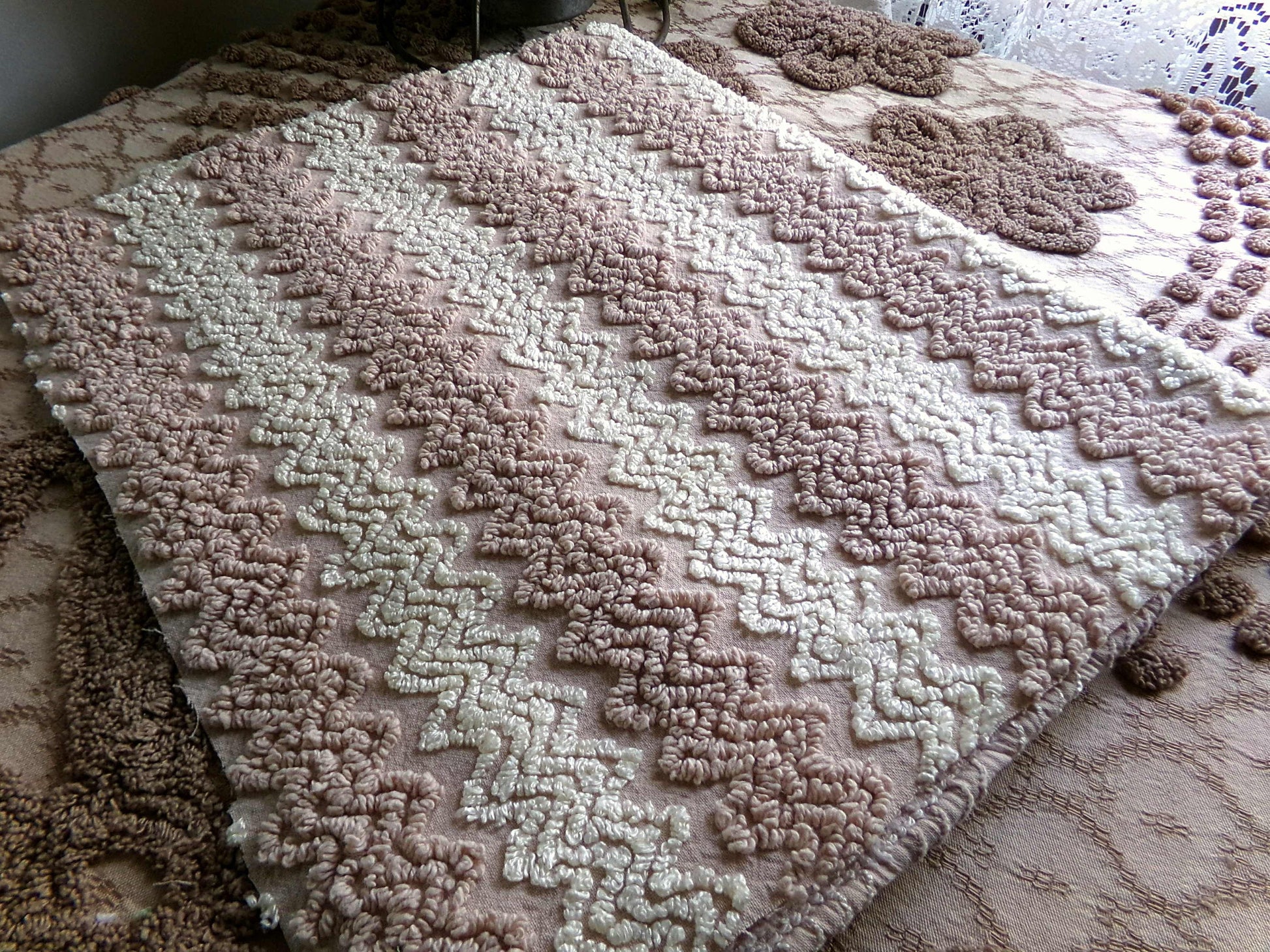 If you love warm cozy colors and fabric that provides textural interest, you'll appreciate this vintage chenille piece. Alternating toasted mocha & vanilla creme texturized zig zags are set on a coordinating bkgd.A favorite pattern in handmade chenille quilts, this colorway offers a nice versatility, incorporating well in a range of design concepts, from vintage to modern.