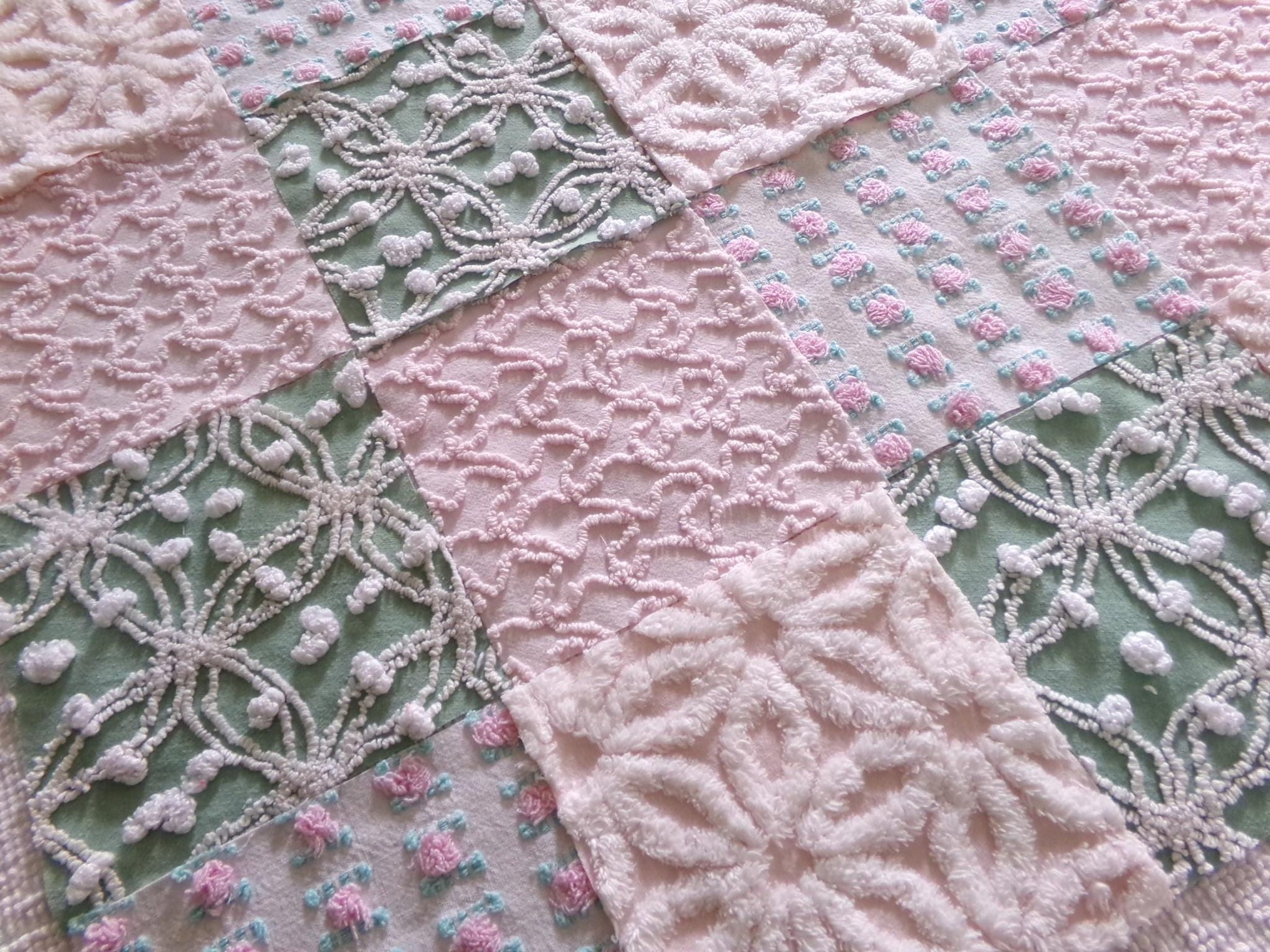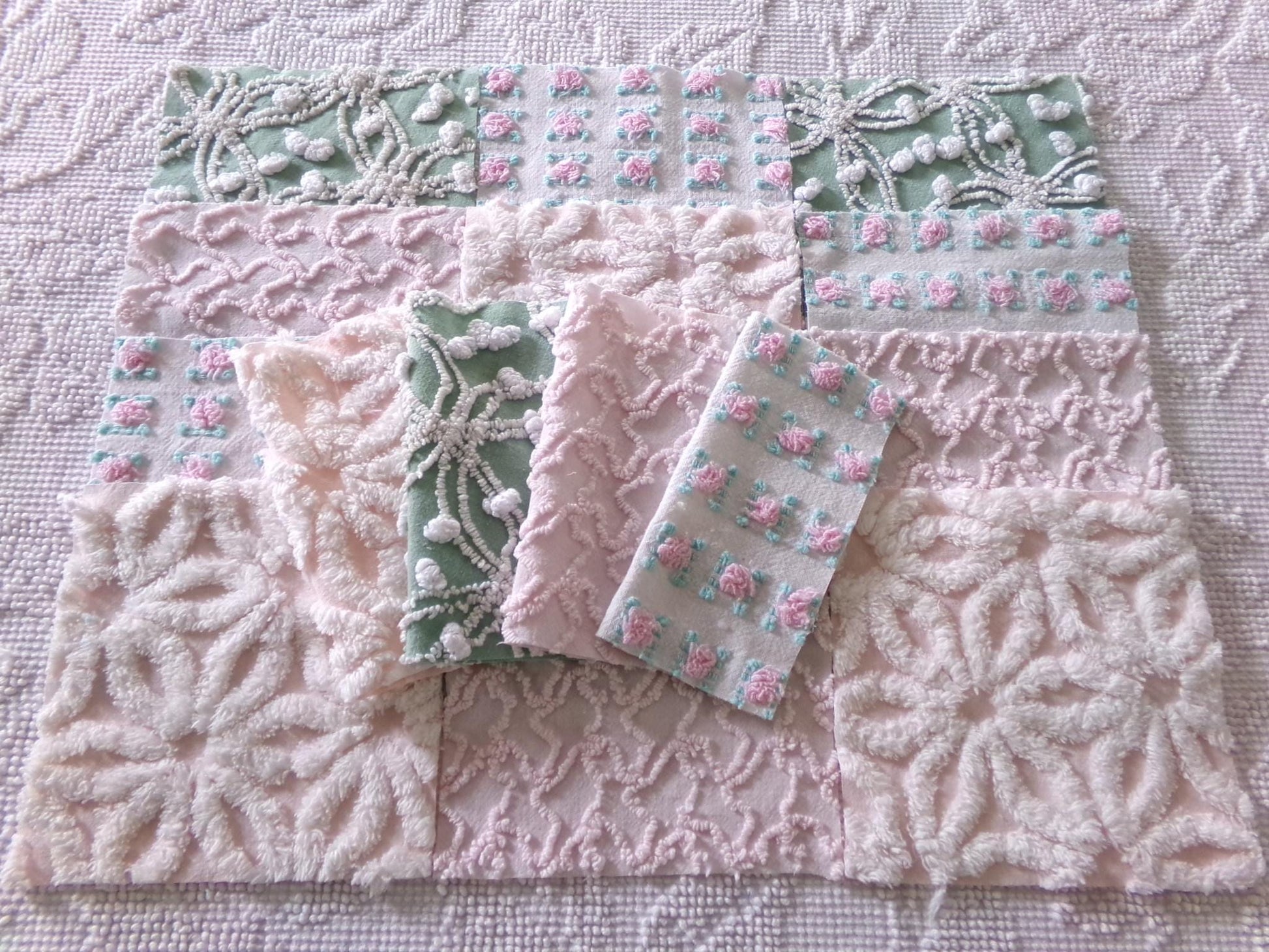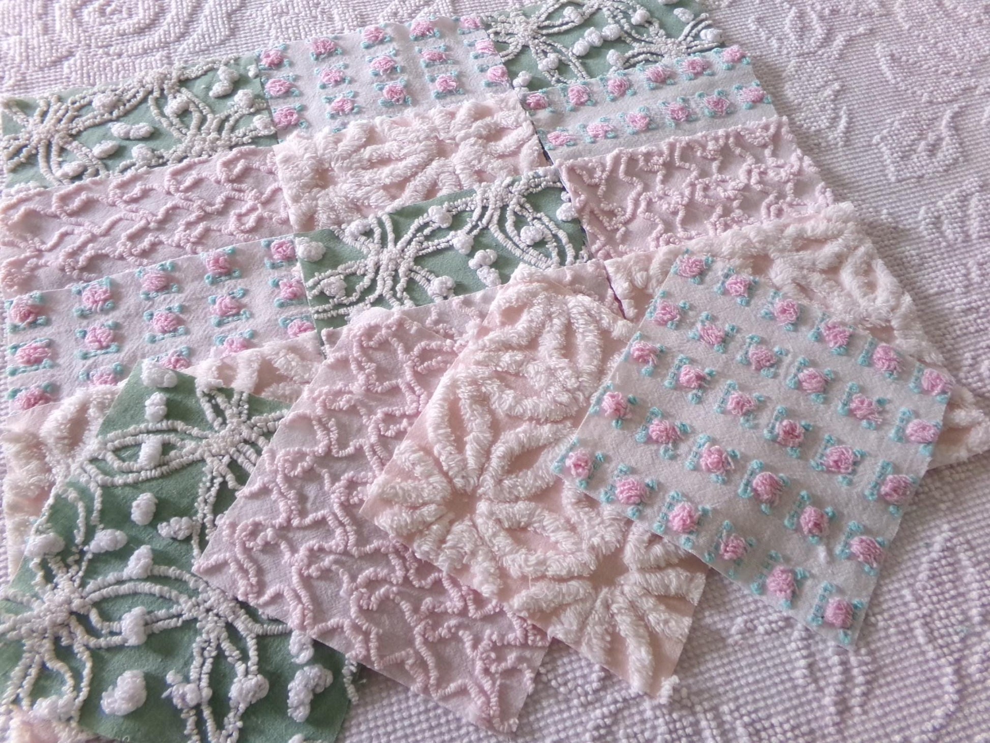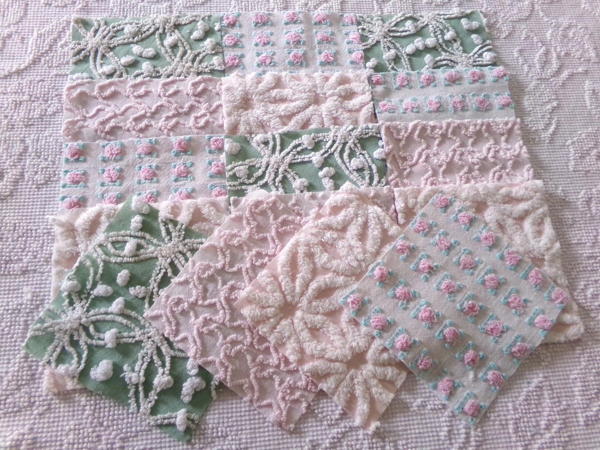 This is a lovely selection of 16 separate chenille fabric squares, reminiscent of a walk through granny's summertime garden. I chose gentle shades of pink with some highlights of white, accented with medium jade green for a pleasing presentation.You'll receive 4 of each: pink/white daisy, pink squiggle, petal pink rosebud, jade green & white needletuft