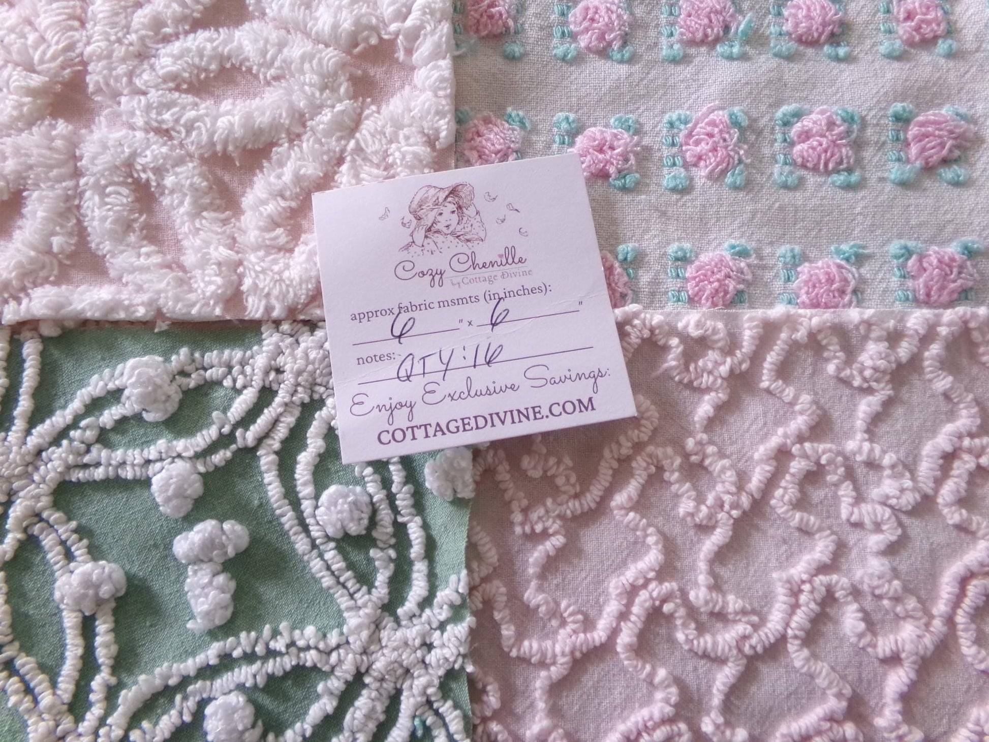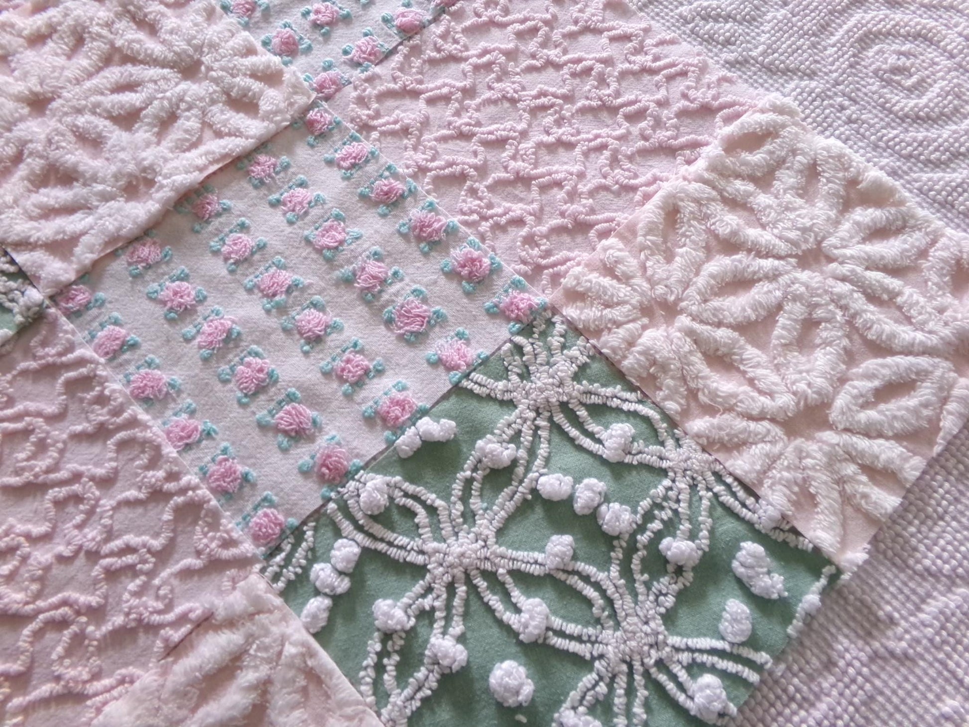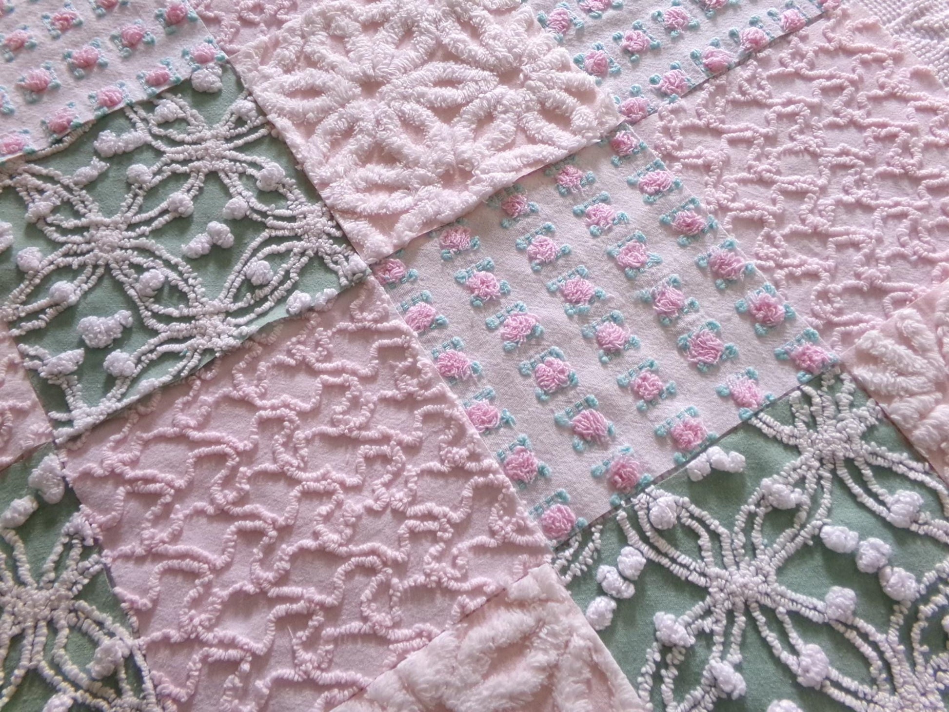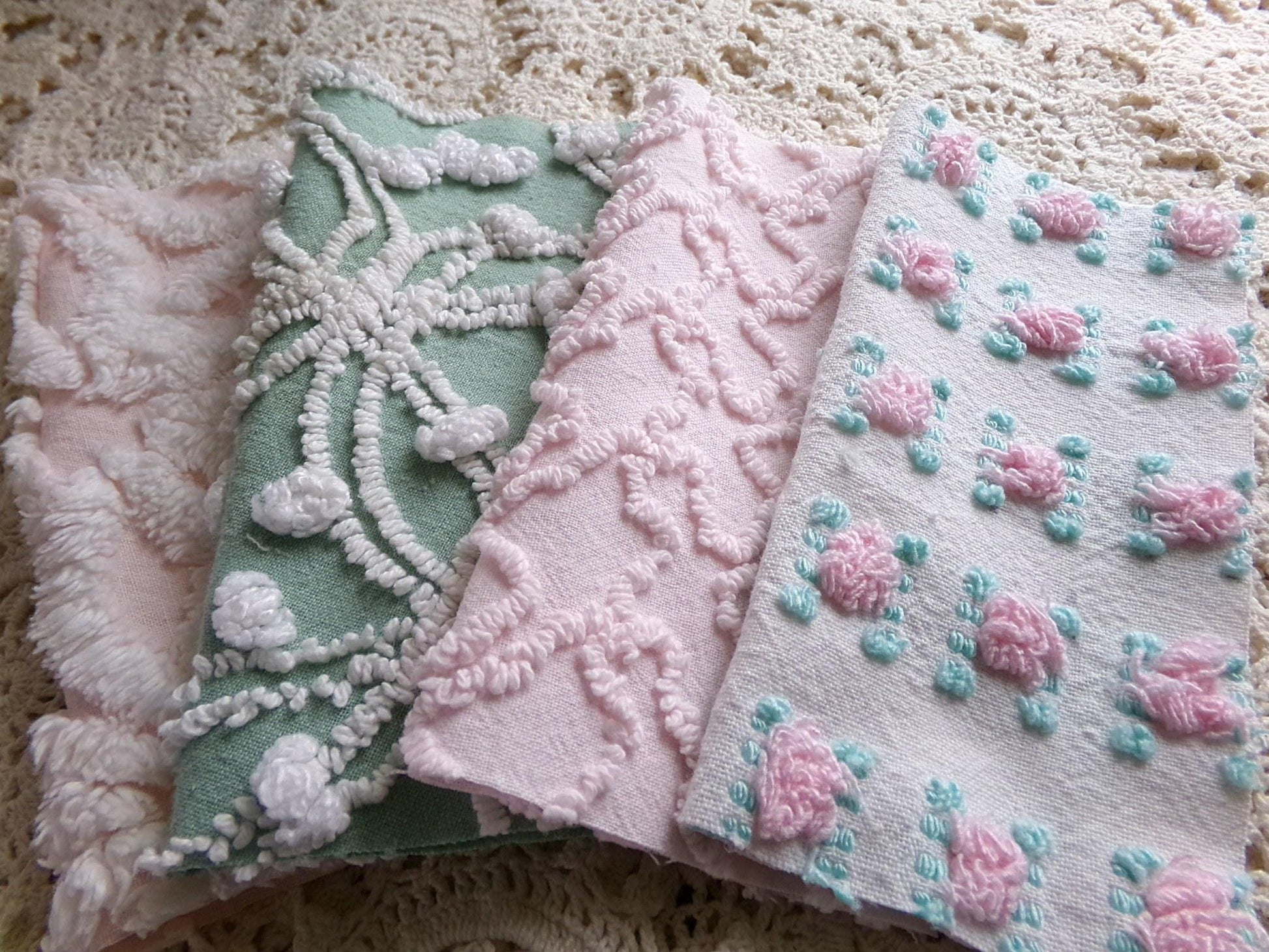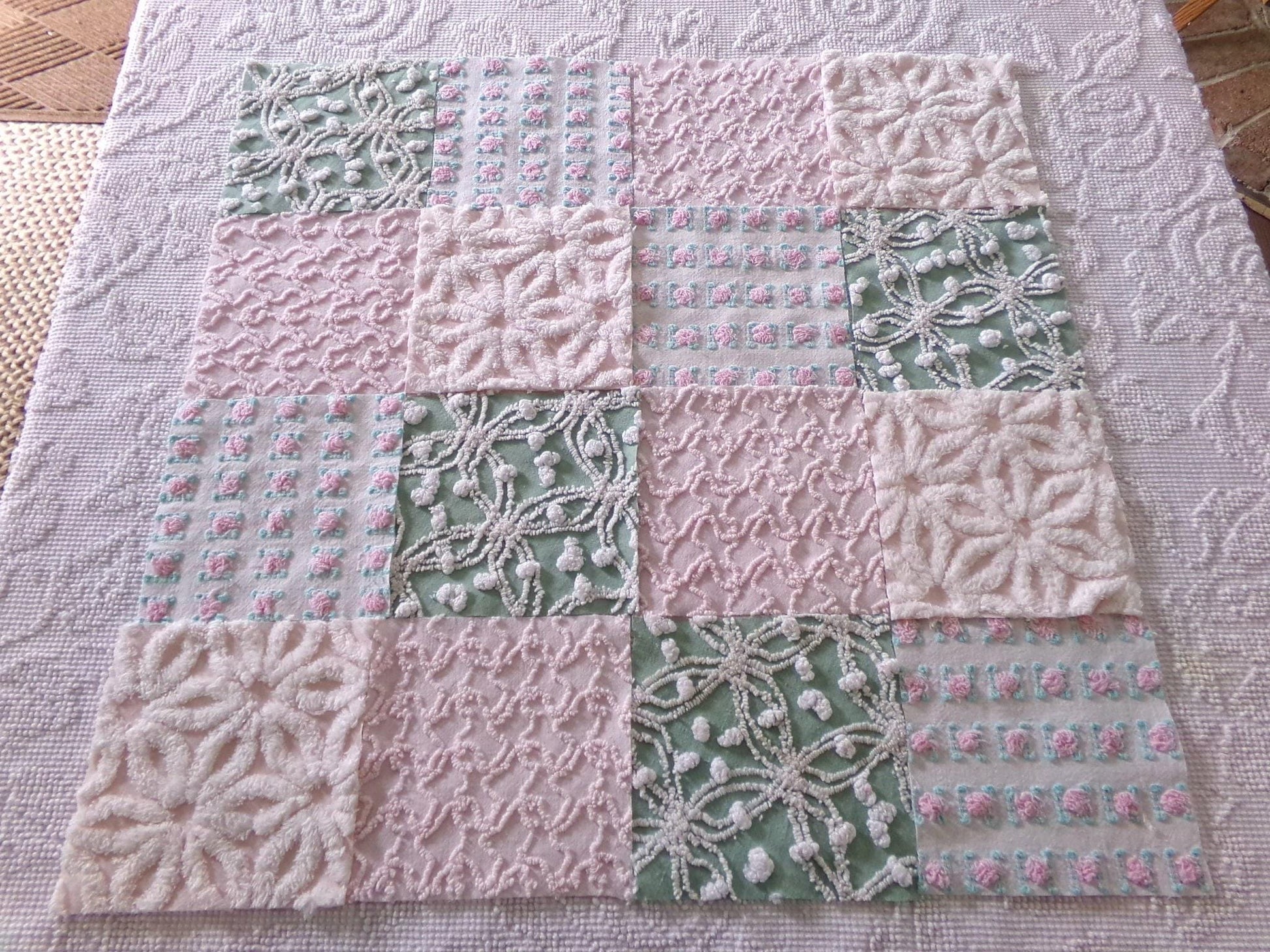 This is a lovely selection of 16 separate chenille fabric squares, reminiscent of a walk through granny's summertime garden. I chose gentle shades of pink with some highlights of white, accented with medium jade green for a pleasing presentation.You'll receive 4 of each: pink/white daisy, pink squiggle, petal pink rosebud, jade green & white needletuft
