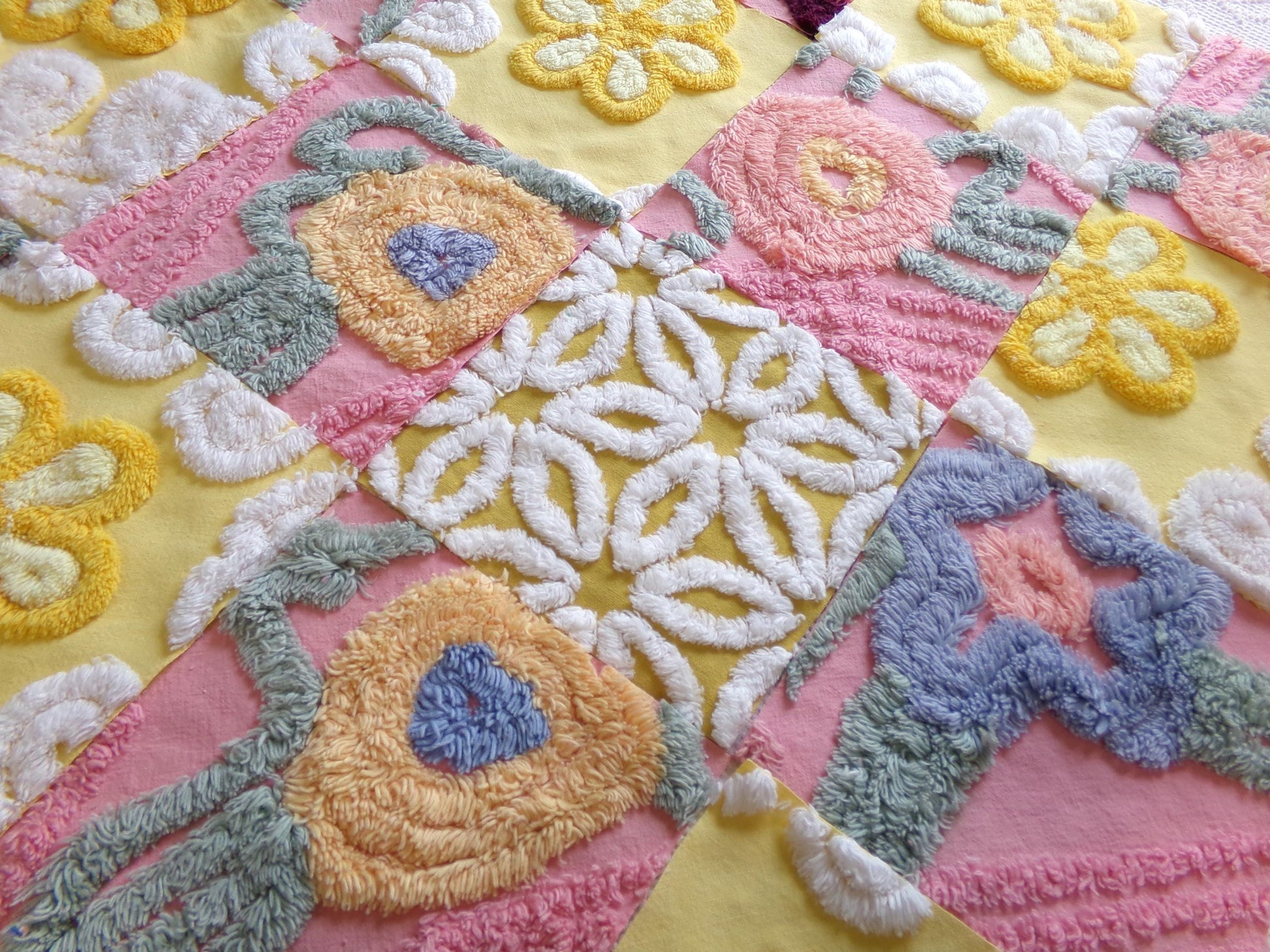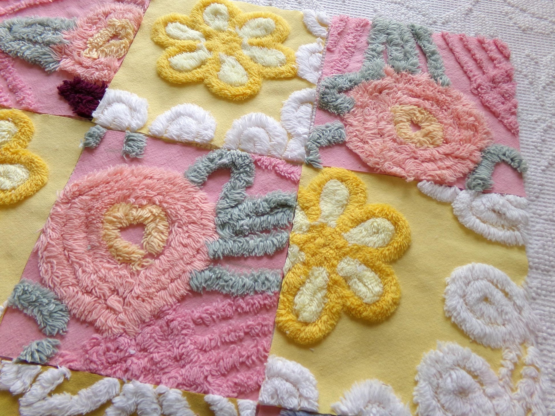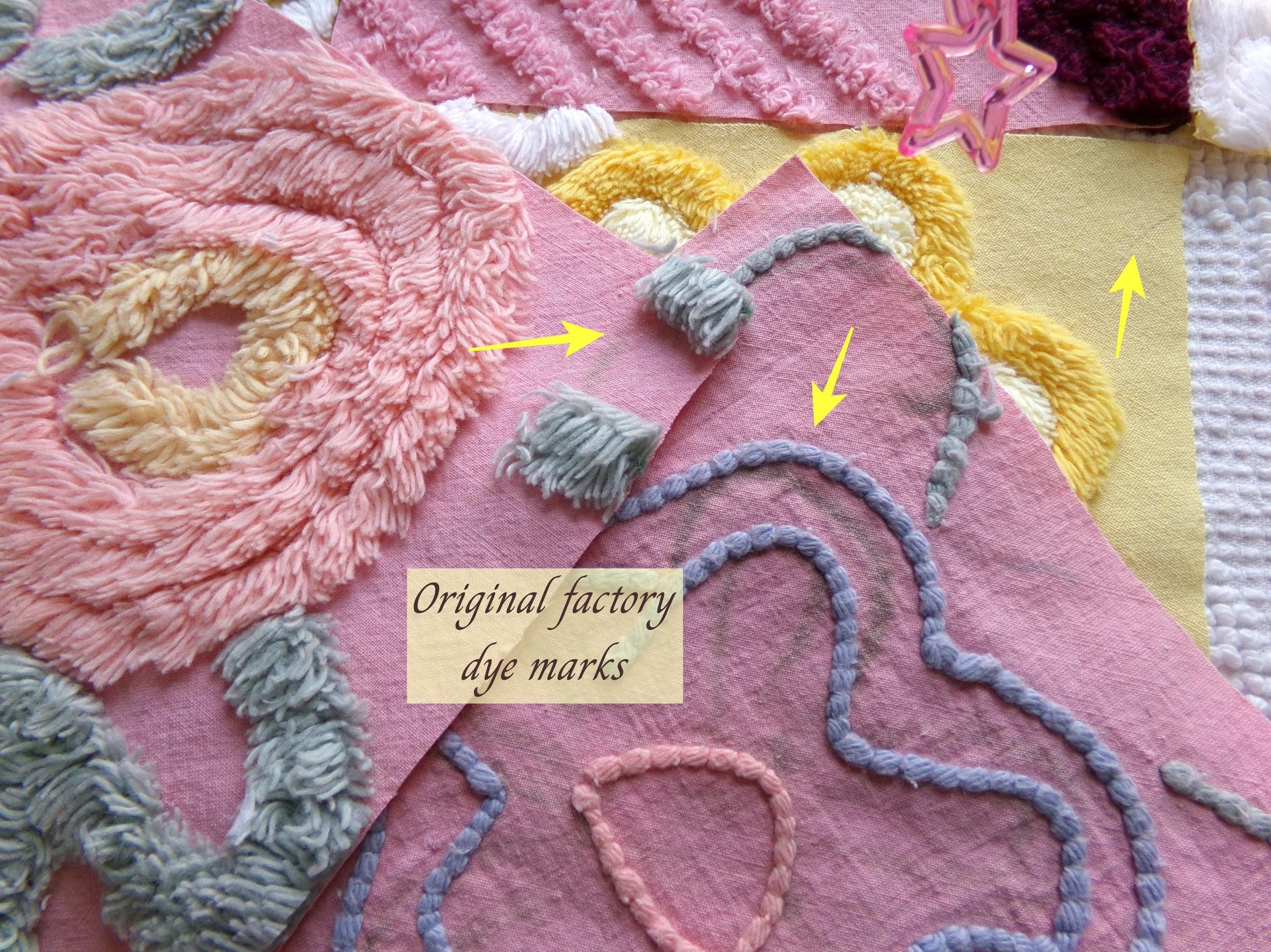 There is a lovely medley of designs in cheerful shades of butterscotch gold, sunny yellow, and deep rose pink. Some of the pink blocks were sourced from a NOS 1940s chenille bedspread still with factory dye markings - see final image. It's not a flaw, but will not wash out.