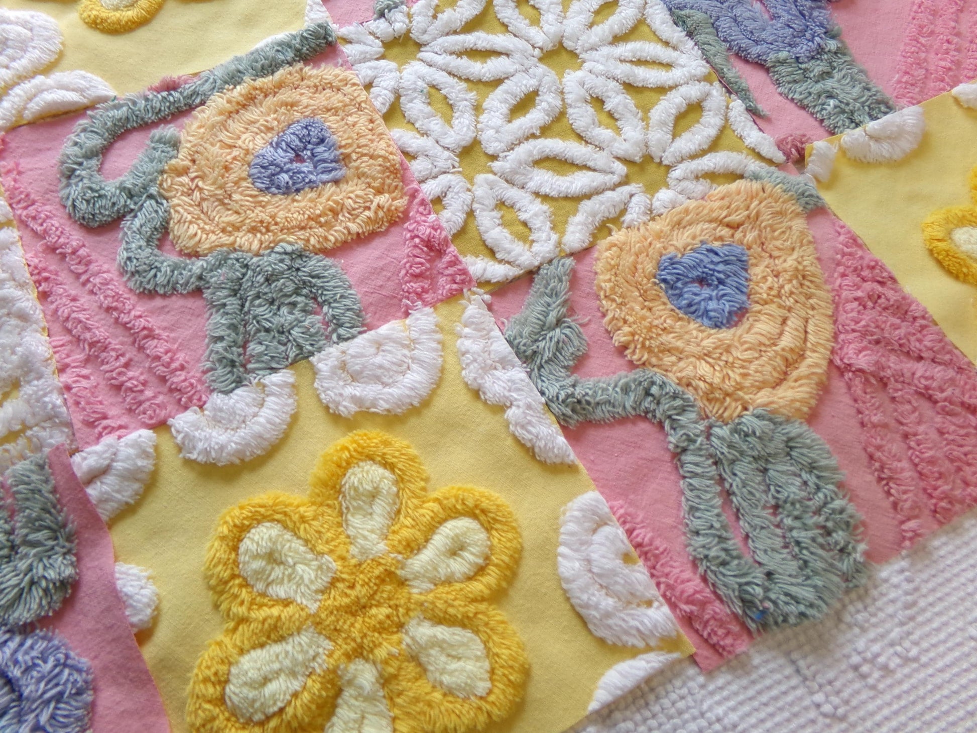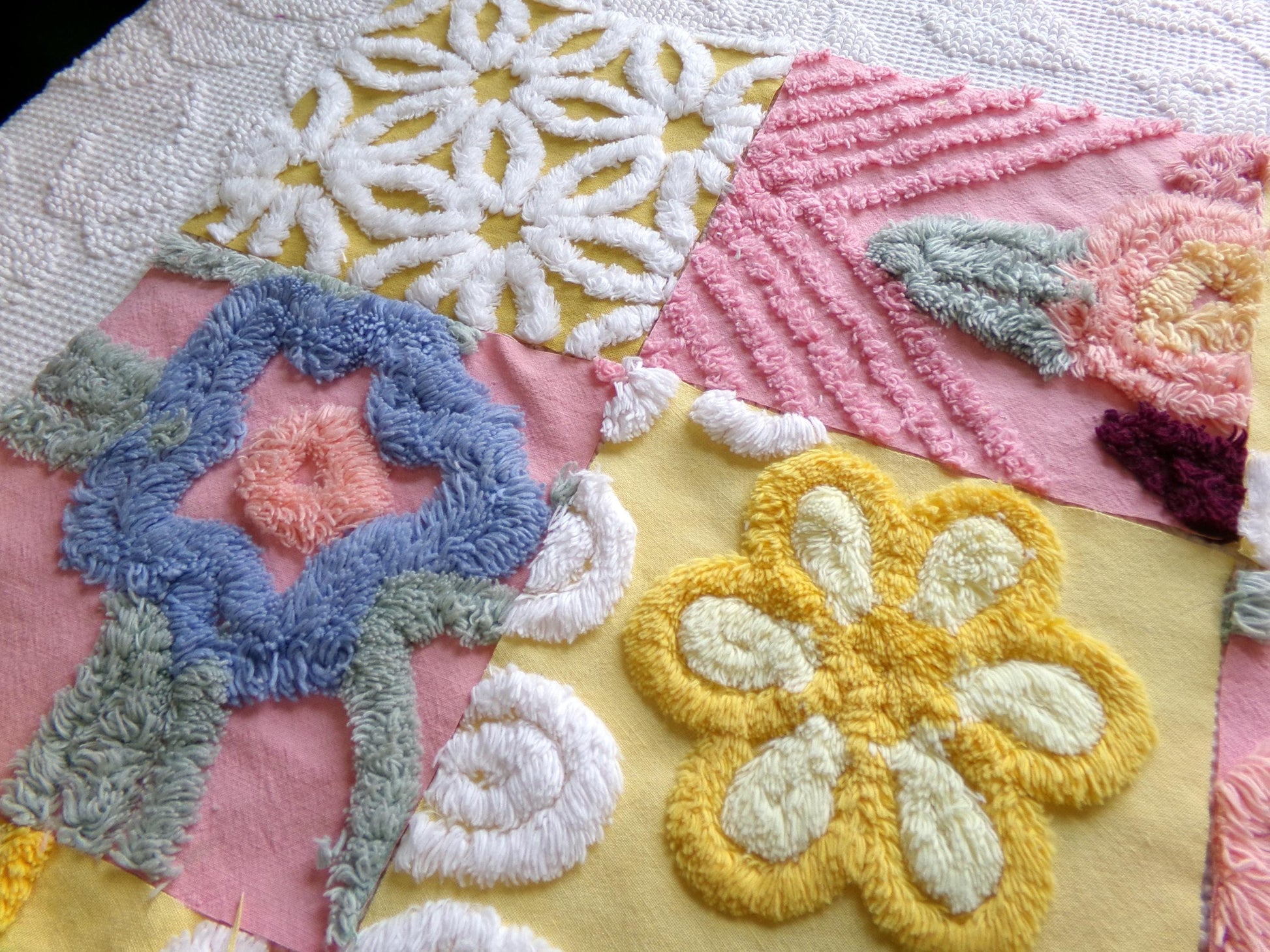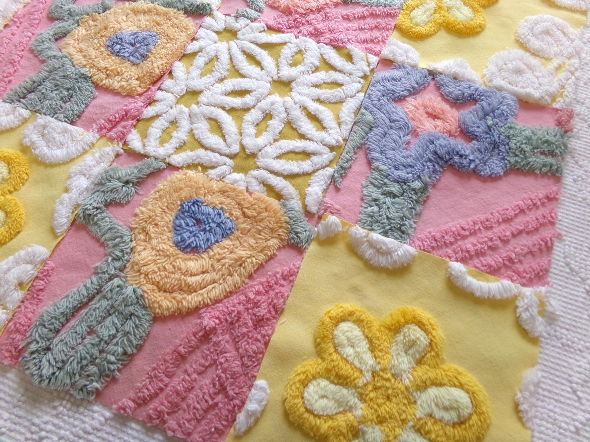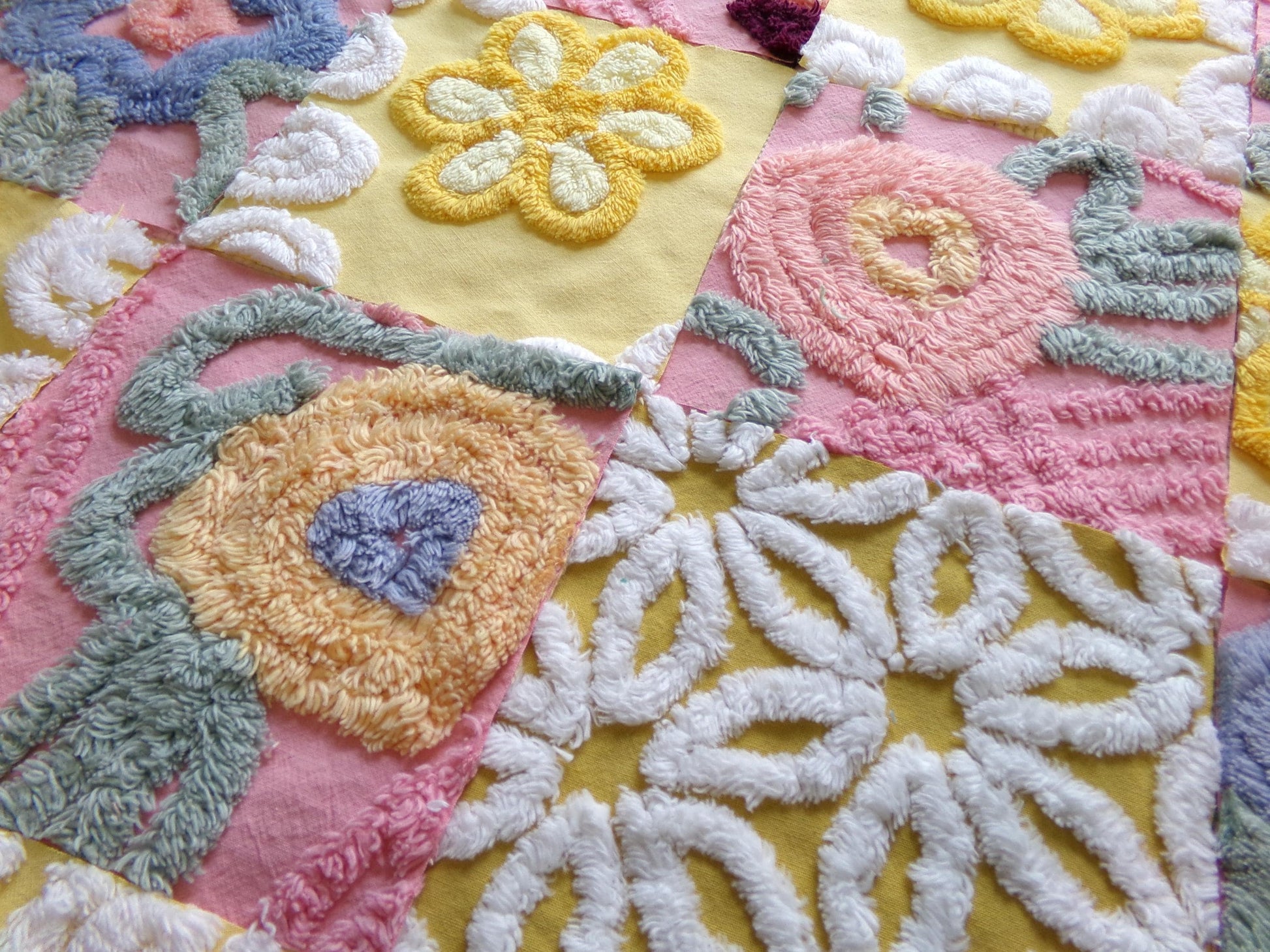 There is a lovely medley of designs in cheerful shades of butterscotch gold, sunny yellow, and deep rose pink. Some of the pink blocks were sourced from a NOS 1940s chenille bedspread still with factory dye markings - see final image. It's not a flaw, but will not wash out.