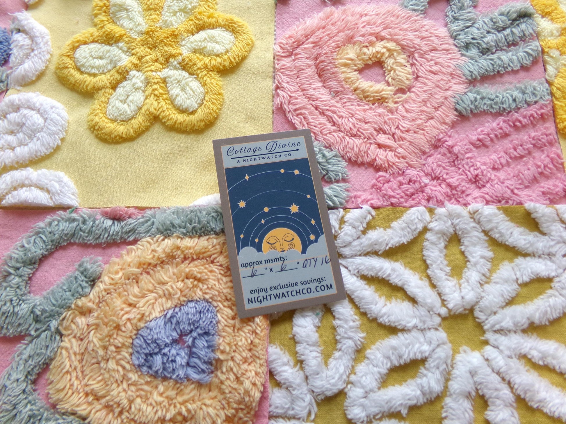 see more, cottagedivine.comOh sew sweet, this is a set of 16 vintage chenille fabric squares measuring 6" each. For this OOAK set, I chose some of my most treasured fabrics to inspire your own creativity.