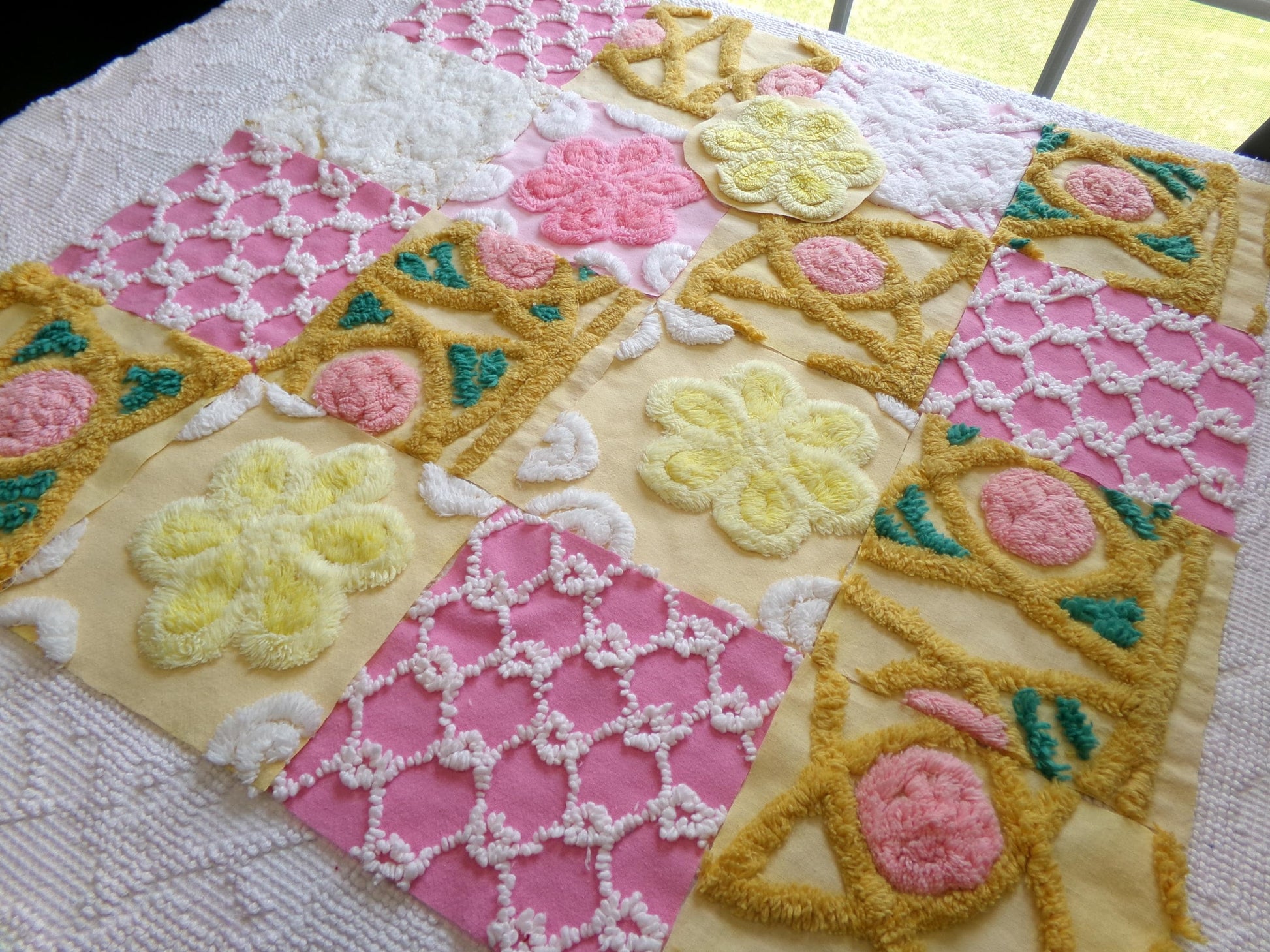 There is a lovely medley of designs in cheerful shades of sunshine yellow, old world gold, rose pink, and white. Includes a rare Bates pink chain link design, plus a cute little extra cutout yellow flower for applique work or whatever you can think of :)