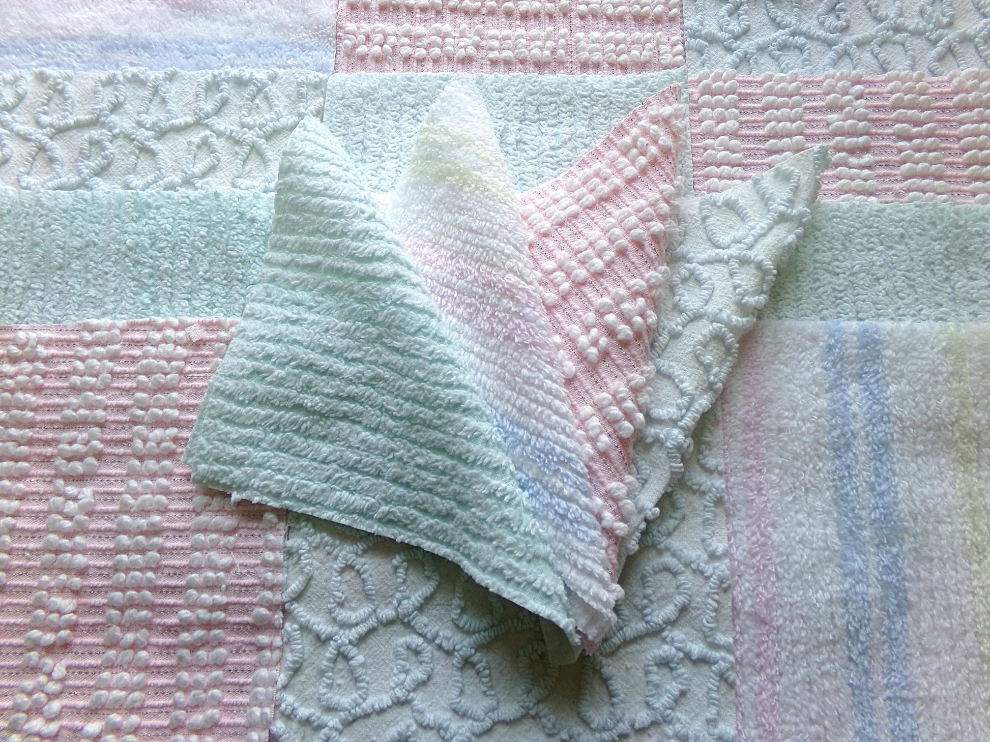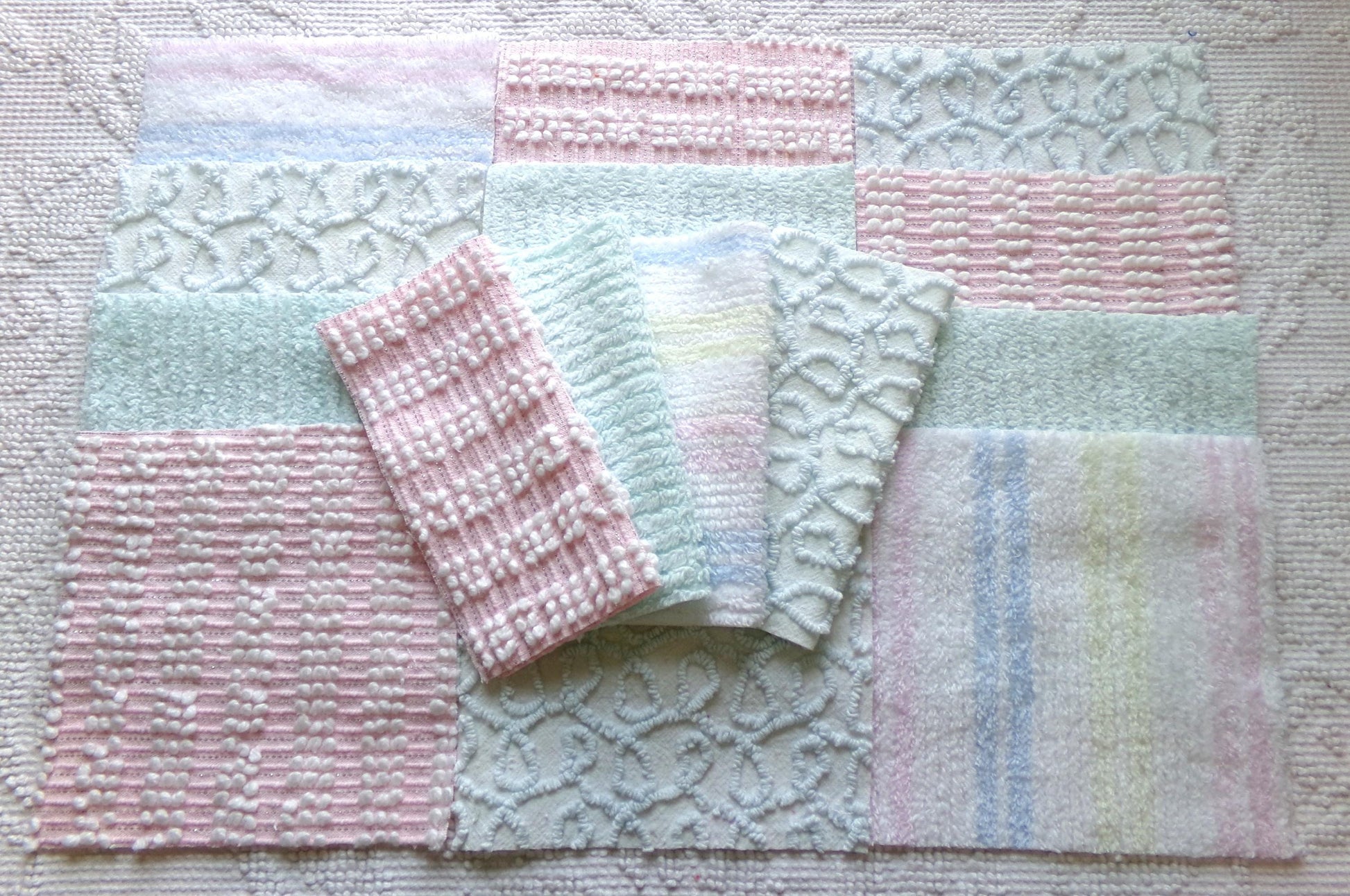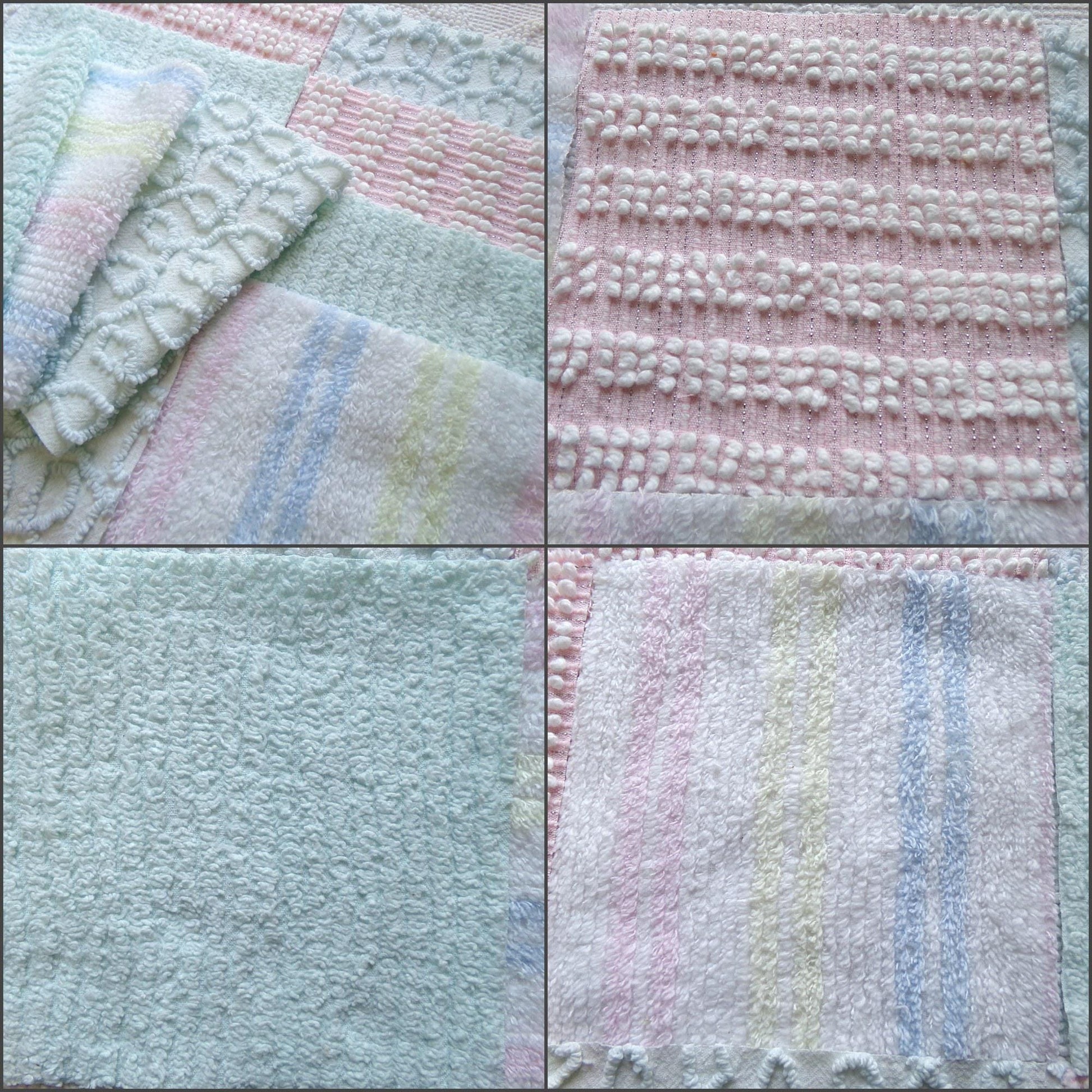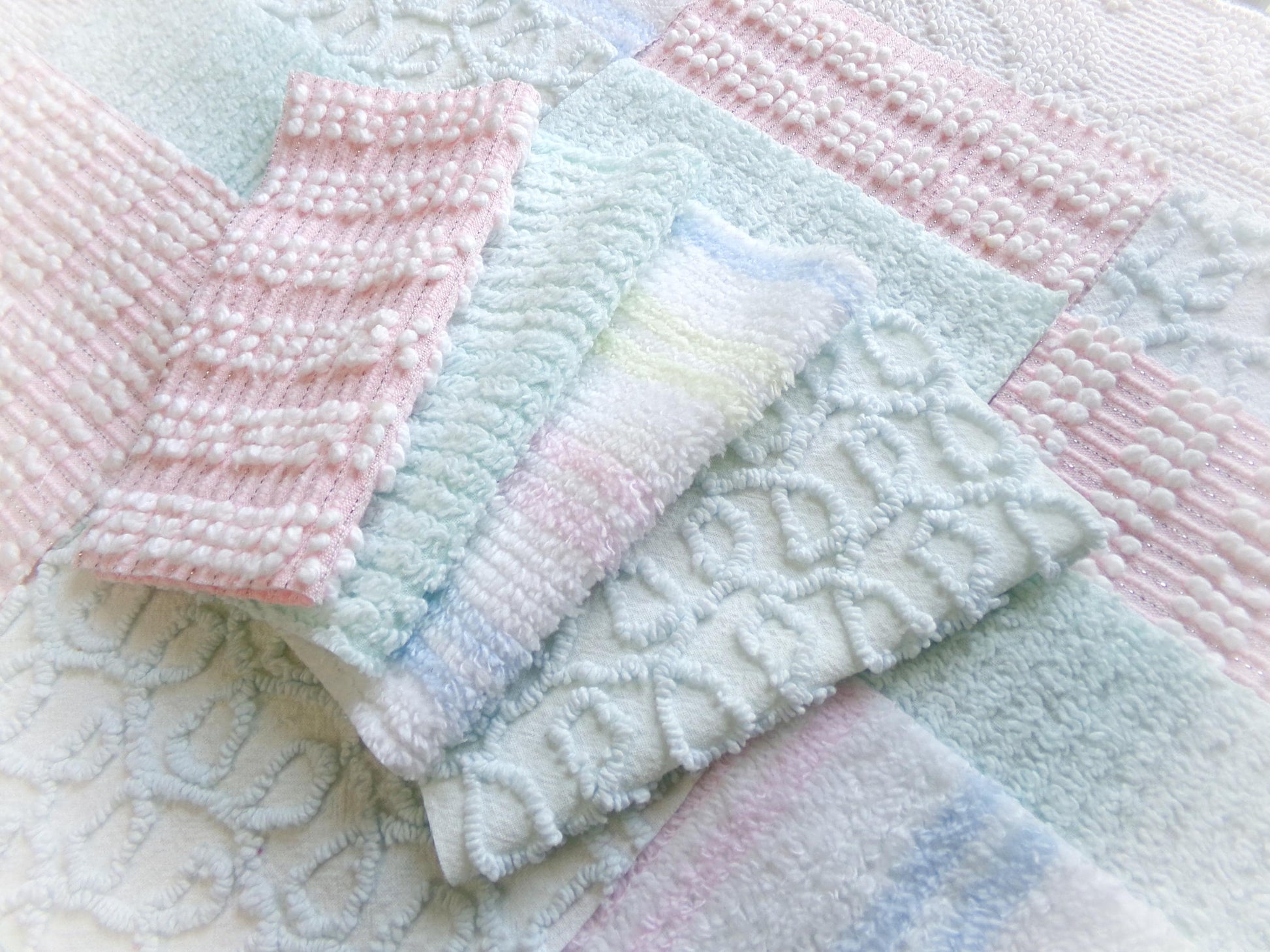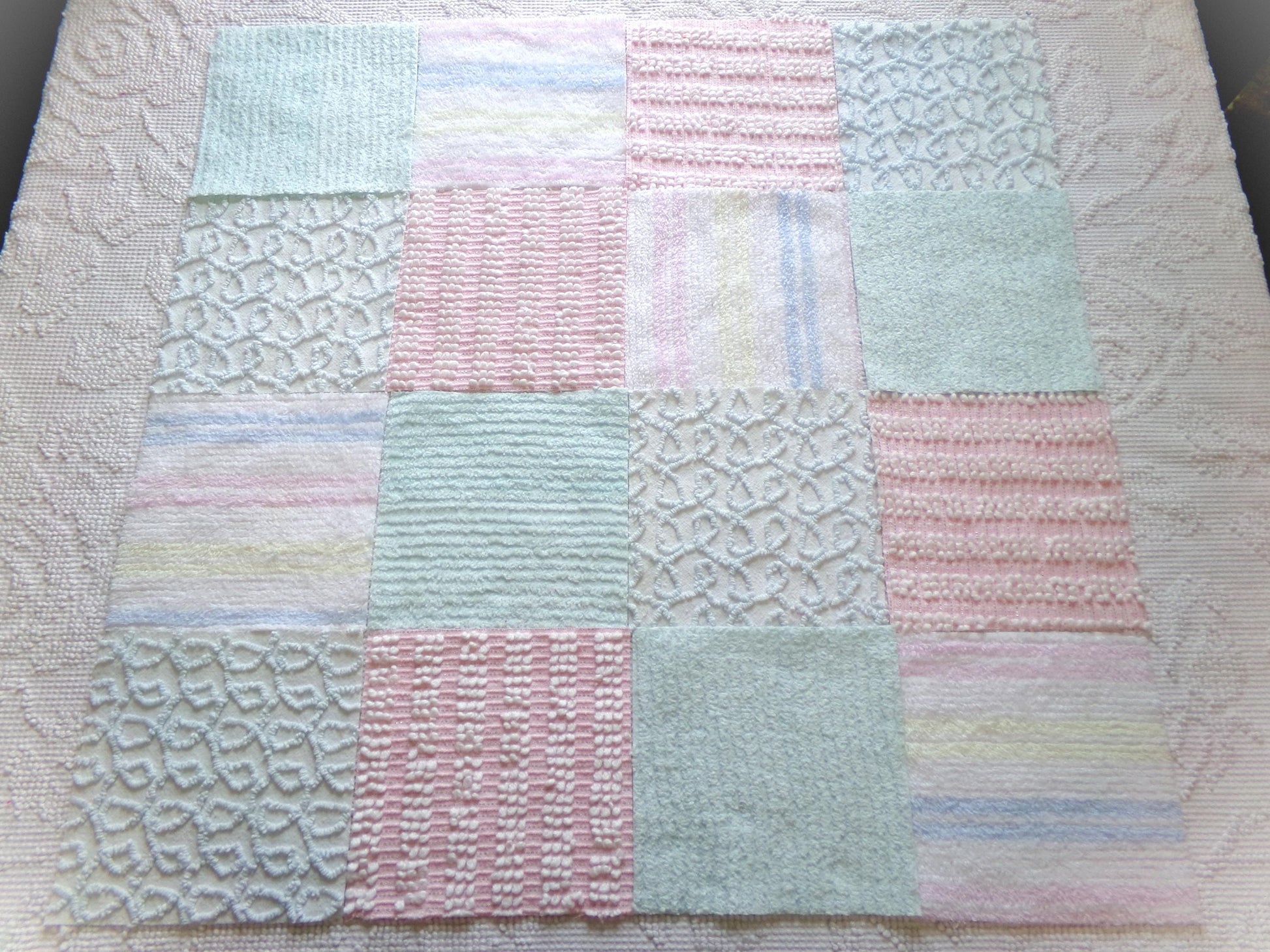 see more, cottagedivine.comIncorporate the gentle colors of a misty rainbow into your project with this set of 16 vintage chenille fabric squares measuring 6" each. For this set, I selected soothing fabric colors in a rainbow of soft shades to inspire your own creativity.