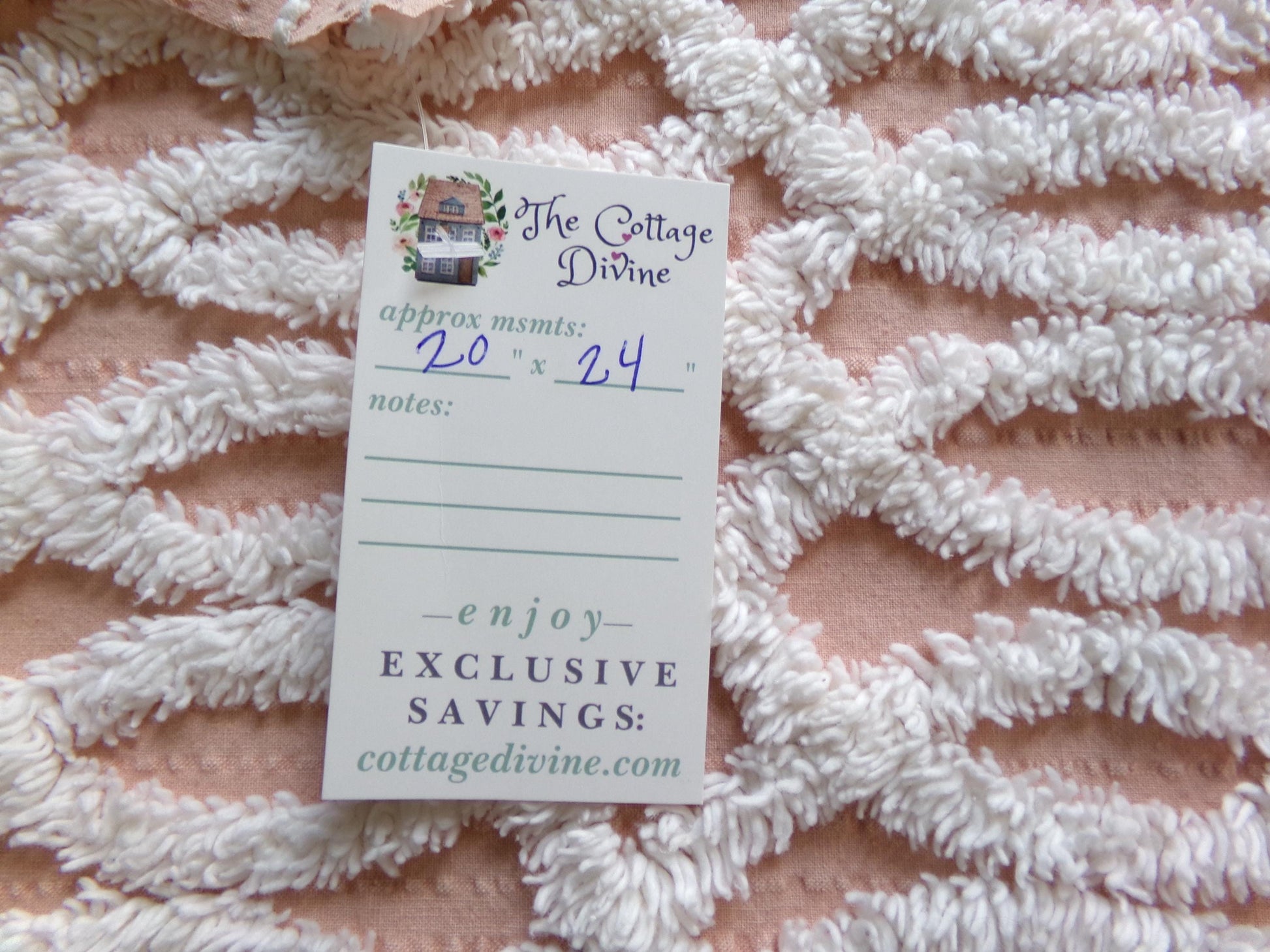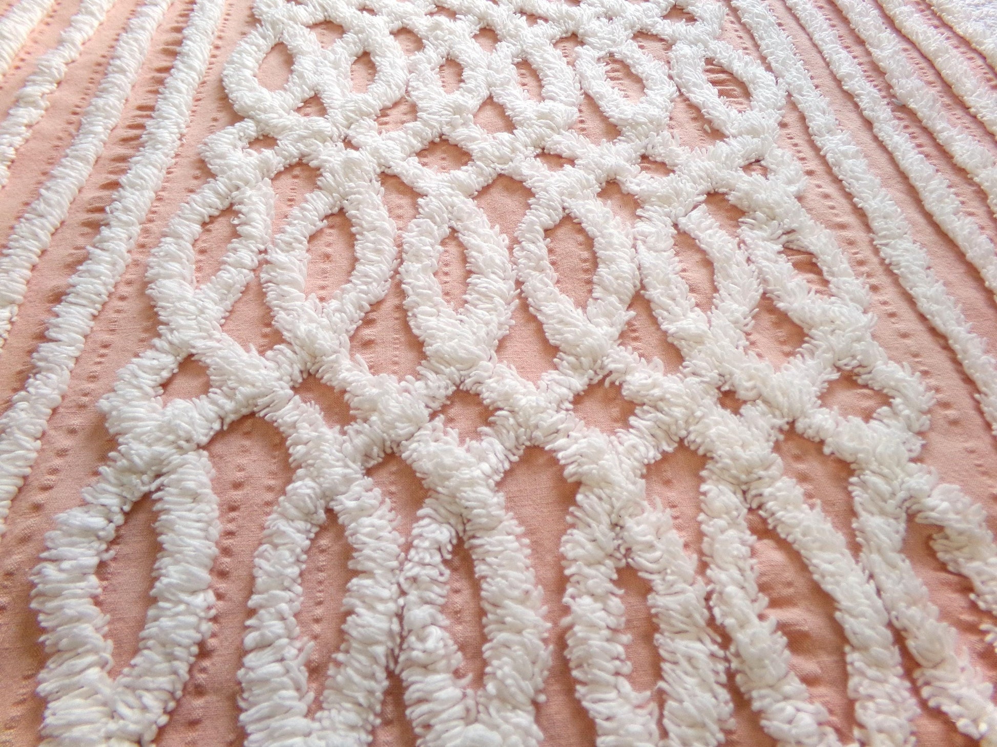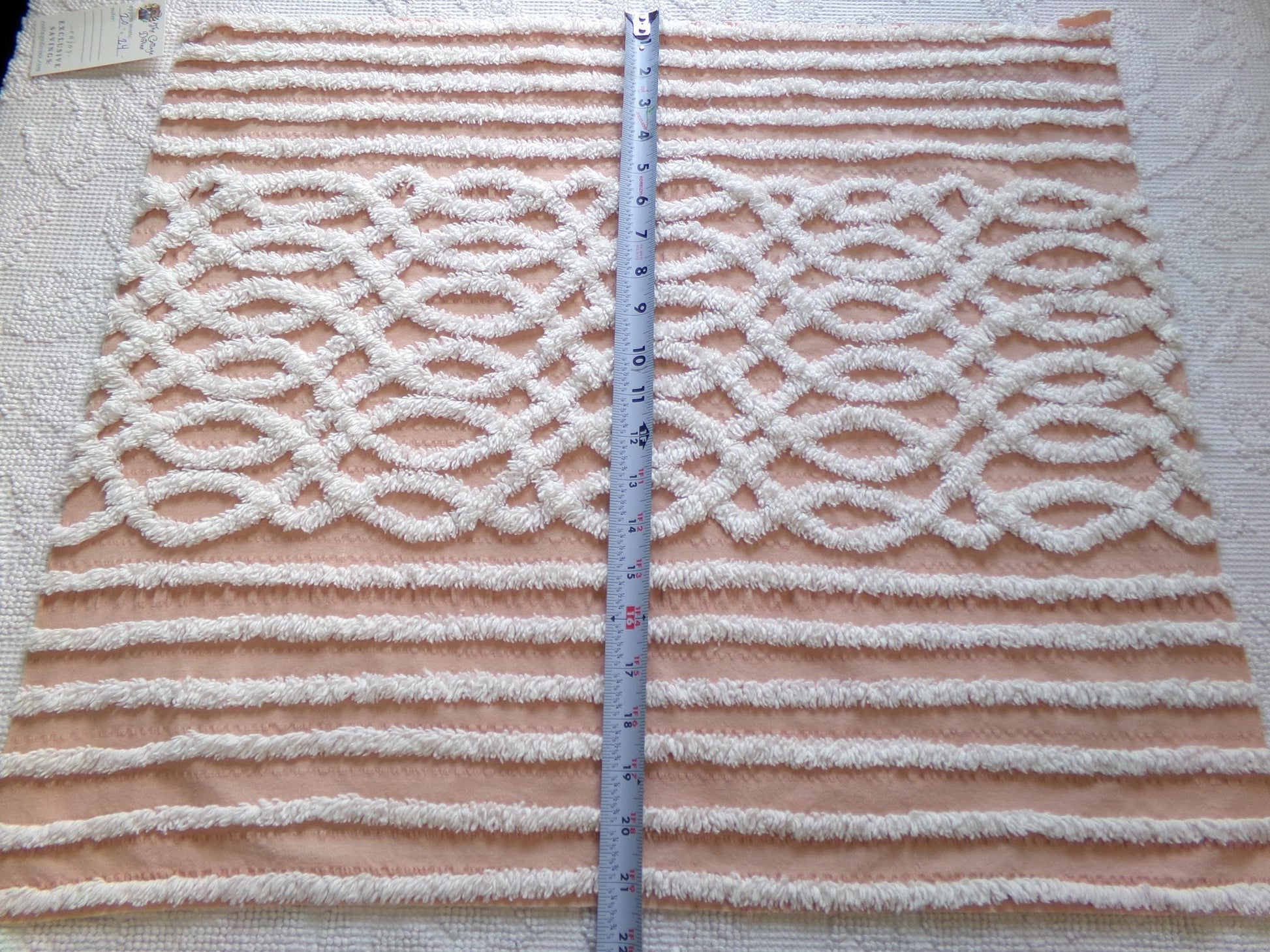 see more, cottagedivine.comPretty, fluffy chenille eternity links flanked by striped lines are tufted onto a creamy peach seersucker bkgd on this piece of chenille fabric. Excellent vintage quality fabric with that crisp cottony feel seldom seen in modern fabrics.