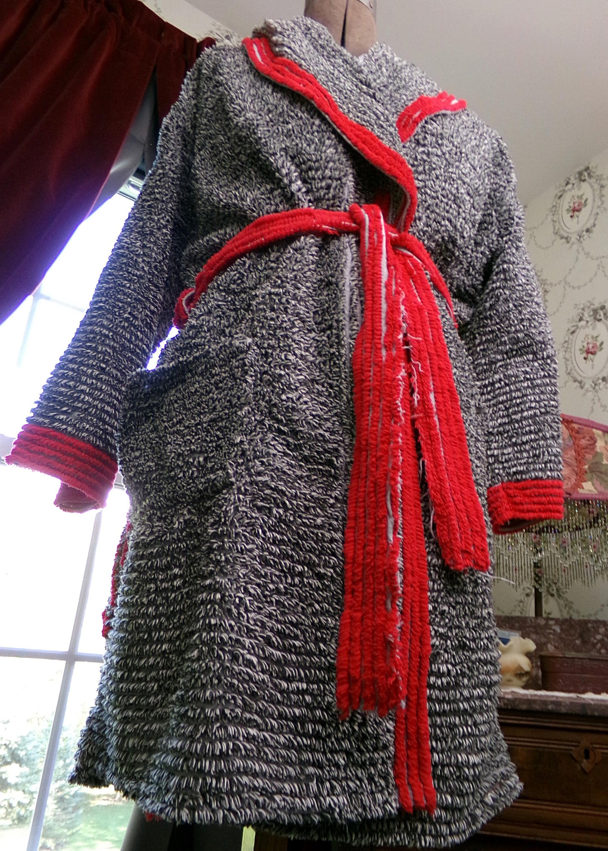Here is a shabby handmade vintage short chenille robe / coverup with a bold peacock situated prominently on the back. The design is set on a salt and pepper black/white bkgd, accented with red tufting at the wrists, shawl collar and belt tie.Original to the 1940s in pre-loved vintage condition. 100% cotton. Significant fray to belt as seen final img. Remember this was handmade decades ago & is not "factory perfect" by any means.