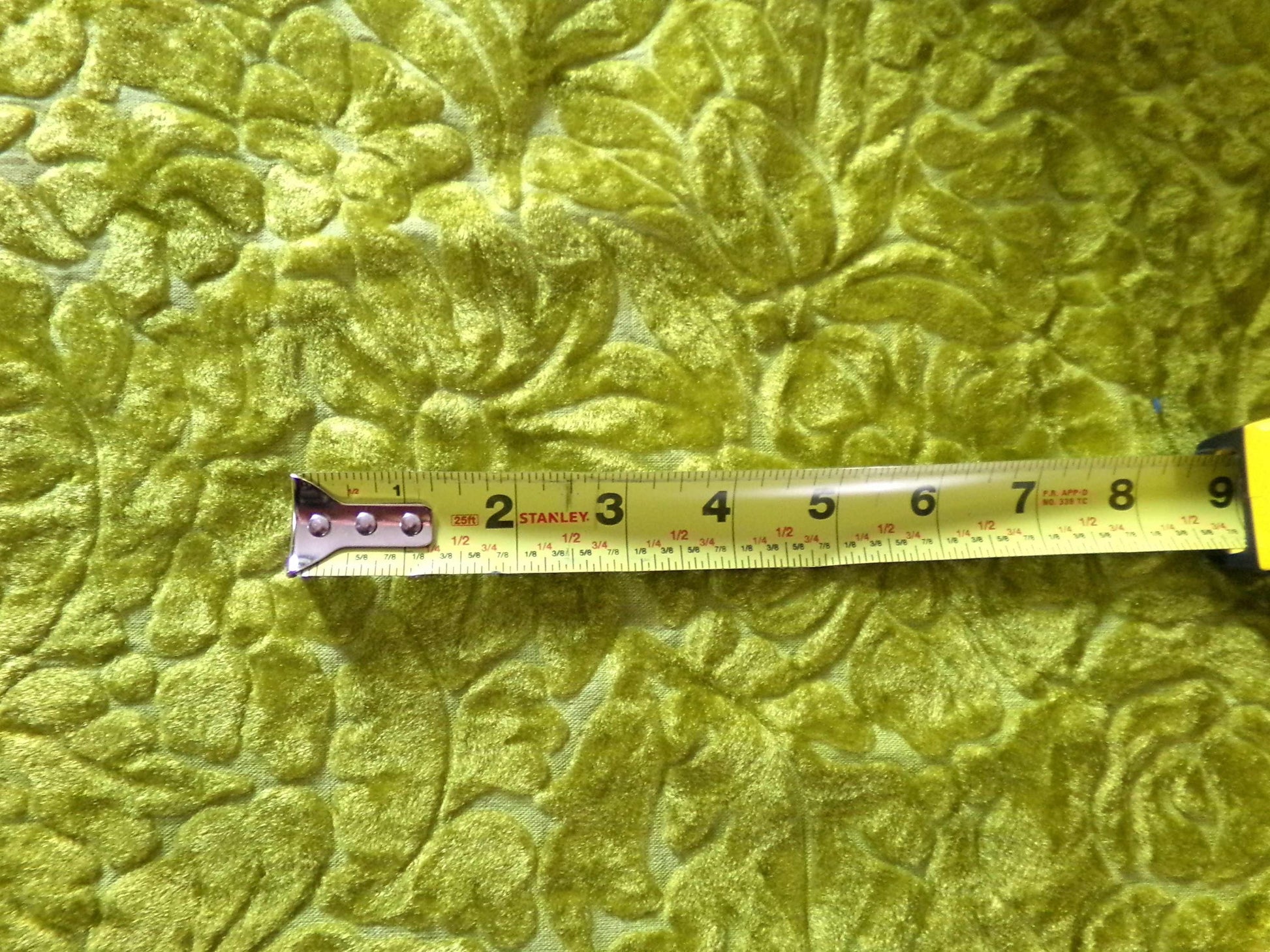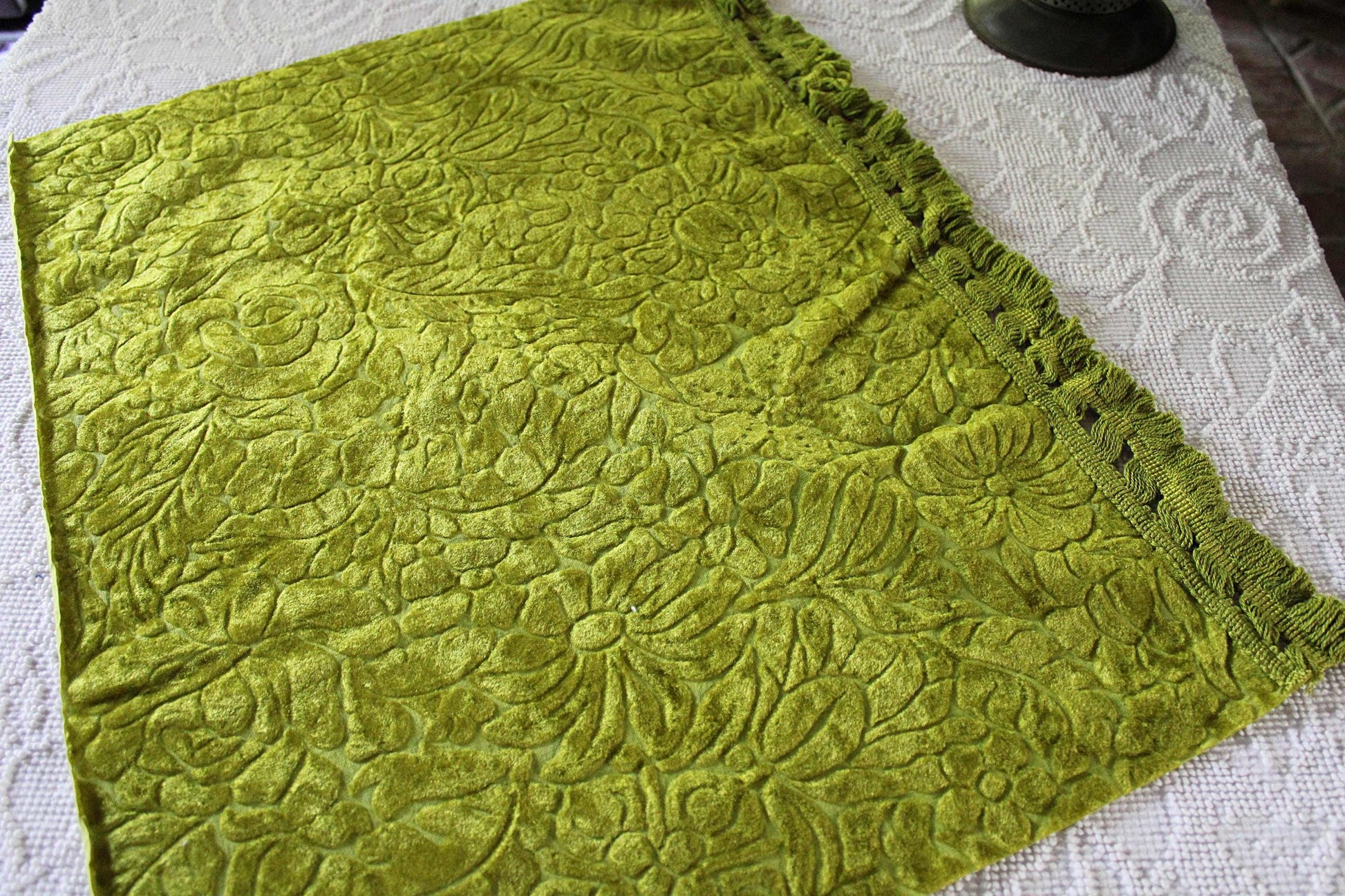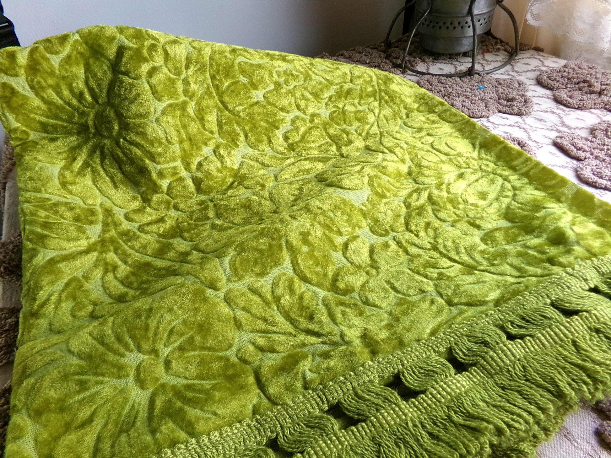 This beautiful cut velvet fabric piece has been sourced from a NOS vintage bedspread, kept treasured away in storage for more than 30 years...If you're looking for a piece of vintage cut velvet that stands out with memorable color, this is that fabric.Approx 24" x 18" piece. Traditional raised cut velvet florals dazzle in what I would call a green shade with golden undertones and a gentle sheen/shimmer to the sculpted florals. Very 1960s vibes.