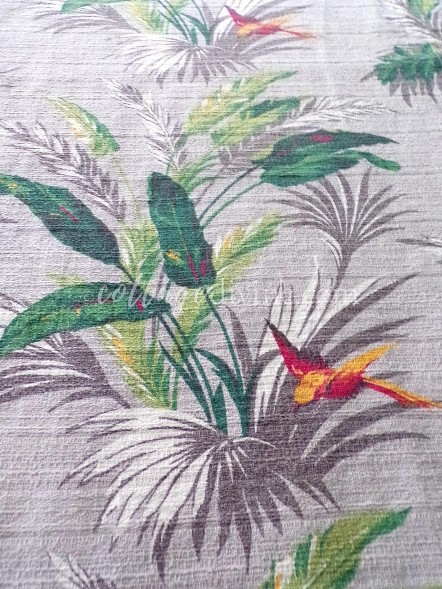Amazing original vintage barkcloth fabric featuring a repeating motif of tropical hummingbirds in flight. At approx 19" x 39" inches, this could be re-envisioned into beautiful pillows, totes, or even wall art.Salvaged from an original barkcloth curtain panel, so you'll see a hem along the side as shown. Few light marks. Colors remain vibrant, with a striking steely grey bkgd.
