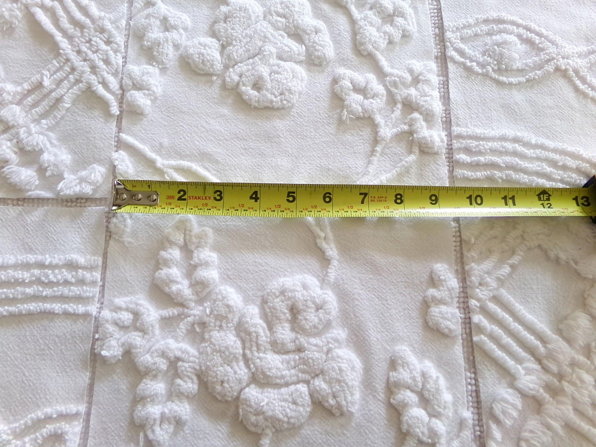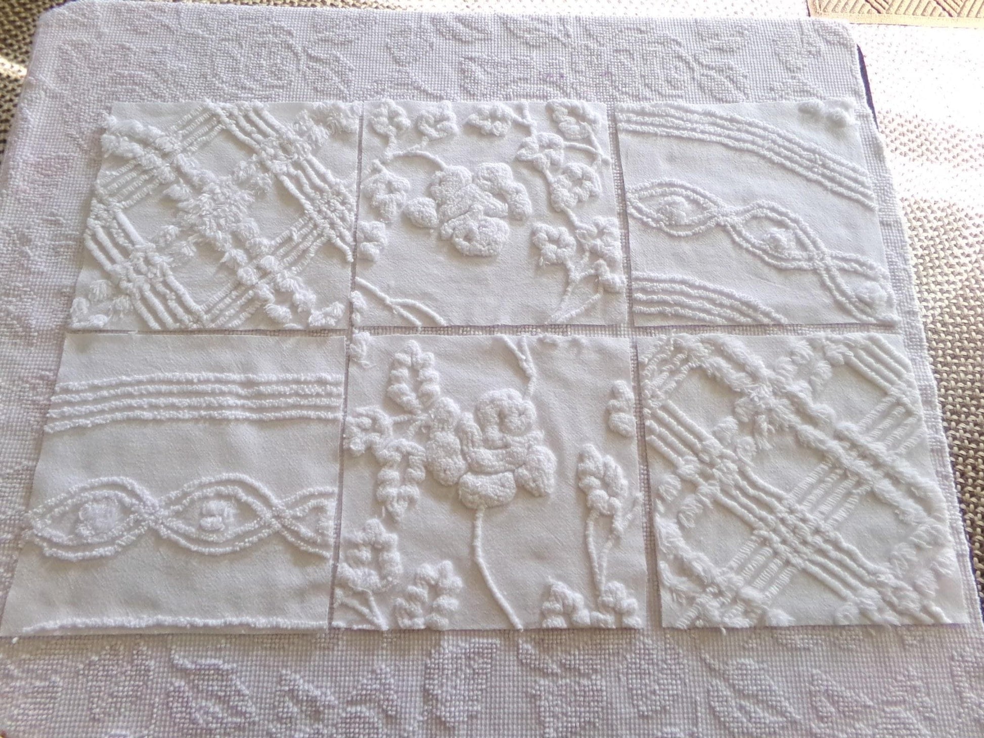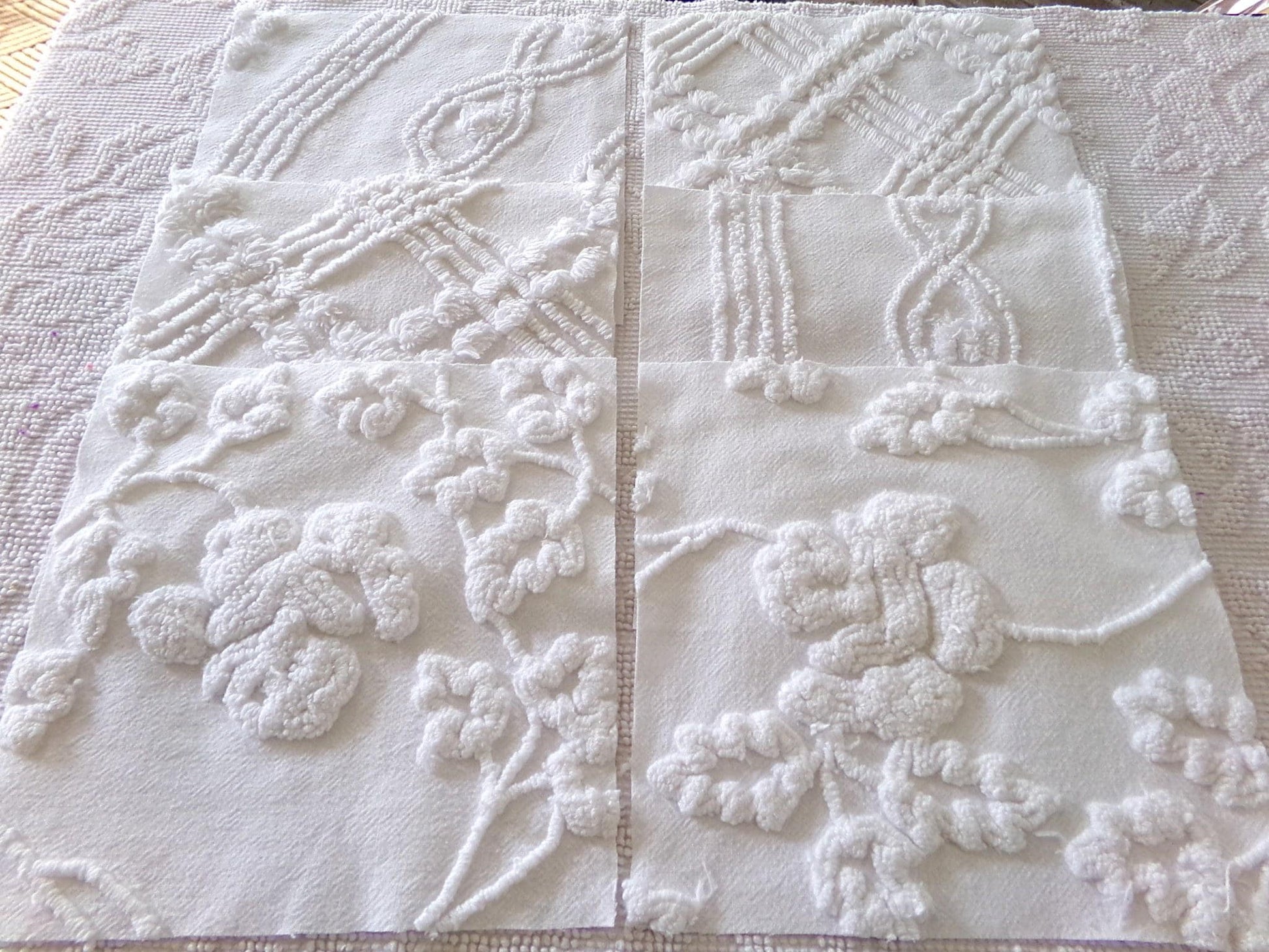 I selected classic, all white chenille fabrics to assemble this set of beautiful quilt blocks, which measure about 9.5" x 9.5" square each. Included are two exquisite tufted rose squares which lend timeless elegance to any creative project. A versatile set of chenille fabric squares, in a nice larger size versus the smaller 6" squares we typically offer.::total qty: 6 vintage chenille quilt squares