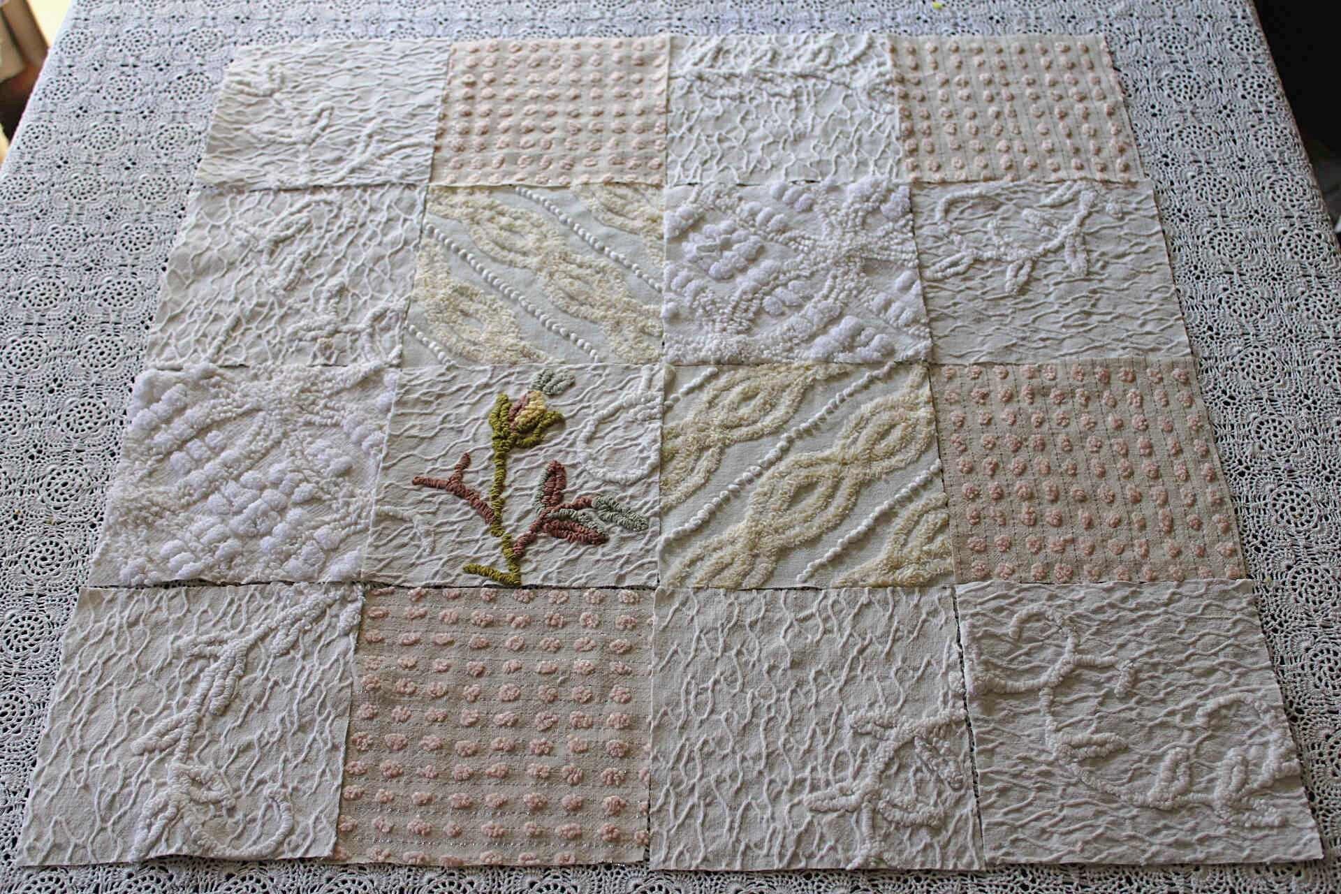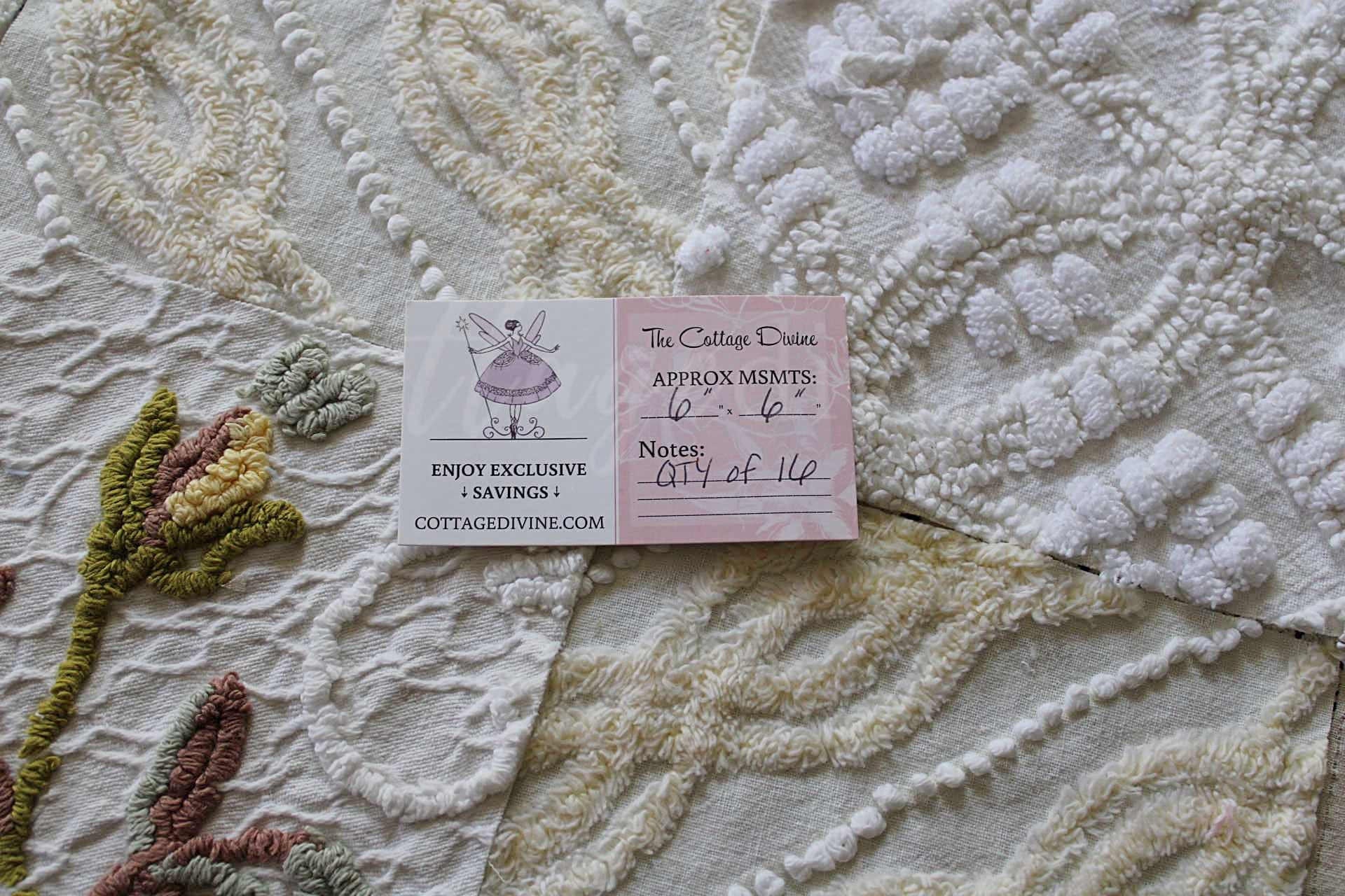 Give your project a gentle, heavenly glow with this pretty set of fabric squares, in a premium mix of matelasse and chenille. The matelasse squares, including the single rose block, were sourced from a beautiful old Retrac bedspread::total qty: 16 chenille quilt squares::size: 6" x 6" rotary cut