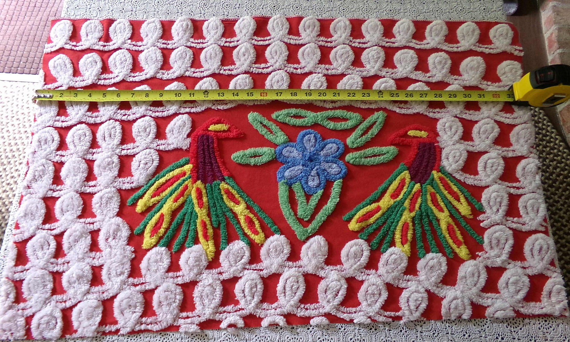 Impossibly fantastic piece of vintage chenille fabric featuring a pair of offset peacocks on vivid red, with a beautiful blue tropical floral situated between the lovebirds. *Note that the peacock motif is offset on the fabric, not centered.Fabric piece measures approx 31" x 20" inches. Original 1950s-60s era cotton chenille fabric composition, easy to sew with. An excellent piece for pillows or even to incorporate into chenille quilts or a wallhanging.