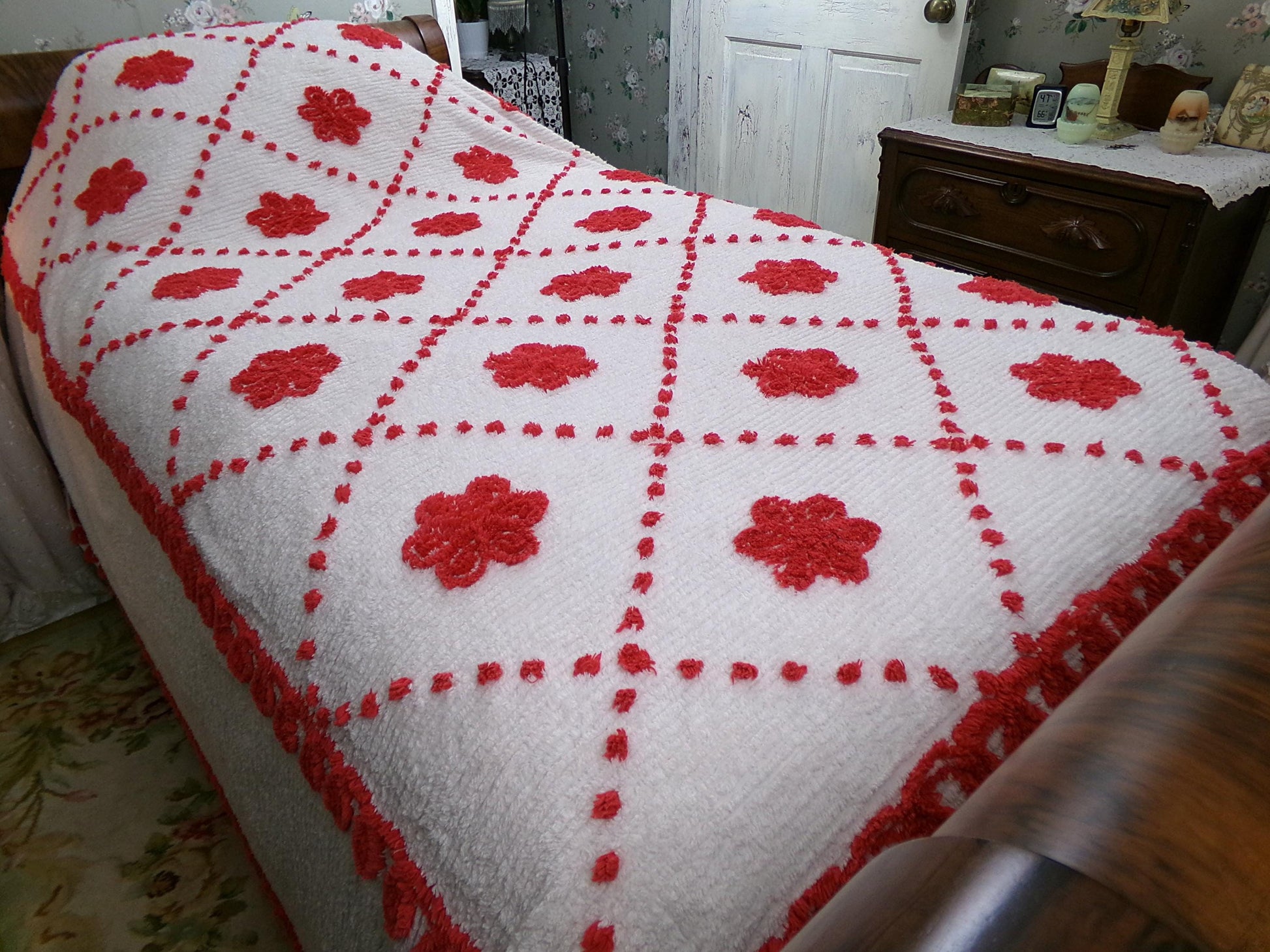 see more, cottagedivine.comCute, whimsical red rosette flowers pop out against a white background on this full size vintage chenille bedspread. Red sprinkle dots add a sweet accent, and curlicue piping along the edits frame the entire design.