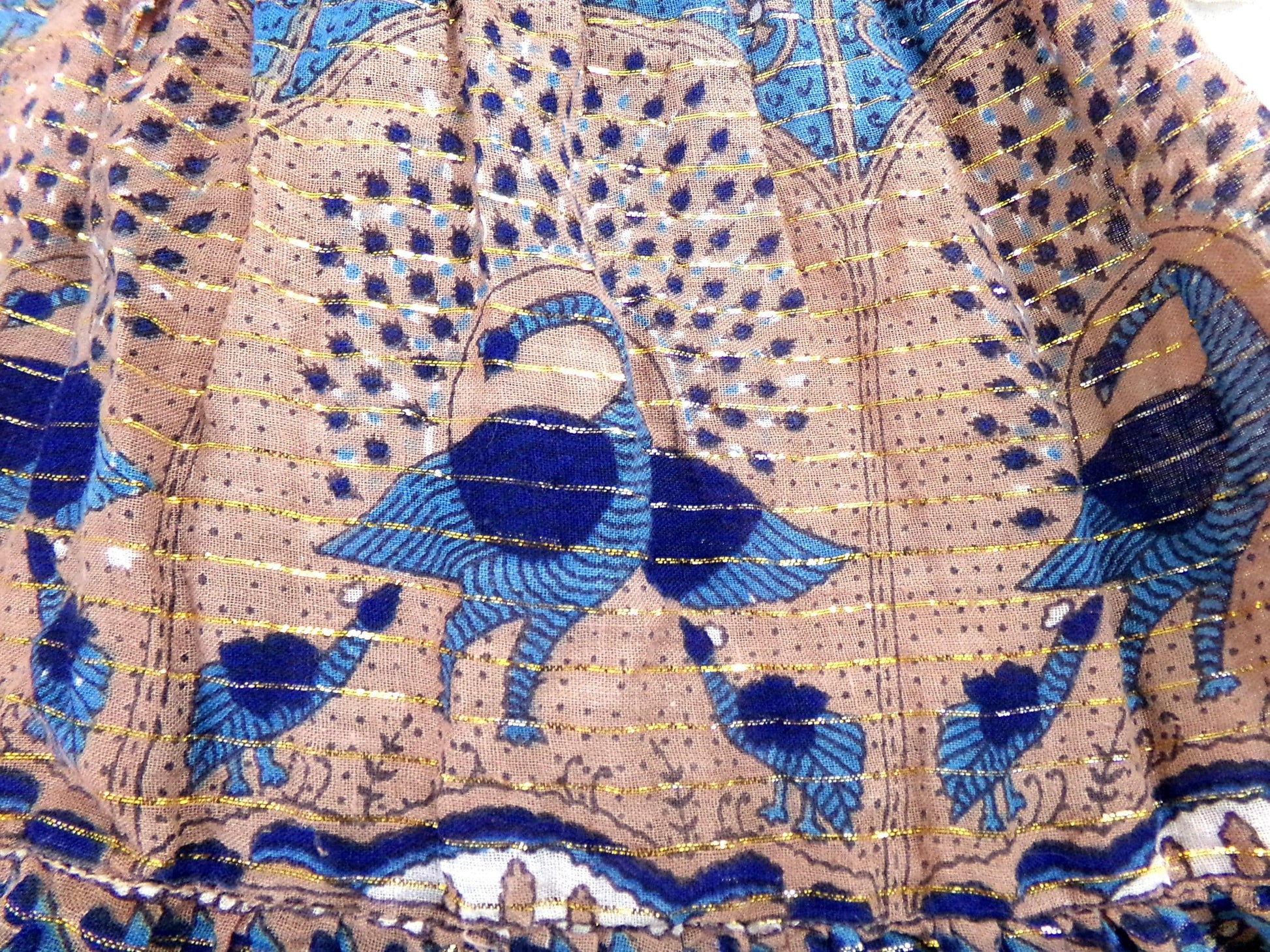 Time travel to over a half century ago when you slip into this rare, early Starina Creation Paris dress from the 1970s era. It features an exotic floral pattern with golden thread running throughout to give a little sparkle 'n glow when you twirl around. And those fabulous peacock designs...if you appreciate true 70s style, this is a true treasure.Nice billowy airy fit in a lightweight semi sheer gauzy cotton. The dress still bears both its original tags: the Starina brand tag, plus the size and care tag. Tagged a vintage M, better fit on XS or S: 34" bust // free hips because of design // 38"L from bodice down // 13" shoulders flat across // shoulder tie straps.