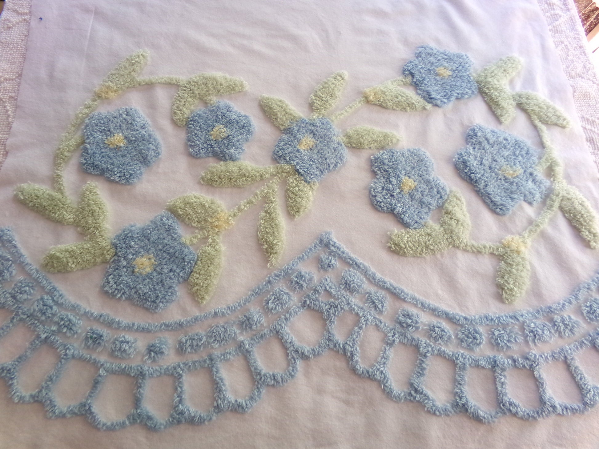 Blooming blue flowers adorn this lovely vintage style chenille fabric piece, accented by ruffle dot tufting along the bottom edge. An easy, effortless way to incorporate breezy cottage style into your design.Measures approx 25" x 27" inches. 100% lightweight cotton. Ideal incorporated into DIY pillows, handmade chenille quilts & more.