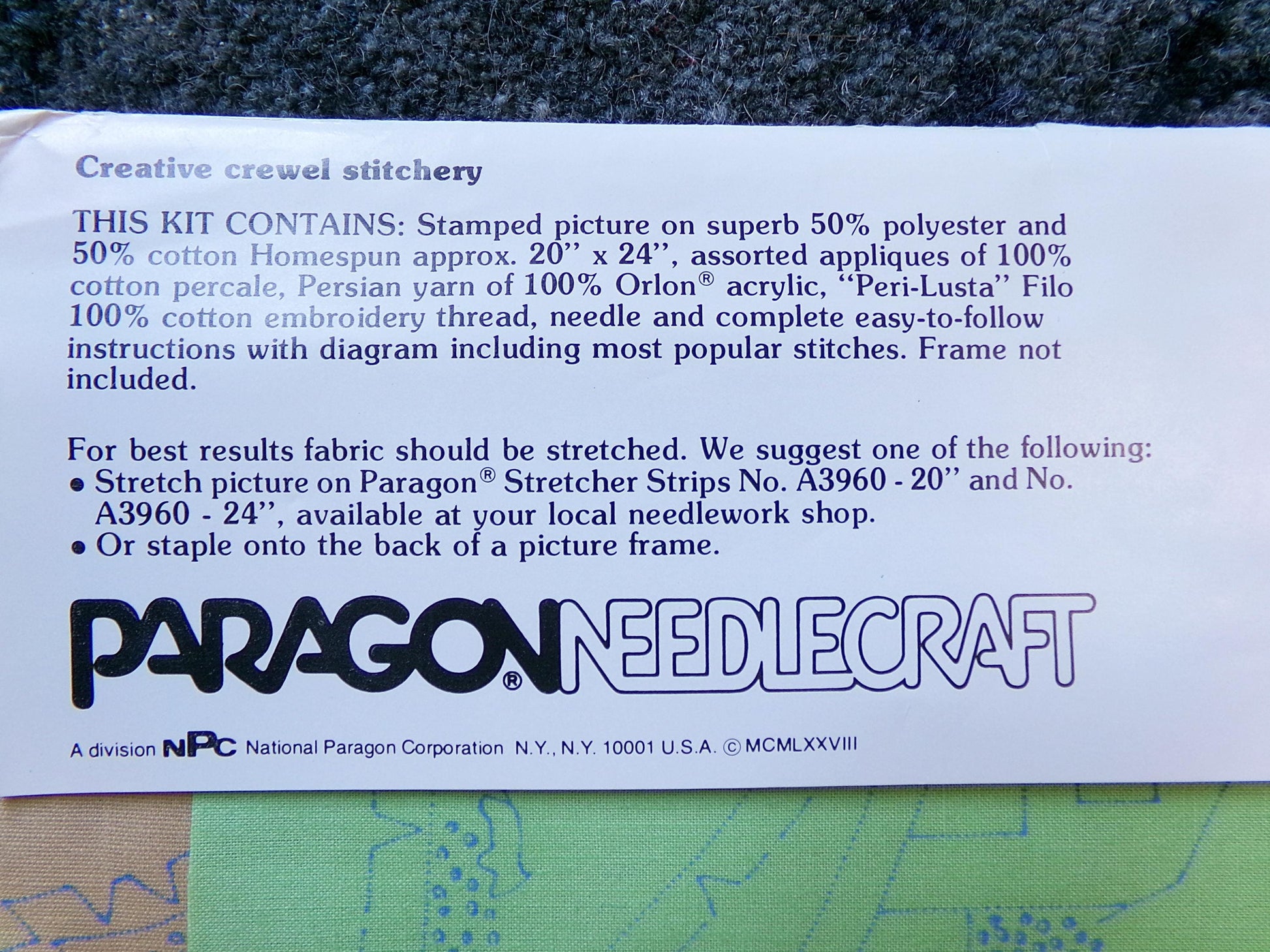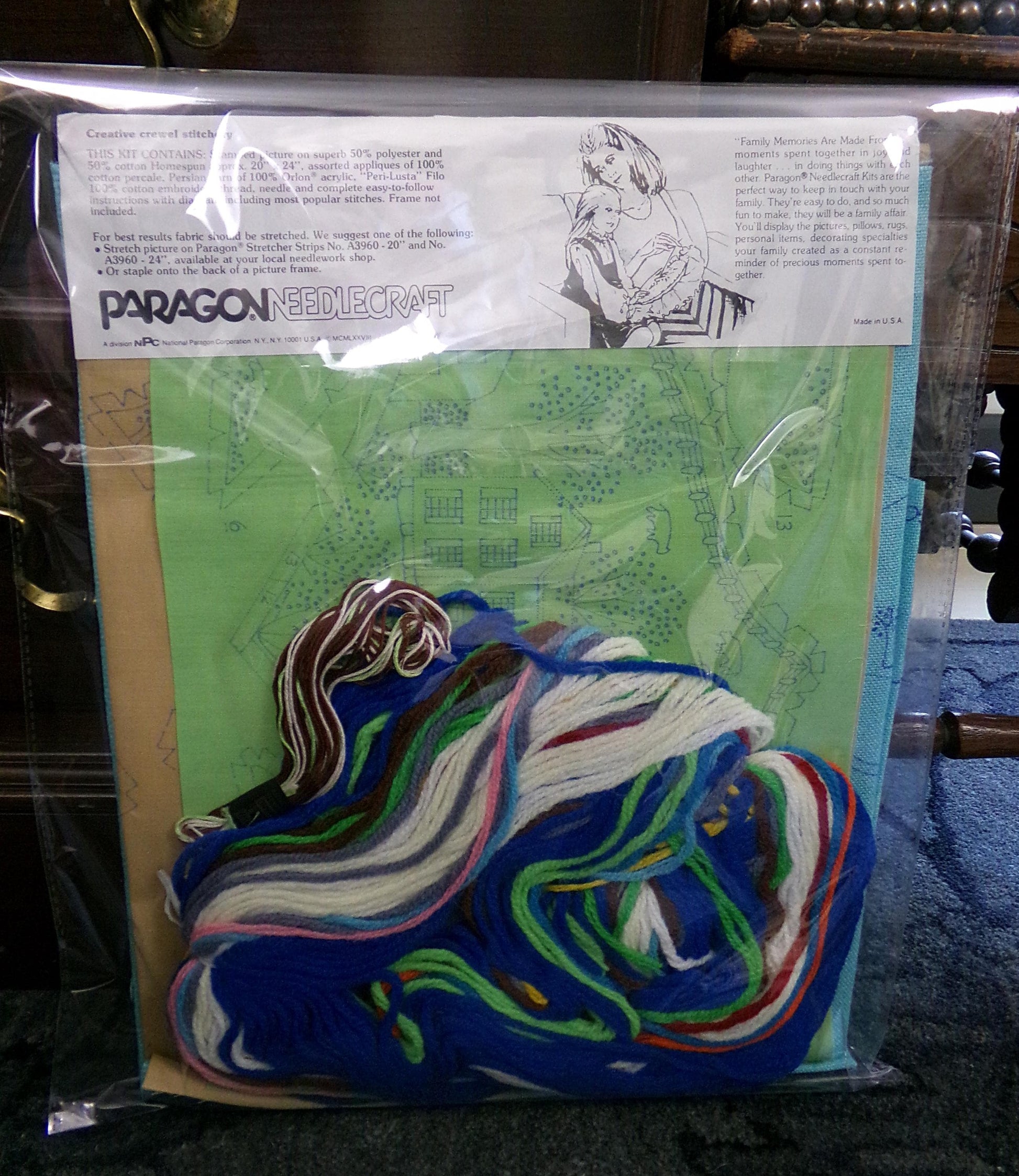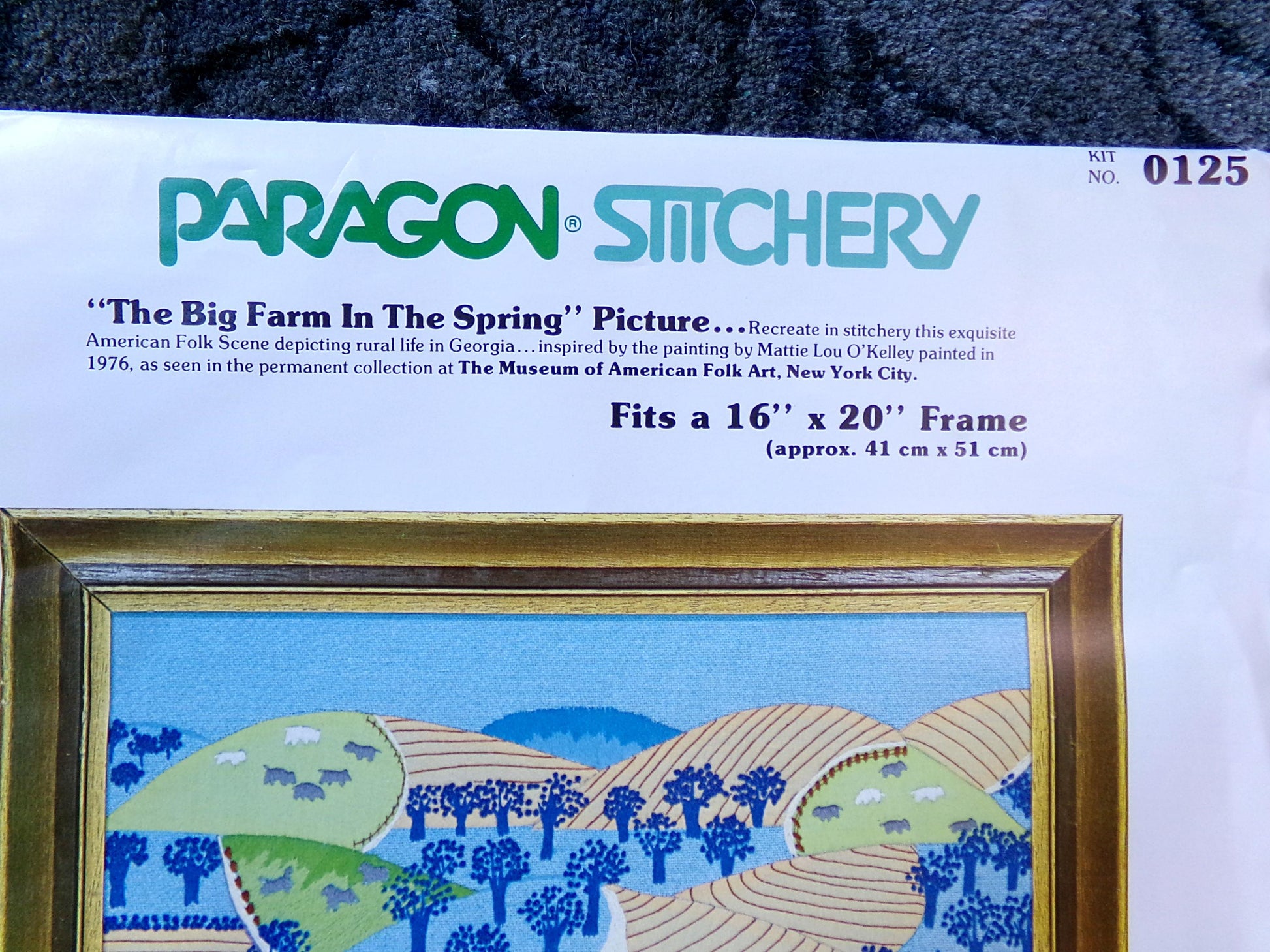 "The Big Farm in the Spring" ... "Recreate in stitchery this exquisite American Folk Scene depicting rural life in Georgia...inspired by the painting by Mattie Lou O'Kelley painted in 1976, as seen in the permanent collection at The Museum of American Folk Art, New York City."• Paragon Needlecraft Kit #0125